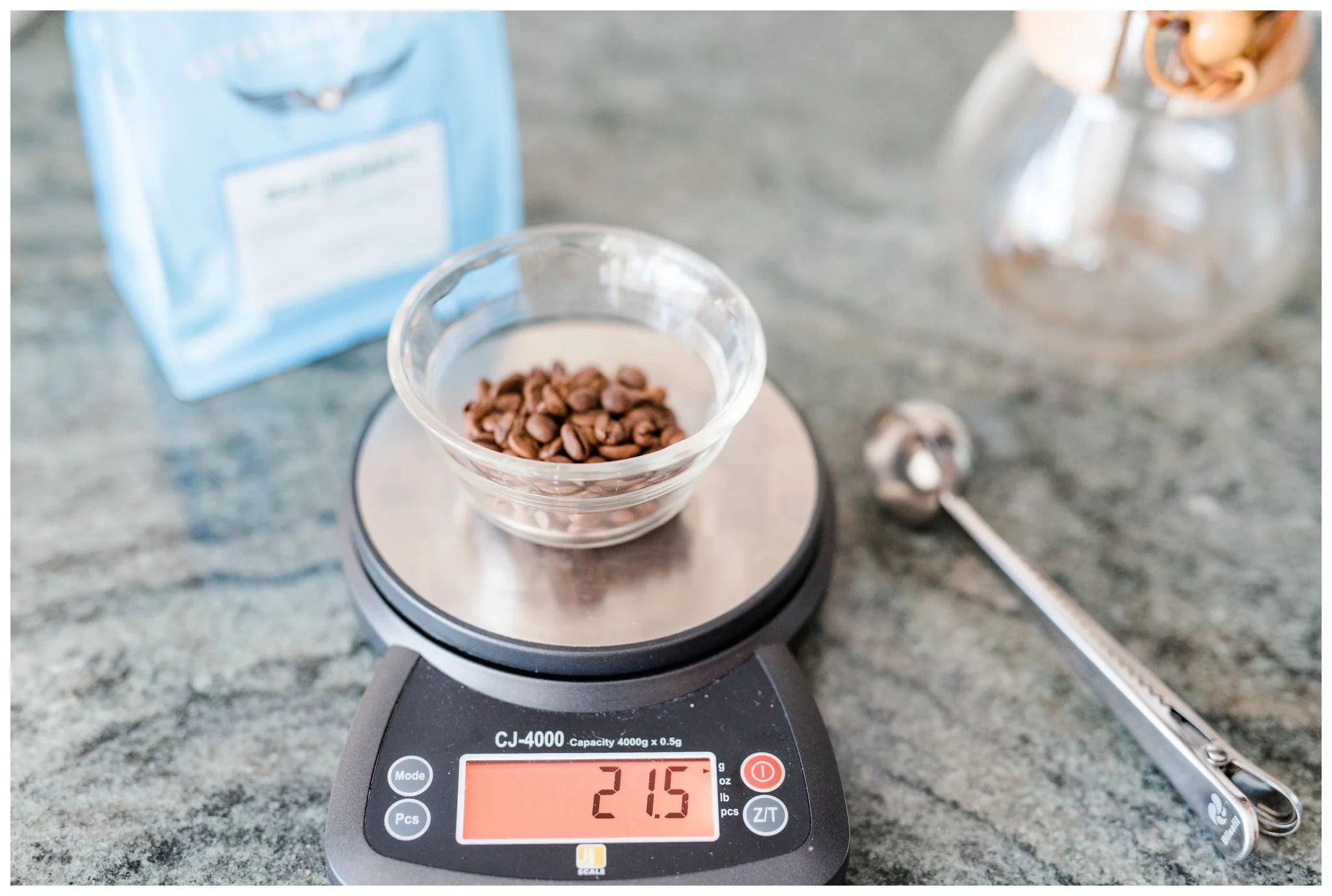 So here is a photo of our arsenal! The scale, the scooper to measure out the beans, the grinder is in the background. We actually have a really fast electric one but I just used this one today because it is easier to photograph (this is a hand one which is a little tough to use for me to use). The kettle on the right is awesome to do pour overs with because you can control the amount of water coming out. You really want to pour nice and slow.  The carafe is in the middle and the filter is placed on top.