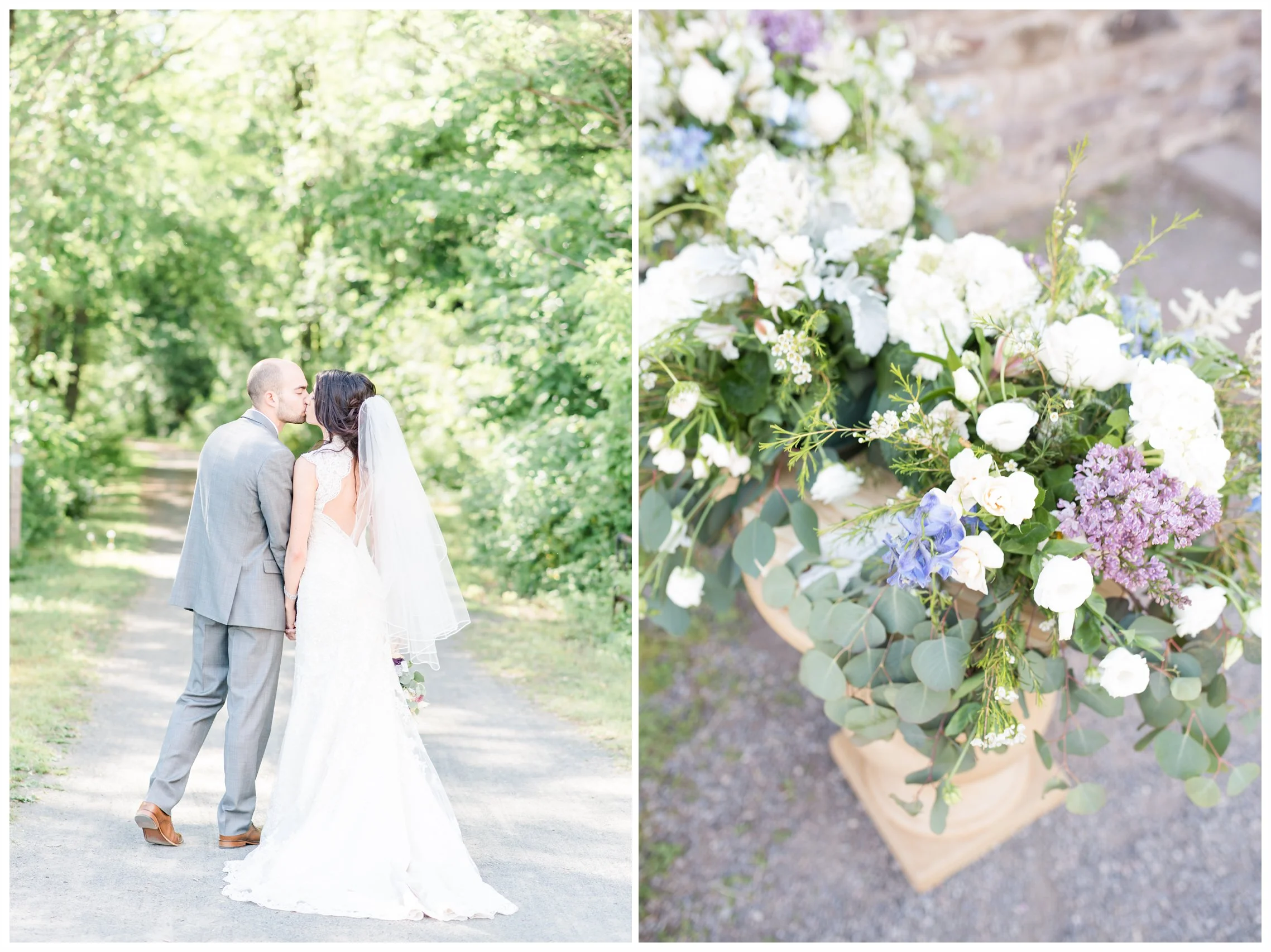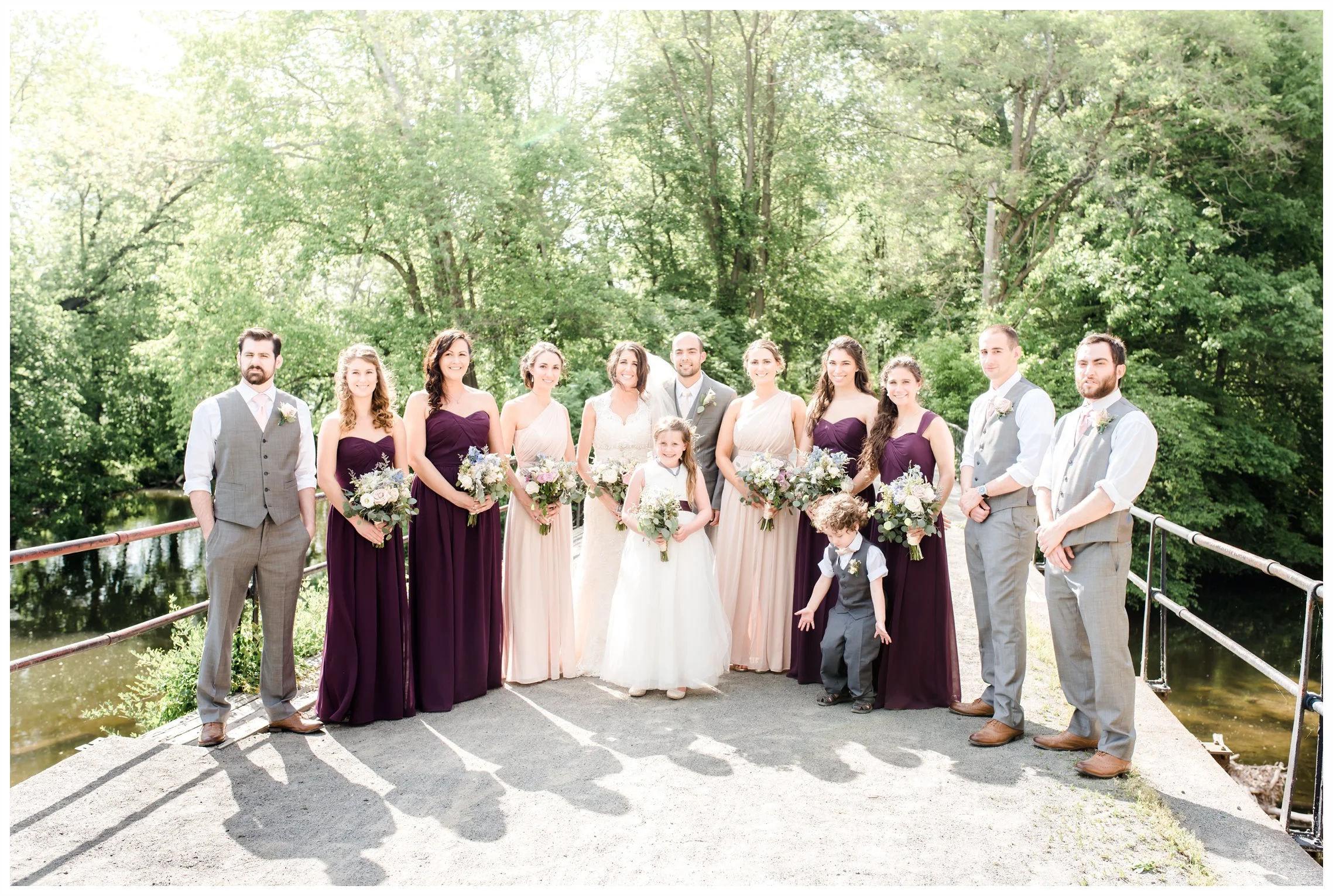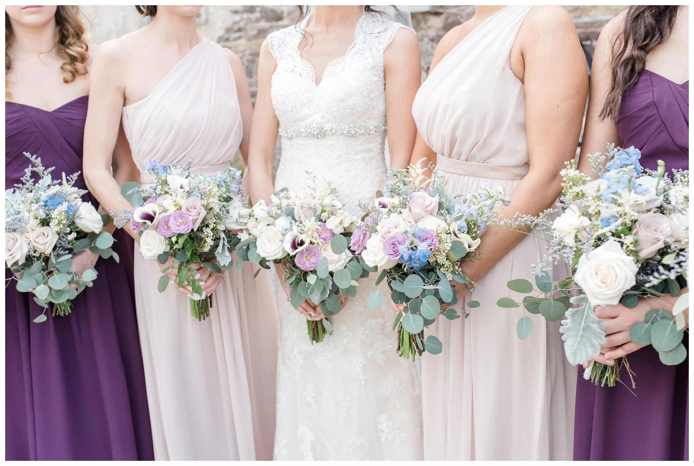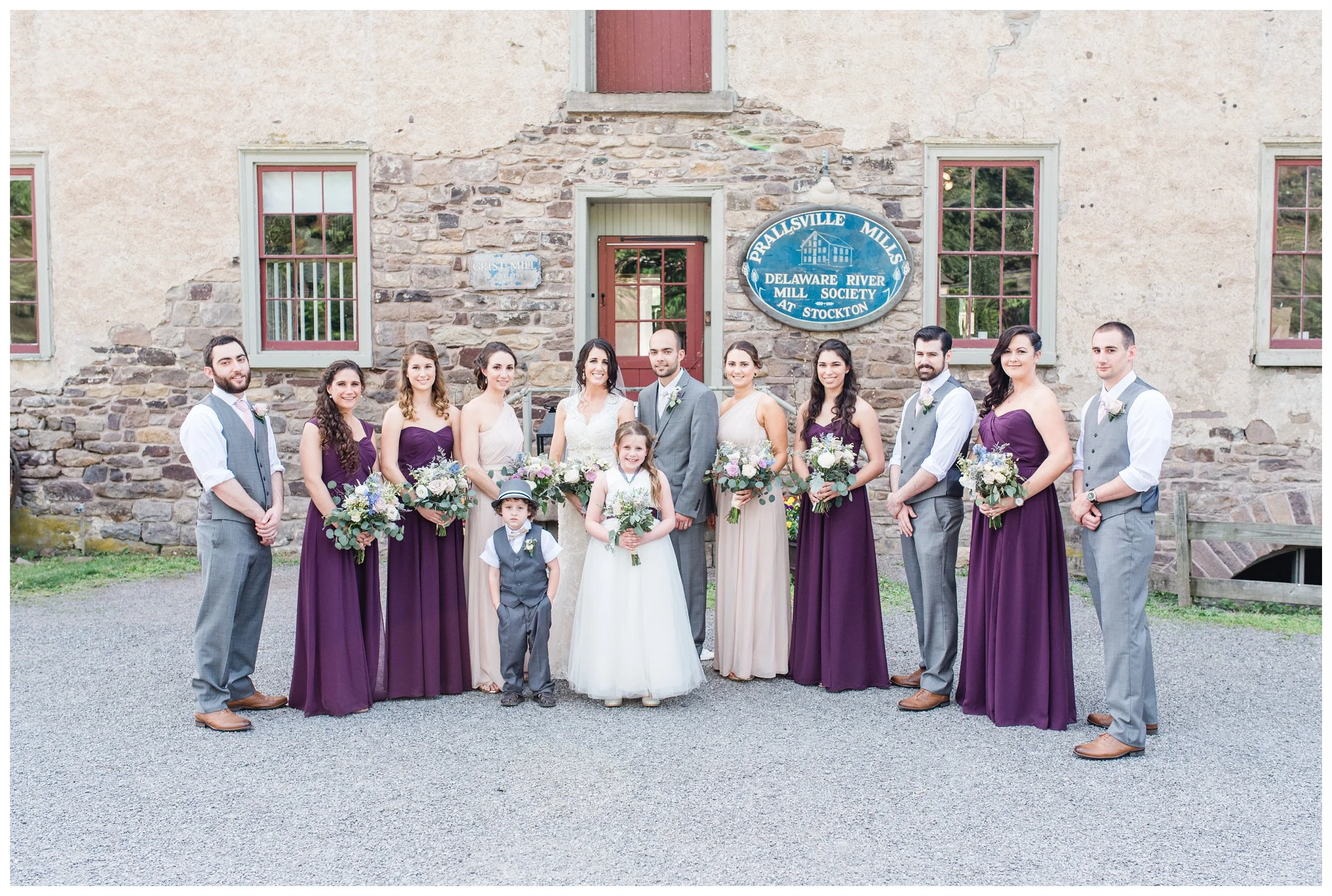 One of the first venues that they visited was the Prallesville Mill located in Stockton, New Jersey. The mill has so much history and is nestled along a beautiful river and upon seeing it, they knew it was right. So the planning commenced and they had so many talented friends and family members to really contribute to making this day so special. Alyssa’s taste was mixed with some pretty lacey things such as her beautiful wedding gown by Maggie Sottero. The florals were by far my favorite all handmade by Donna Pratt, a close family friend. The programs for the ceremony were different shades of purple, pink and black and were handmade by Alyssa.