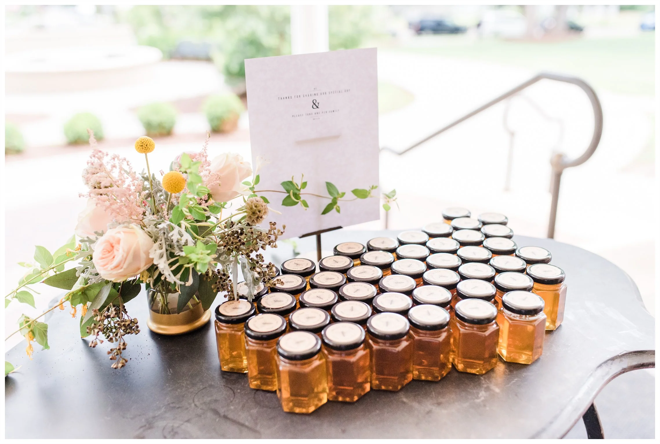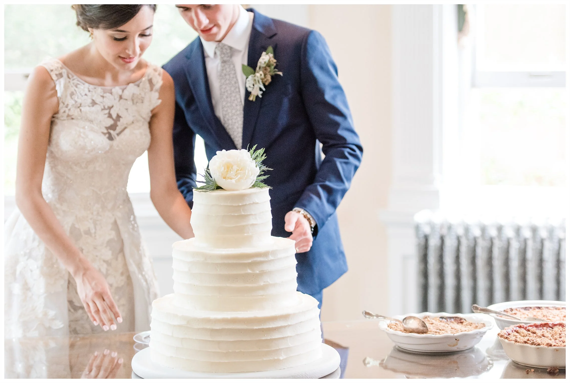 Most everything was handmade from the bouquets, to the food and all the pretty little details scattered all around the college. Their friend Susanne took charge of the catering from calculating how much of everything they would need for the reception to the ordering of the food. Colette spent hours helping to make all of the food. Their menu consisted of chicken tort, scones, honey baked hams, croissants with yummy jams and a wonderful grain free blueberry torte. Mama’s Restaurant and Cafe Baci gifted Rachel and Luke a delicious tray of fresh mozzerella, tomato and basil. Alongside of the blueberry torte sat a very lovely strawberry crumble pie. (Are you getting hungry yet?) The main course was a wonderful ham prepared by Rachel’s dad. He got up especially early to prepare and cook for the dinner. Rachel’s mom did so much of the beautiful decorations and floral arrangements accompanied by a whole group of very talented women. The flowers were purchased at Little Big Farms in Blairstown, and Trader Joe’s. Many of the flowers were actually foraged by the bride and bridesmaids.