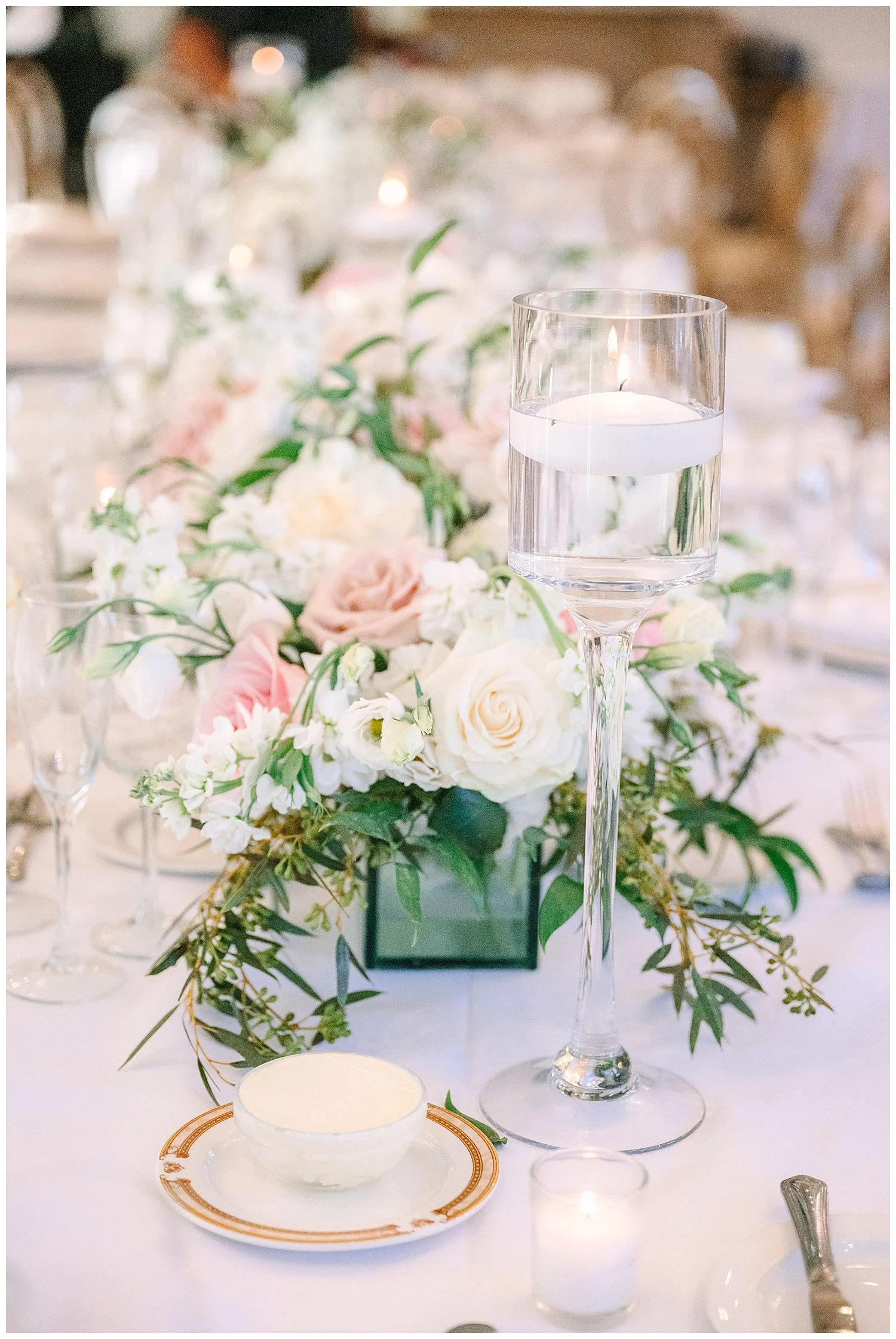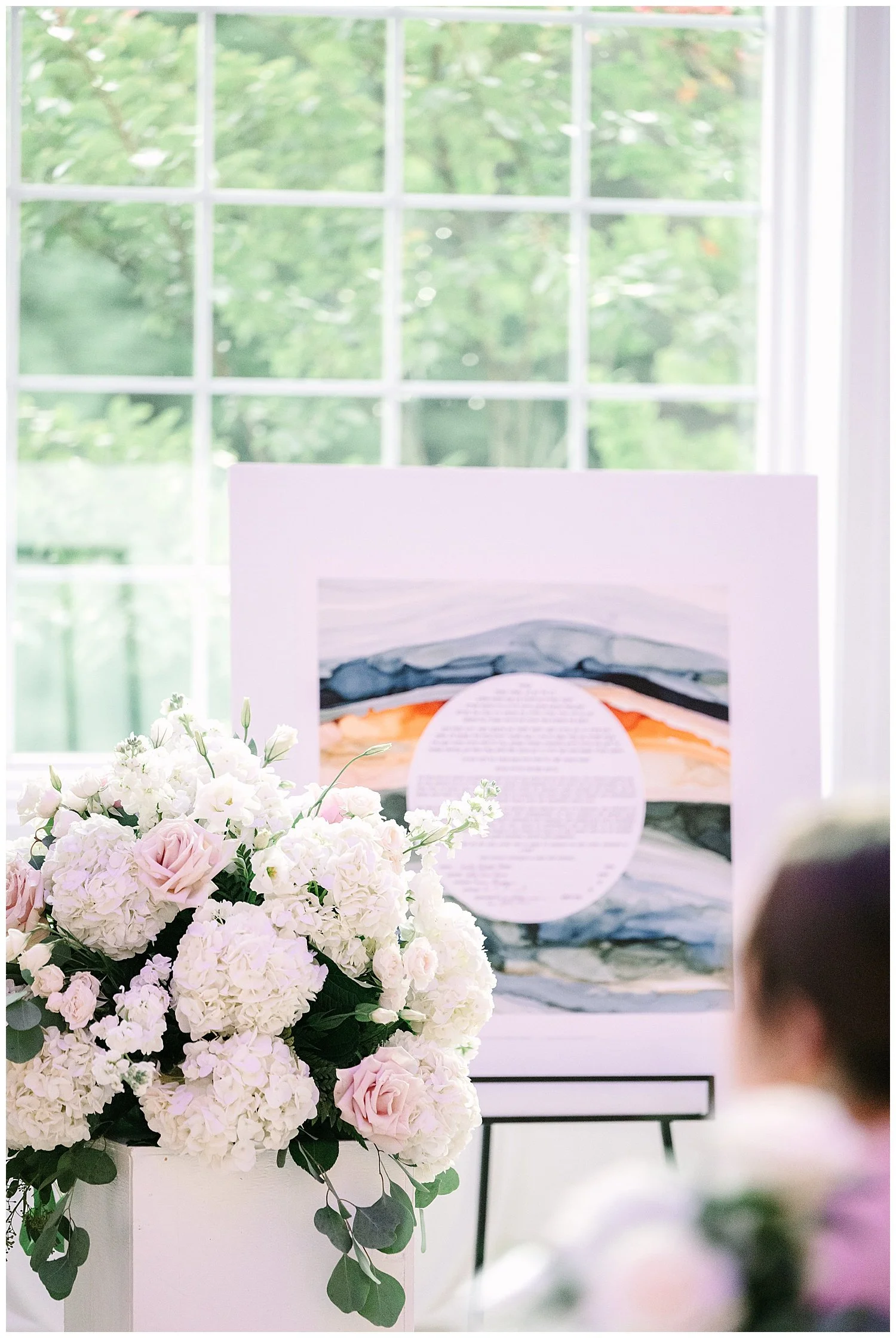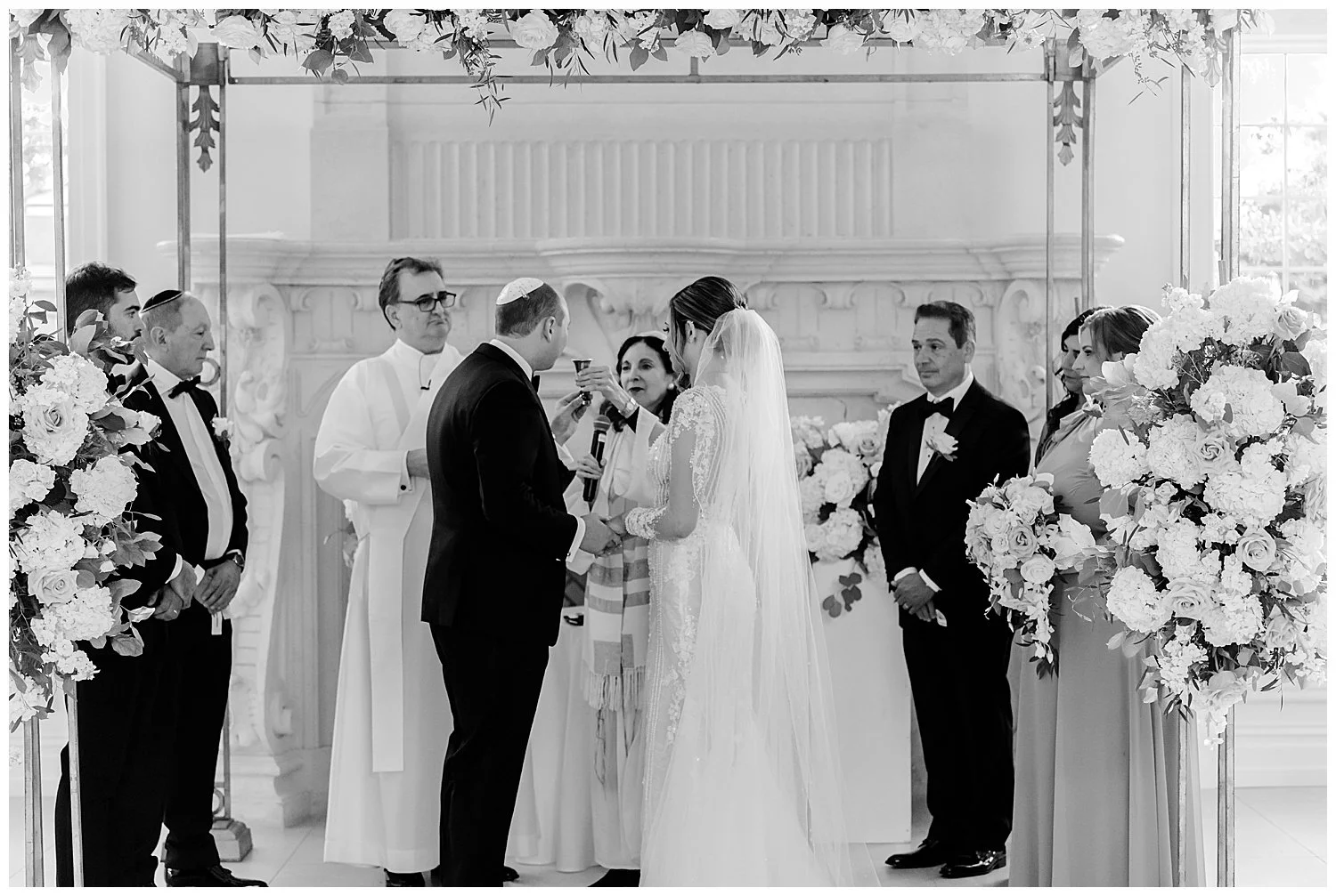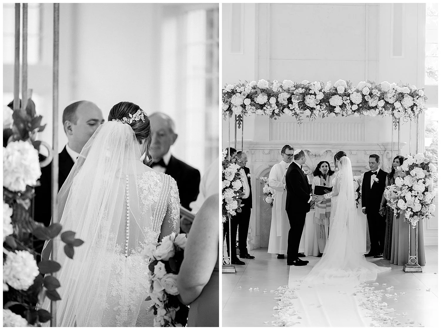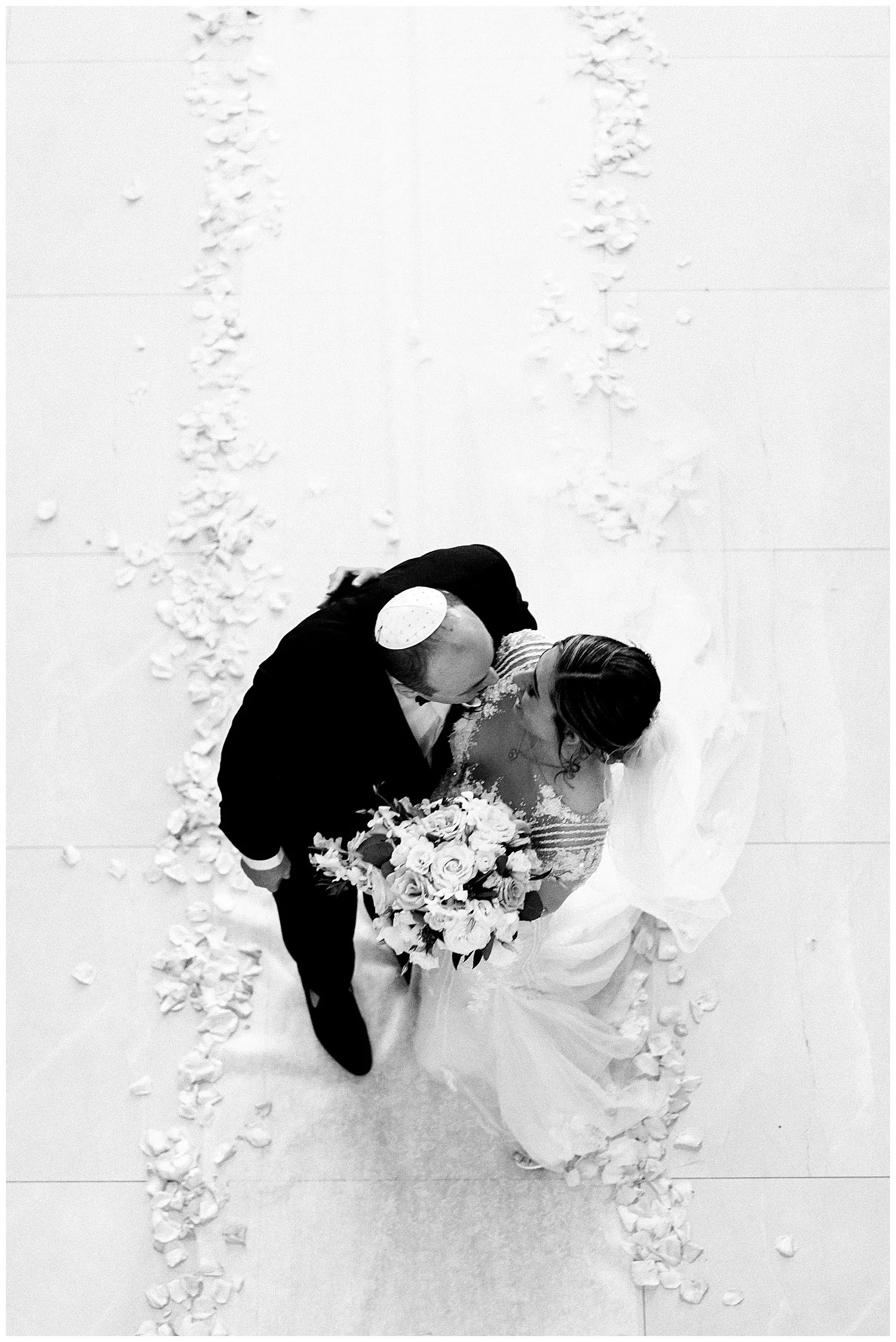 Emily and John’s ceremony was a testament to the beauty of blending cultures. They skillfully combined their Jewish and Catholic traditions, crafting a meaningful and inclusive celebration. The chuppah, adorned with soft peach florals and greenery, stood proudly at the altar, symbolizing the couple’s shared future under one roof. The ceremony incorporated the seven blessings of the Jewish tradition alongside Catholic prayers, uniting their families in a harmonious and heartfelt way.