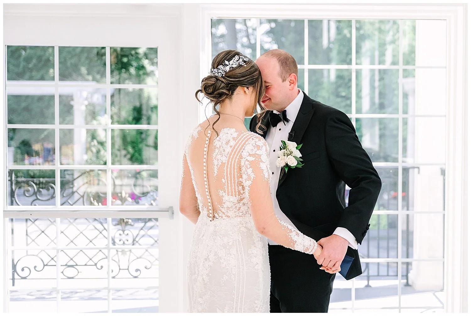 The day began with an intimate moment between the bride and groom, away from the hustle and bustle of wedding preparations. Emily and John chose the sun-drenched conservatory at Florentine Gardens for their first look. The conservatory, with its grand windows and soft natural light, created a serene and romantic atmosphere for this private reveal. As John turned to see Emily in her stunning gown, the joy and anticipation on their faces were palpable—setting the tone for a day full of love and celebration.
