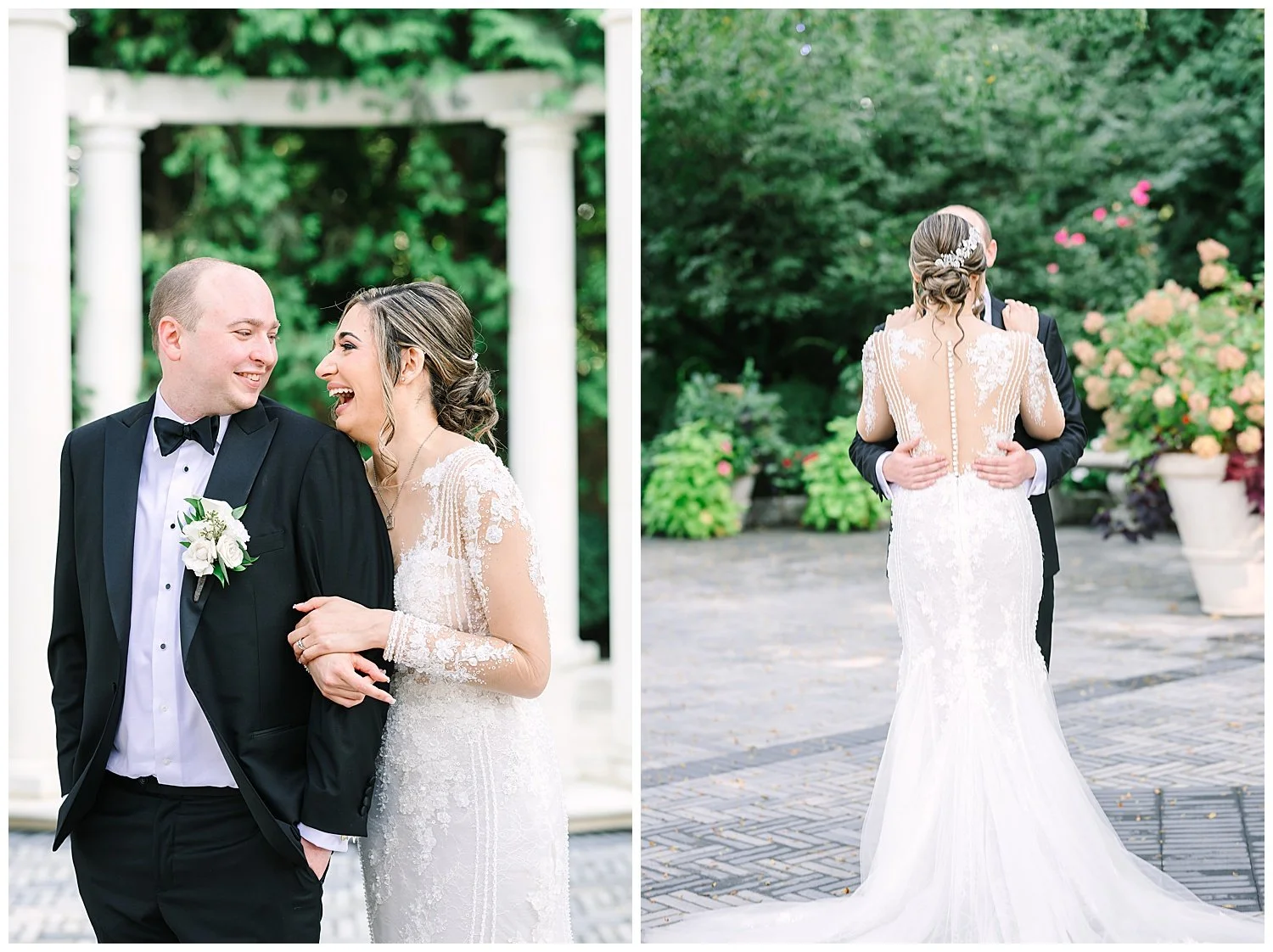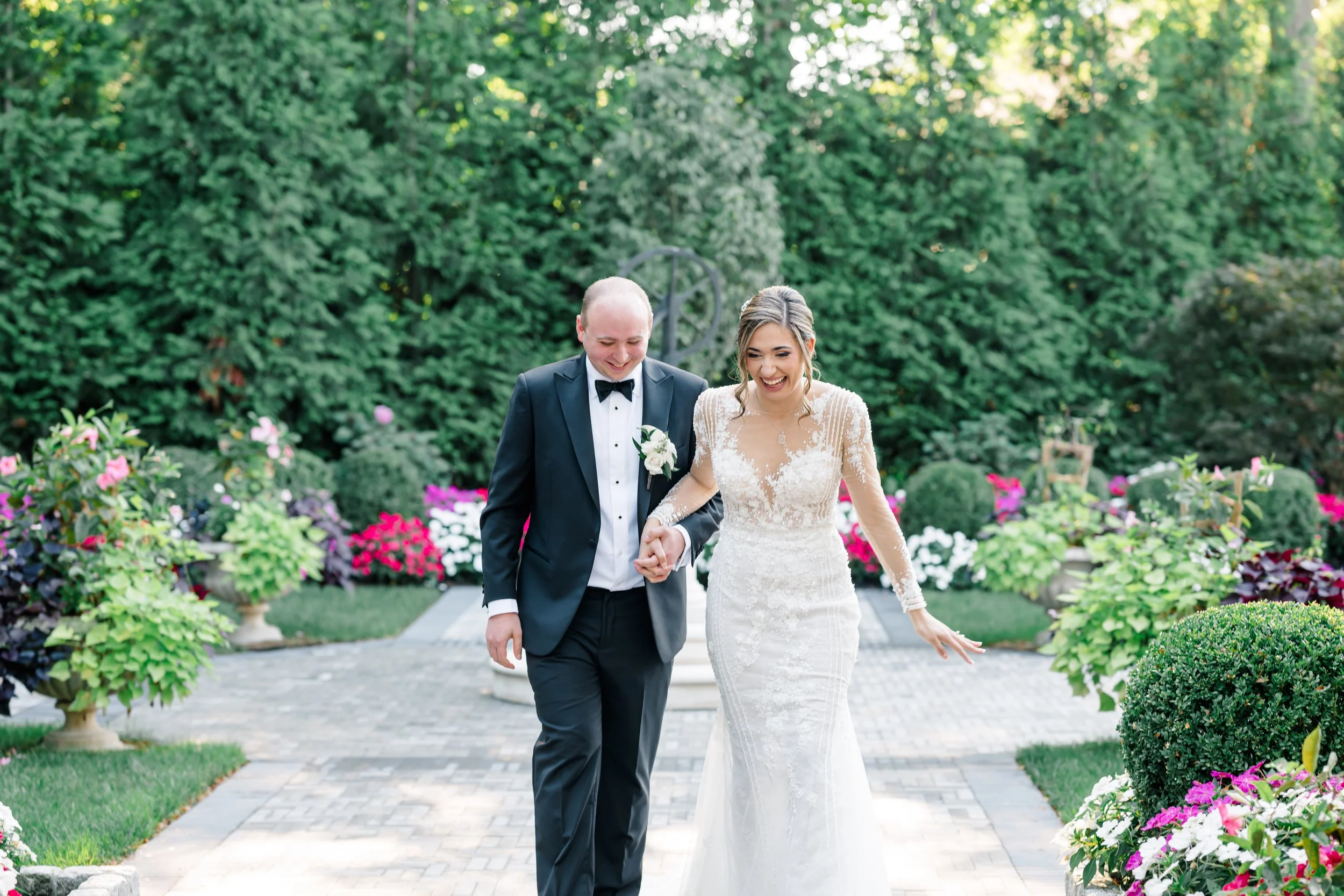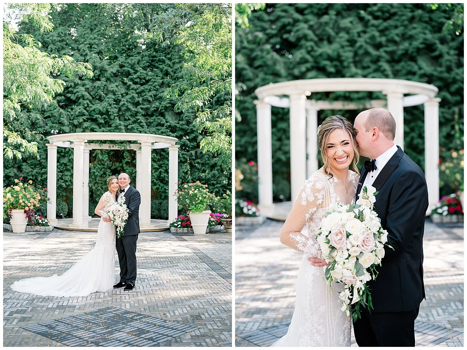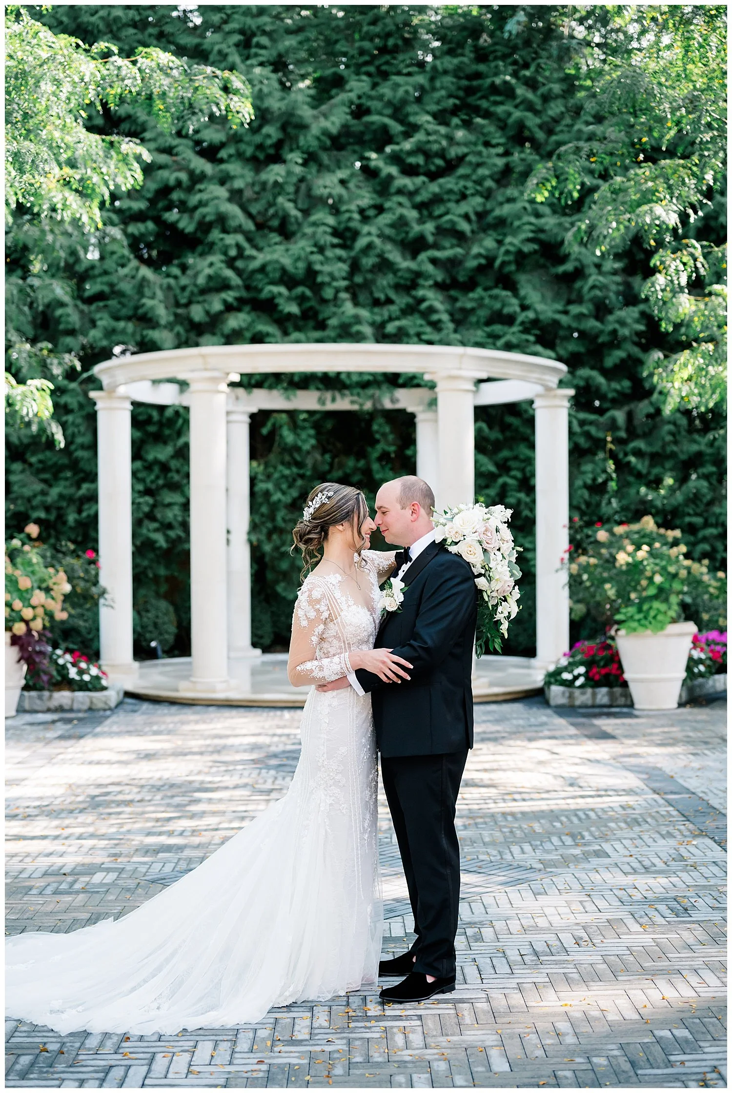 Following their first look, the couple strolled hand-in-hand through Florentine Gardens’ perfectly manicured grounds. The lush greenery and vibrant summer blooms provided the ideal backdrop for their portraits. Against the timeless landscape, Emily’s flowing white gown and John’s classic black tuxedo stood out beautifully, while the soft peach accents in her bouquet and décor echoed throughout the photos, capturing the essence of their elegant affair. The gardens offered an enchanting mix of tranquility and grandeur, making their portraits truly magical.