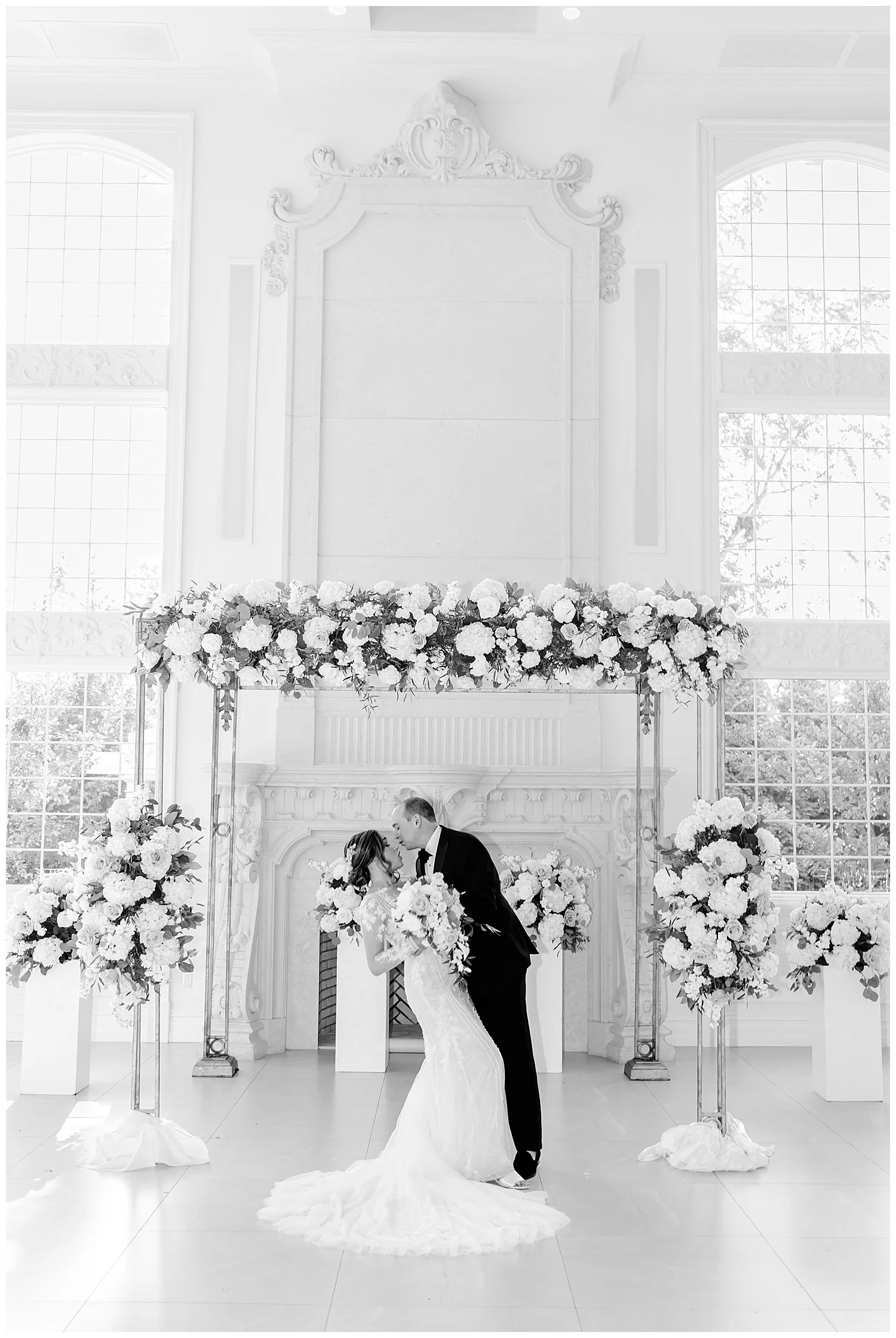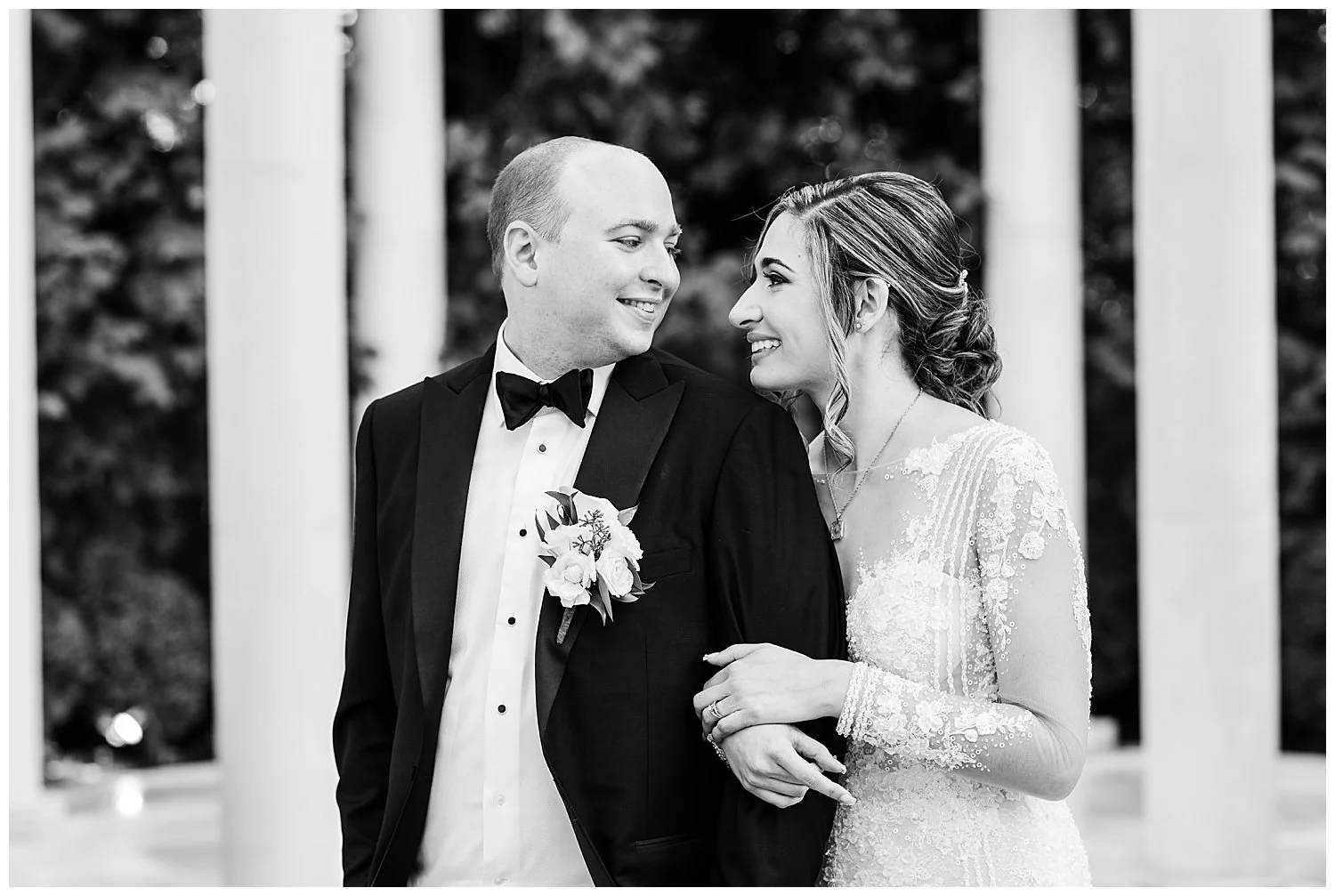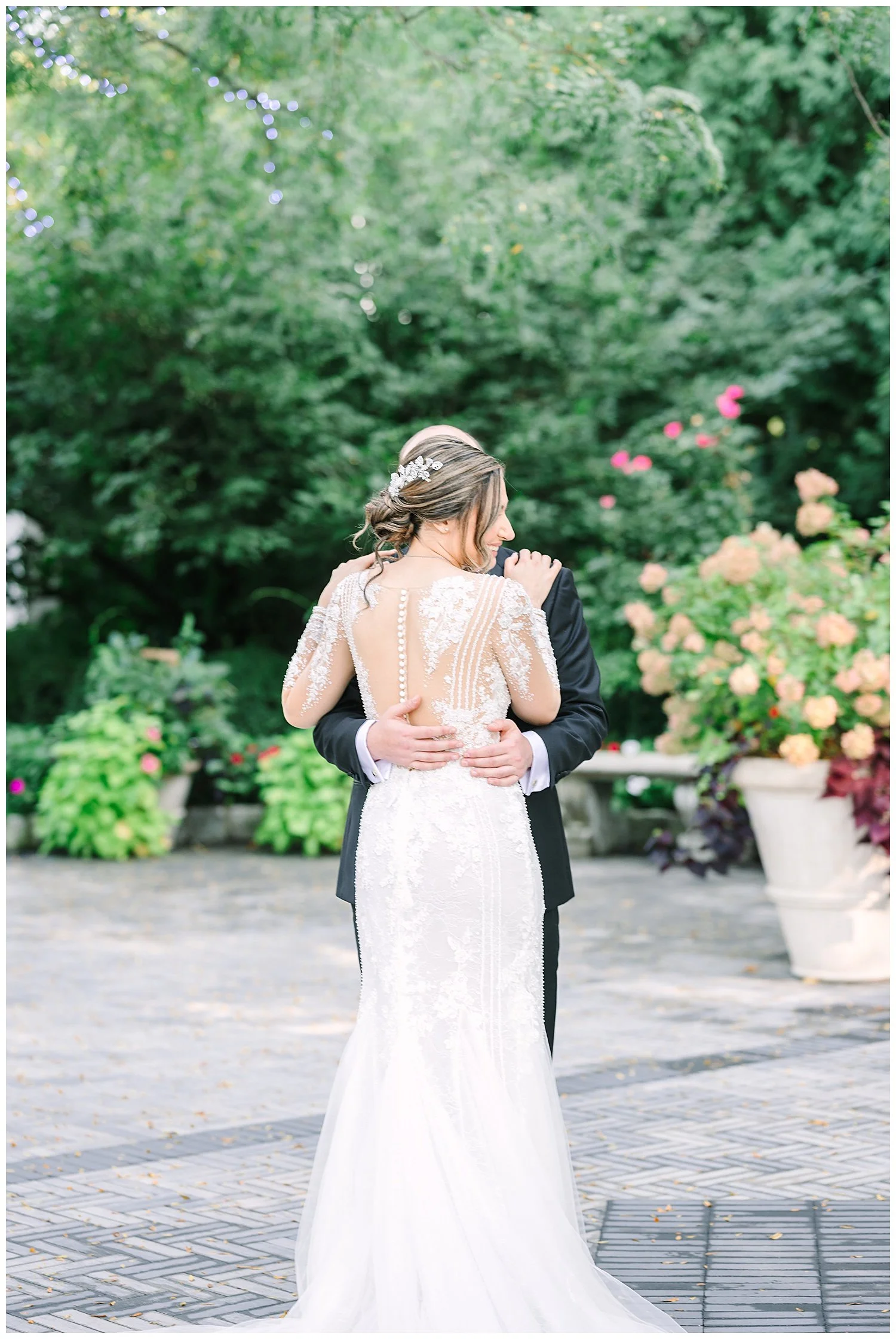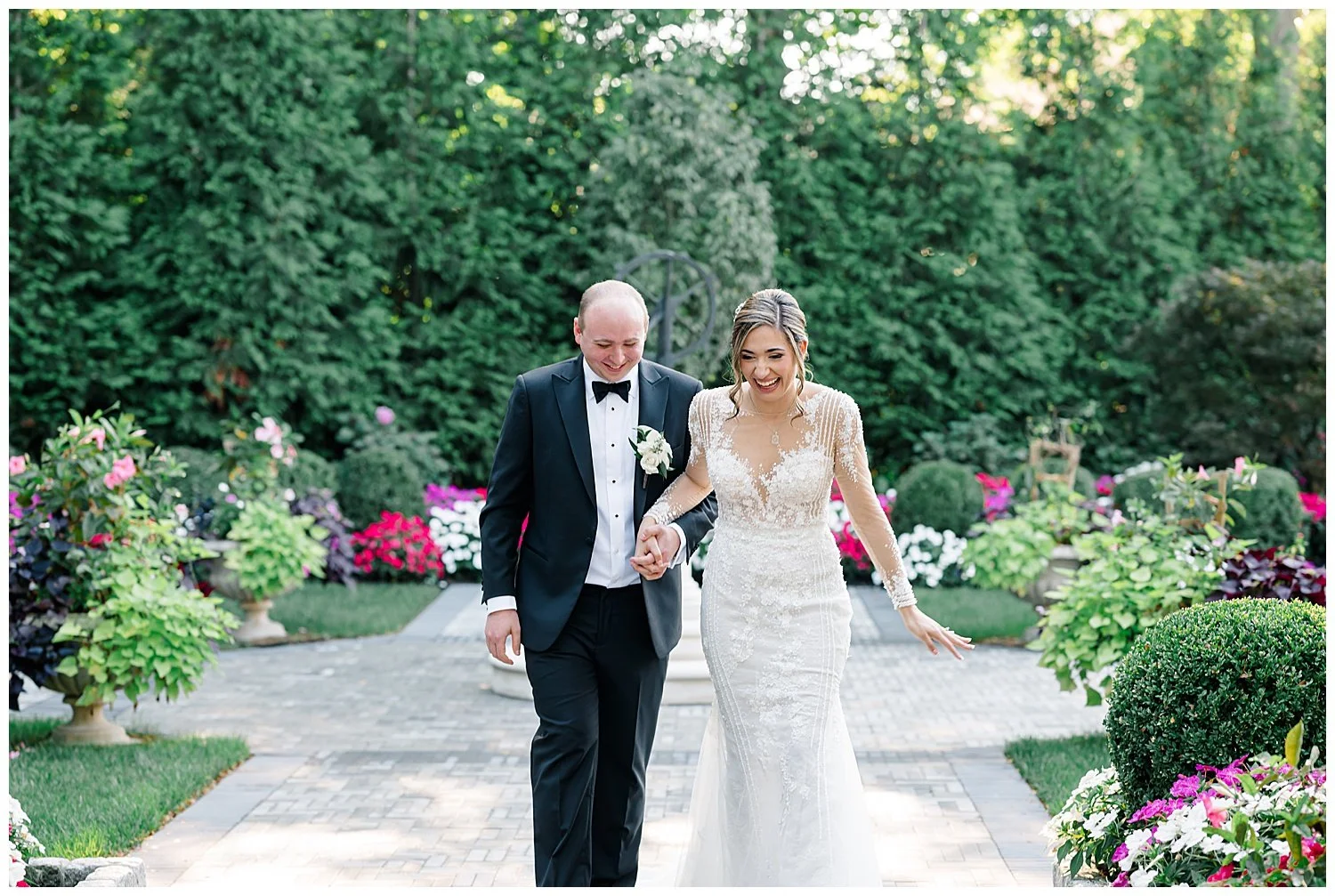Following their first look, the couple strolled hand-in-hand through Florentine Gardens’ perfectly manicured grounds. The lush greenery and vibrant summer blooms provided the ideal backdrop for their portraits. Against the timeless landscape, Emily’s flowing white gown and John’s classic black tuxedo stood out beautifully, while the soft peach accents in her bouquet and décor echoed throughout the photos, capturing the essence of their elegant affair. The gardens offered an enchanting mix of tranquility and grandeur, making their portraits truly magical.