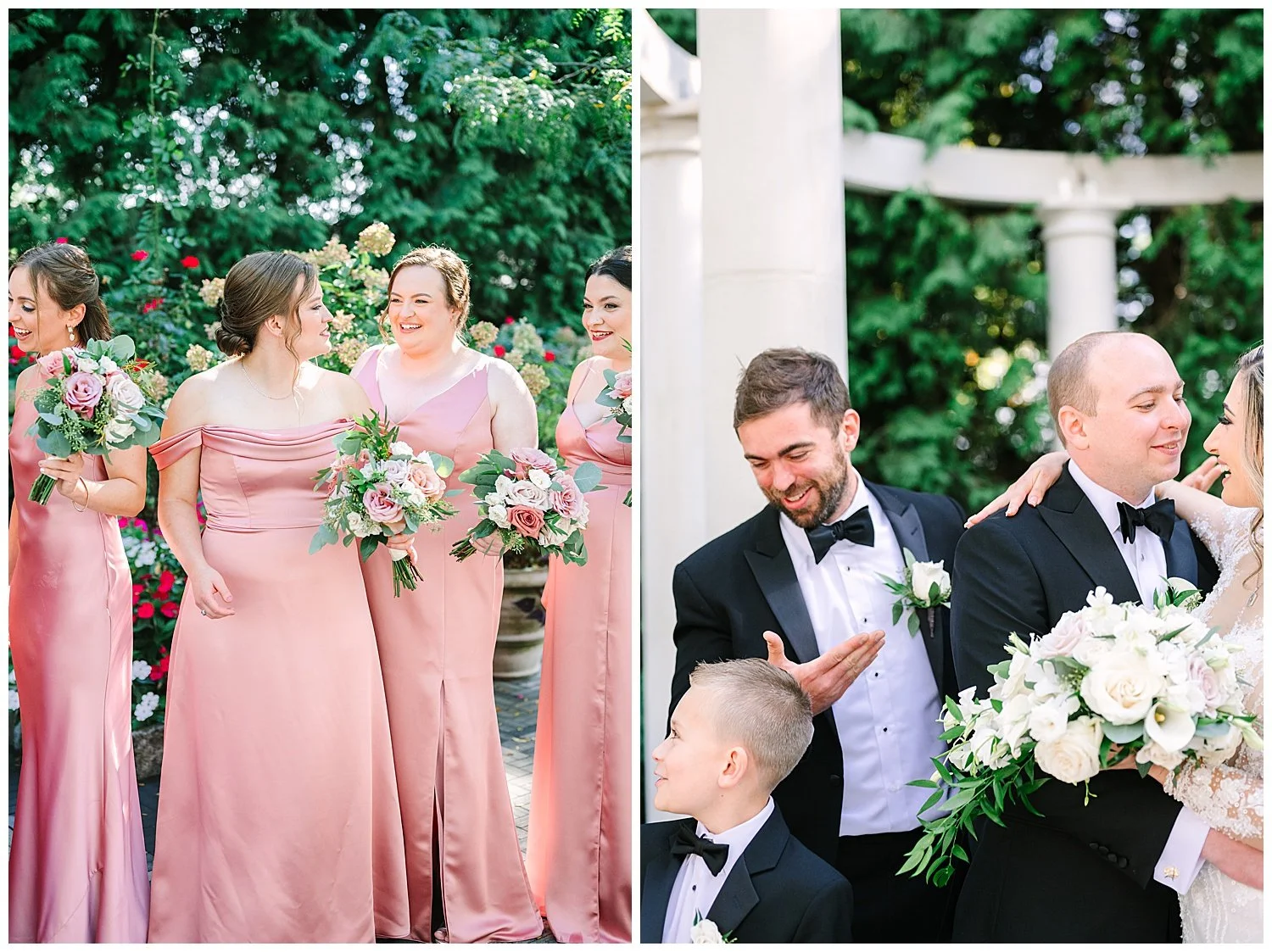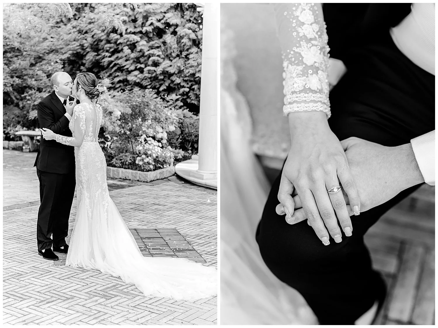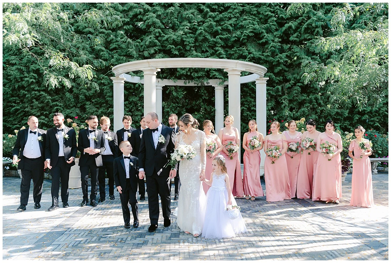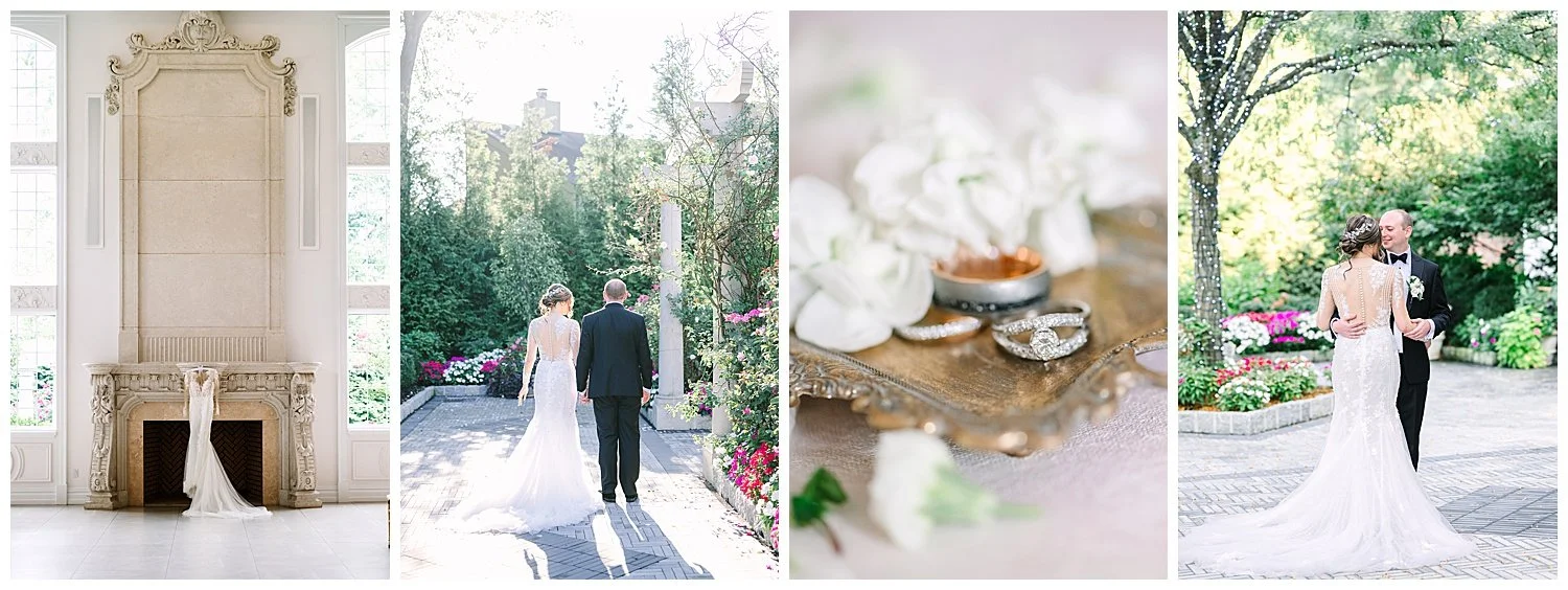 Following their first look, the couple strolled hand-in-hand through Florentine Gardens’ perfectly manicured grounds. The lush greenery and vibrant summer blooms provided the ideal backdrop for their portraits. Against the timeless landscape, Emily’s flowing white gown and John’s classic black tuxedo stood out beautifully, while the soft peach accents in her bouquet and décor echoed throughout the photos, capturing the essence of their elegant affair. The gardens offered an enchanting mix of tranquility and grandeur, making their portraits truly magical.