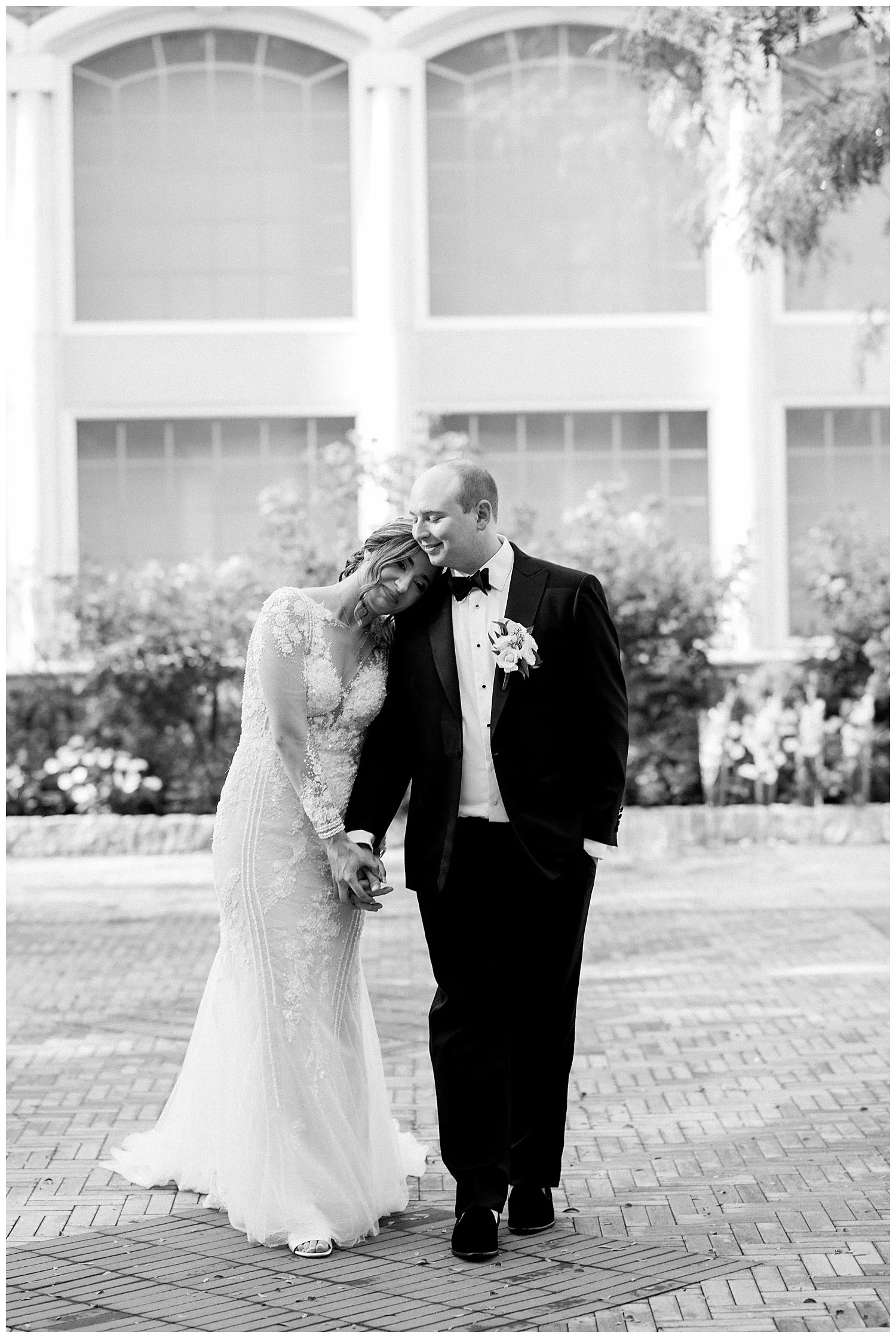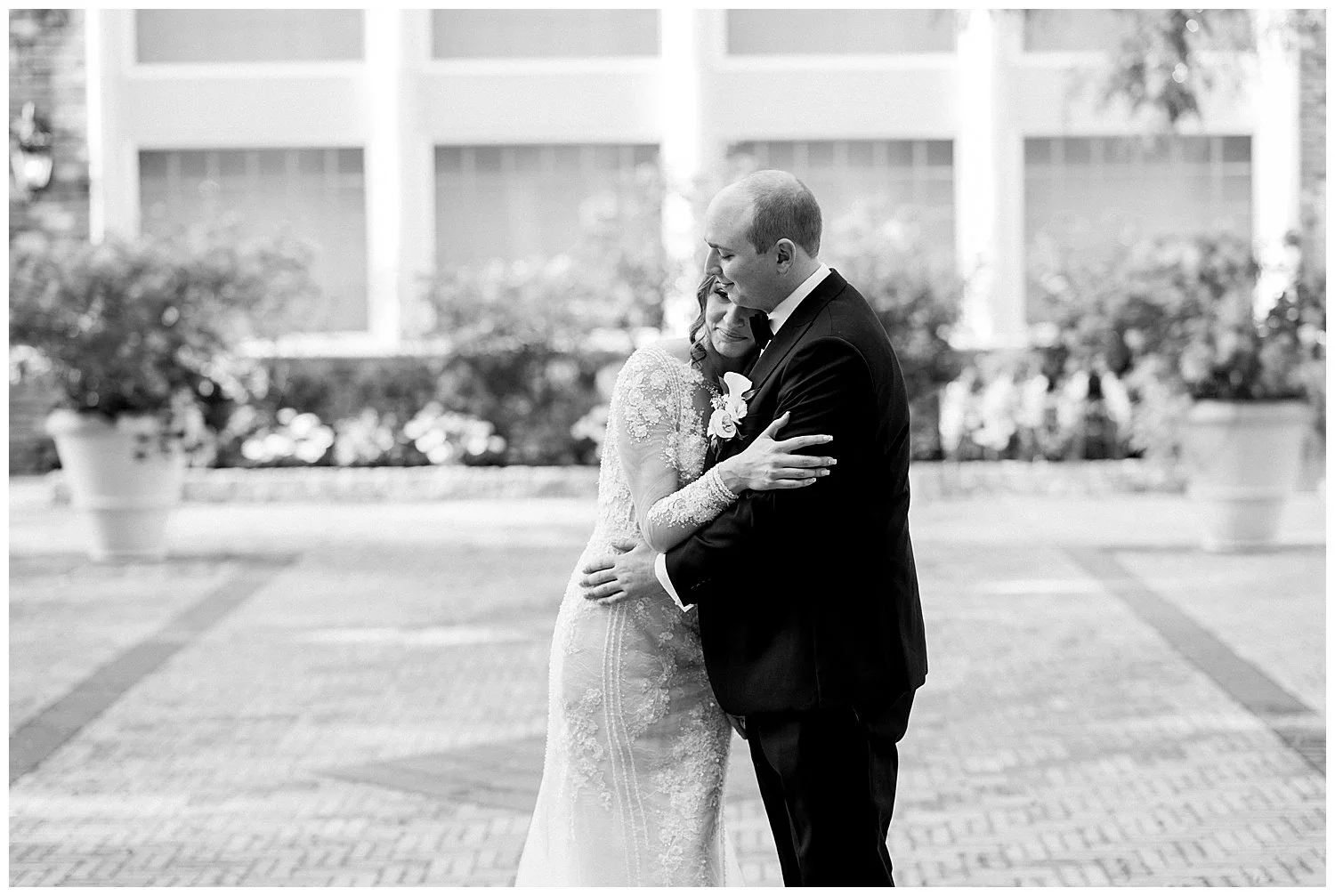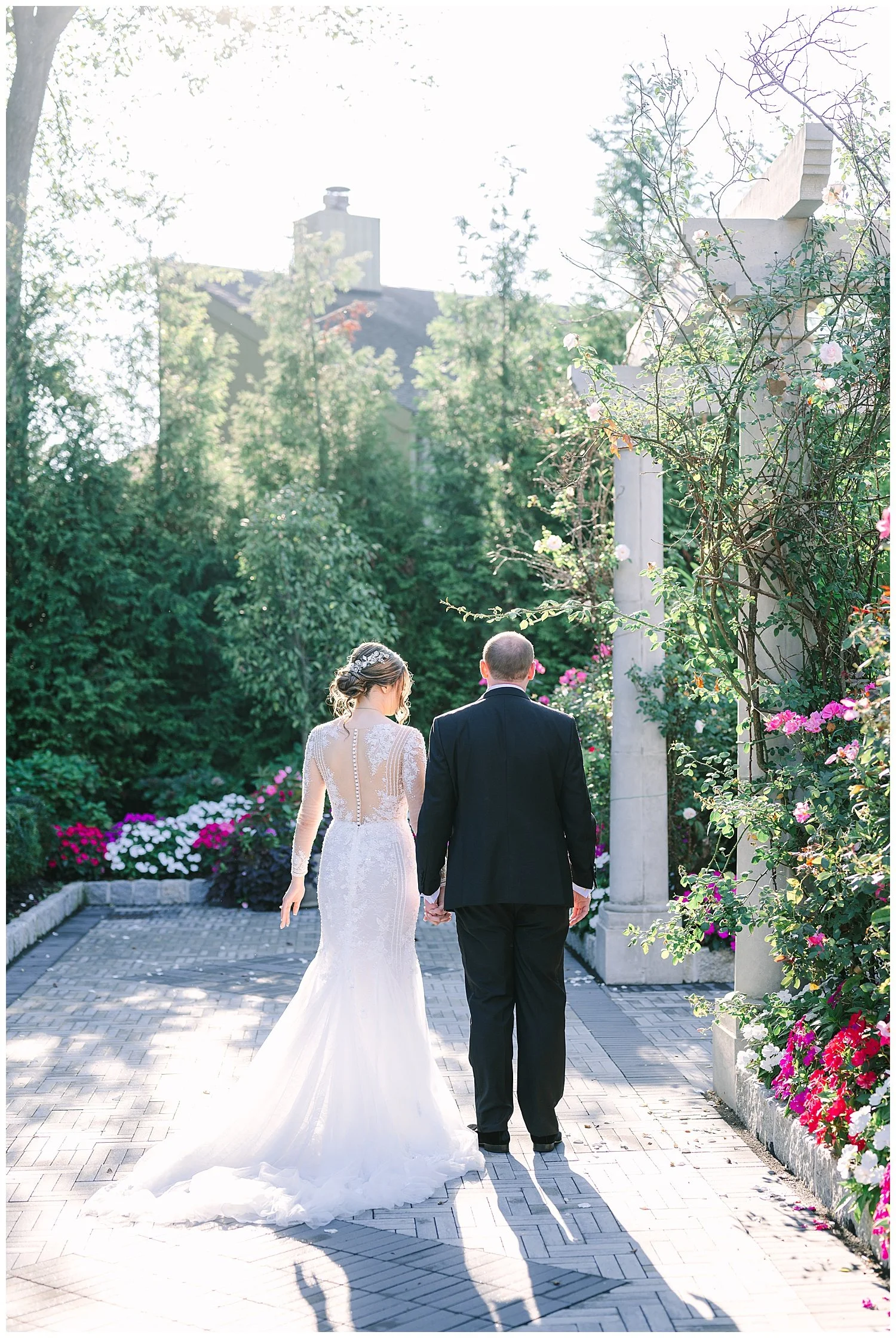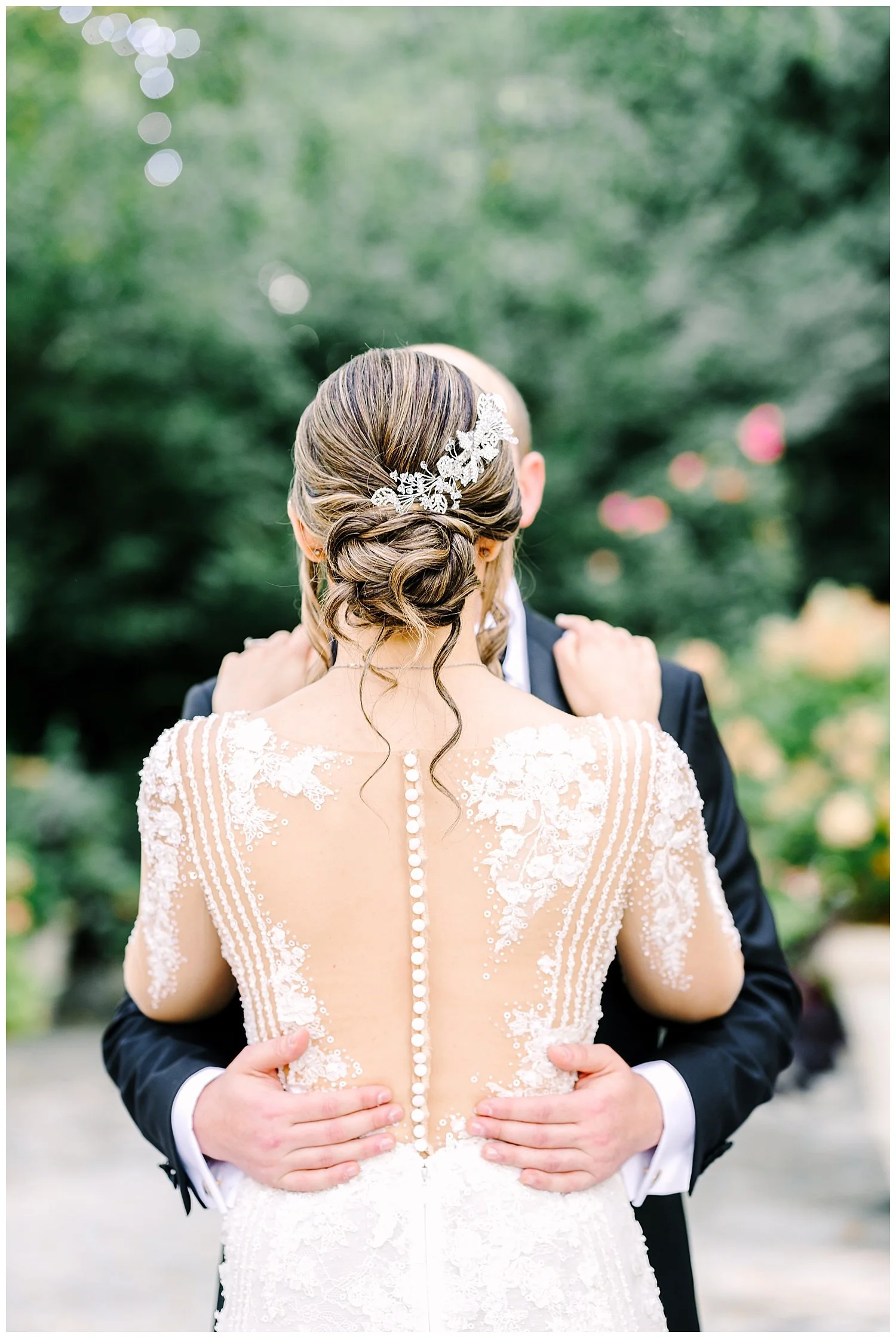 Following their first look, the couple strolled hand-in-hand through Florentine Gardens’ perfectly manicured grounds. The lush greenery and vibrant summer blooms provided the ideal backdrop for their portraits. Against the timeless landscape, Emily’s flowing white gown and John’s classic black tuxedo stood out beautifully, while the soft peach accents in her bouquet and décor echoed throughout the photos, capturing the essence of their elegant affair. The gardens offered an enchanting mix of tranquility and grandeur, making their portraits truly magical.