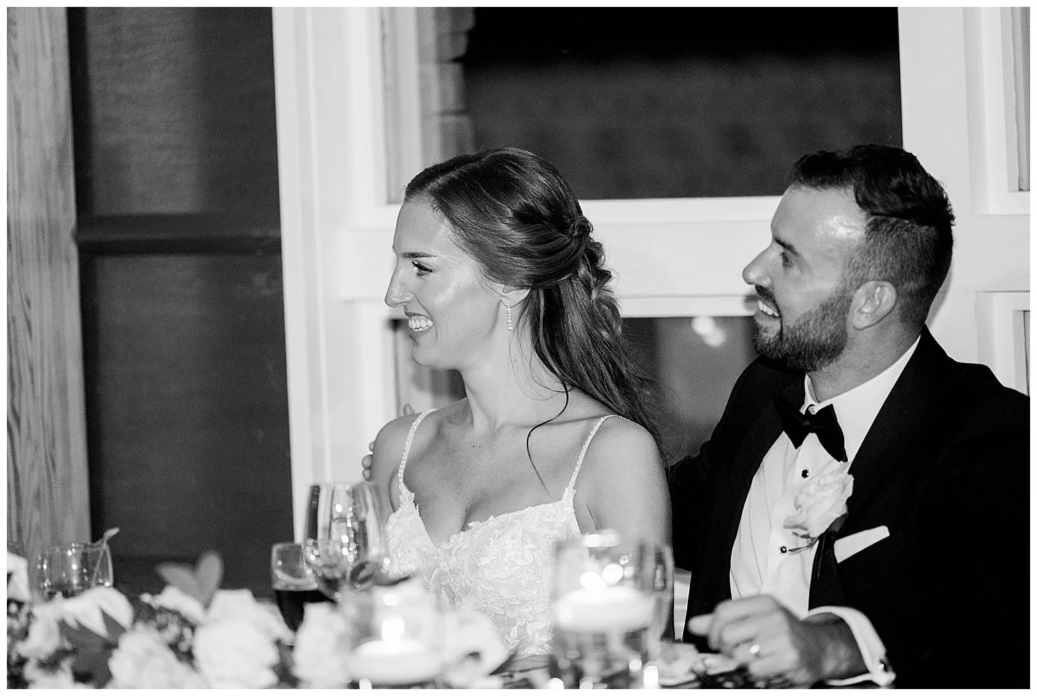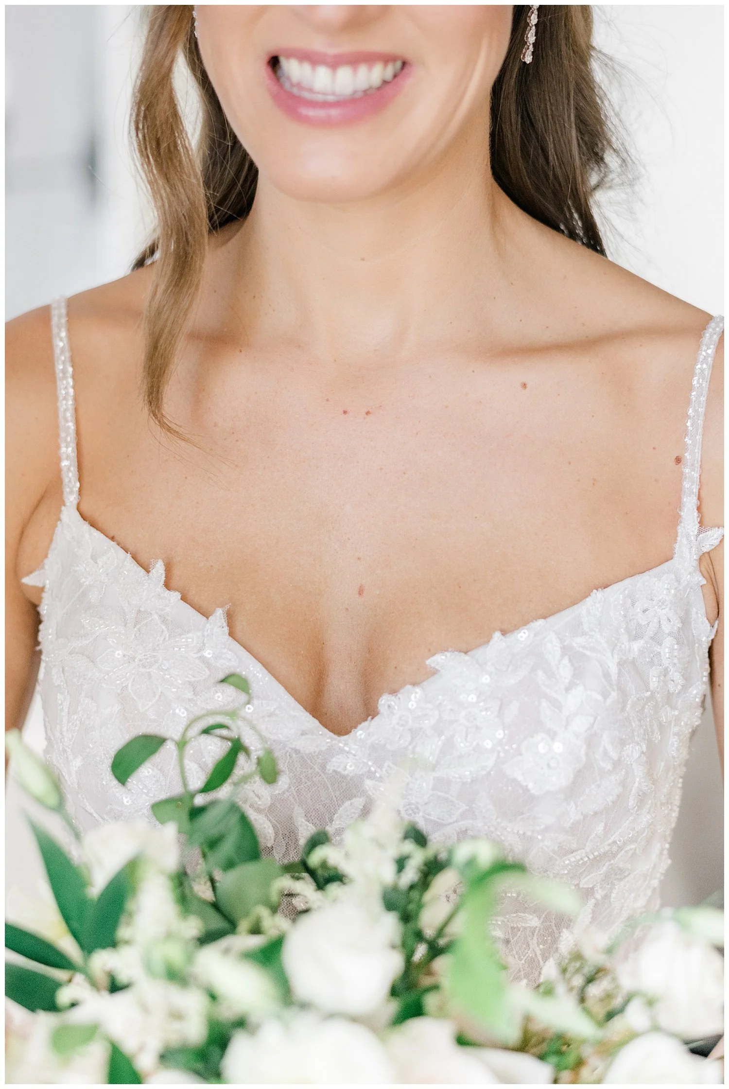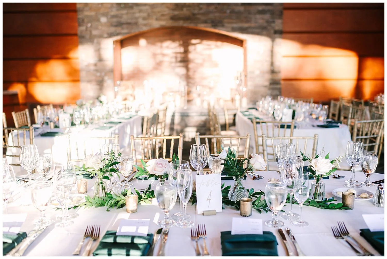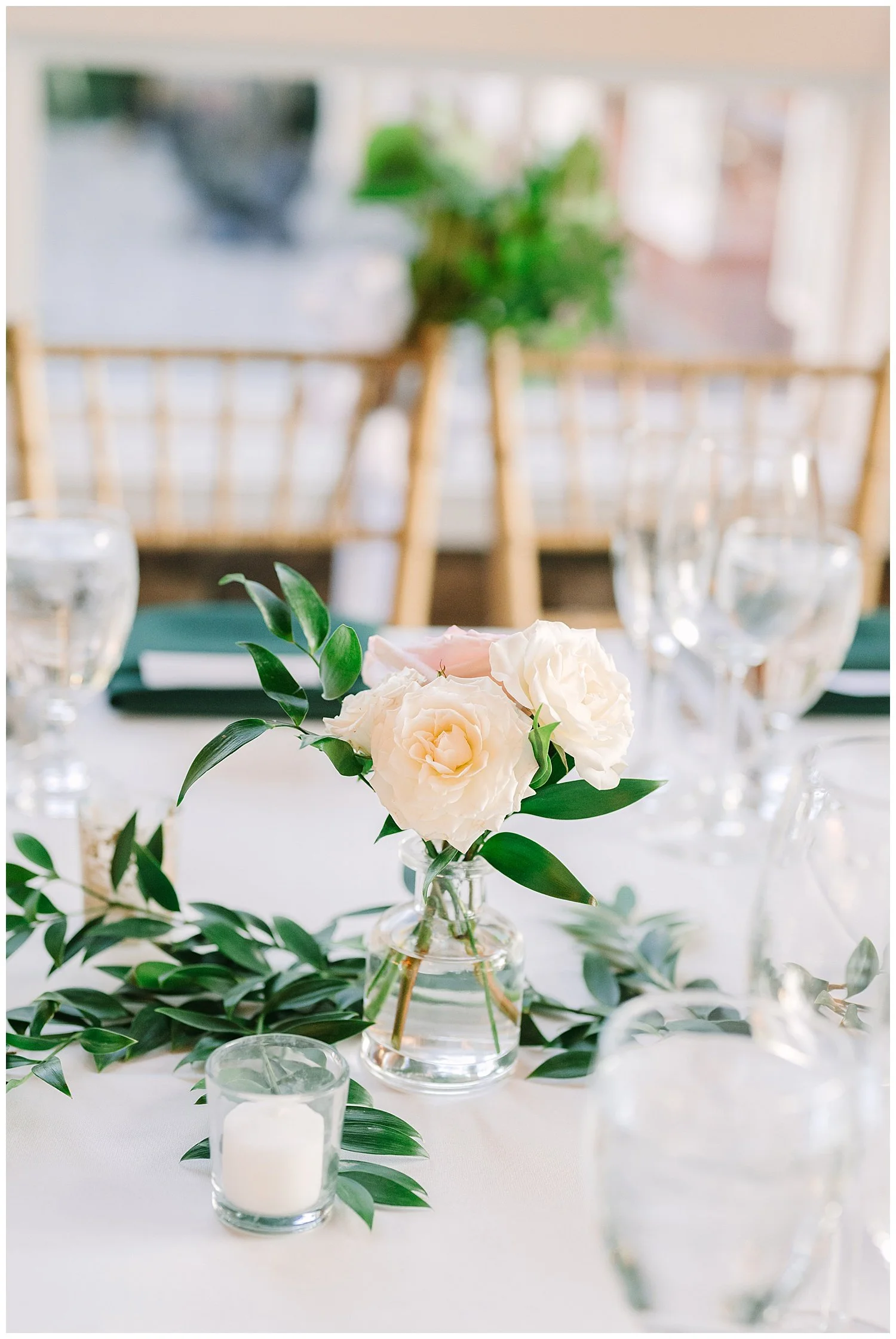 Chelsea and Jason envisioned an elegant yet cozy atmosphere, and their choice of a classic sage green and gold color palette brought their vision to life. Florals by A Touch of Elegance featured some pretty white roses and delicate greenery, while candlelit tables added a romantic glow to the reception space.