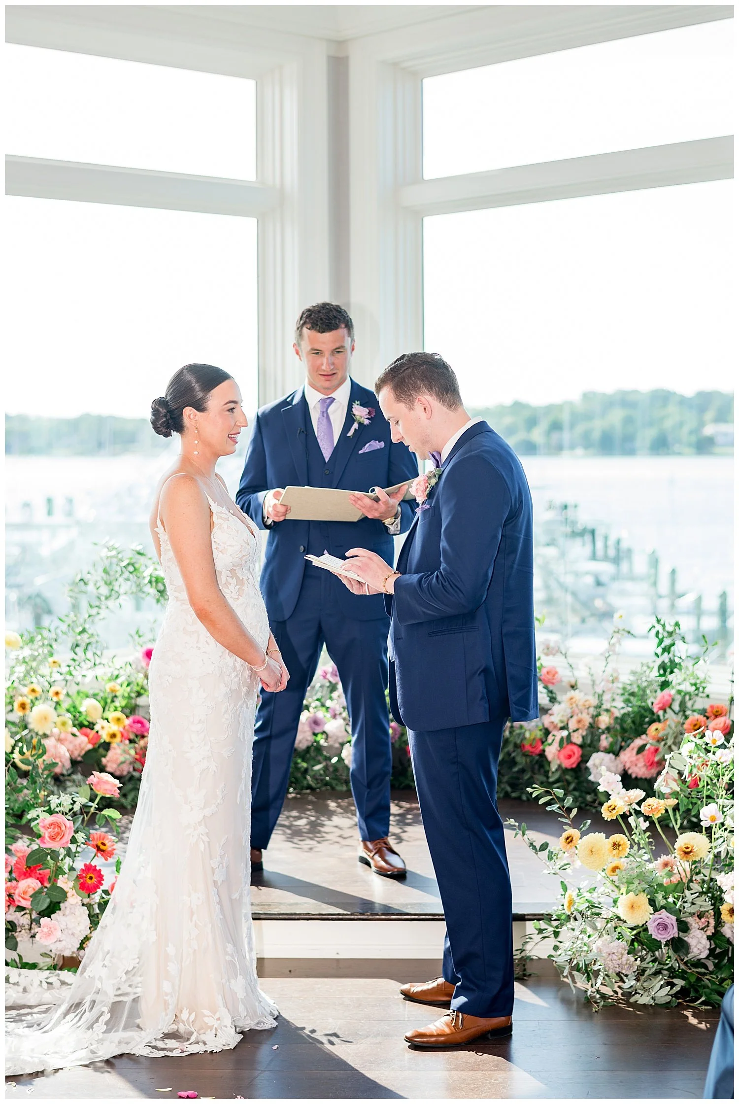 Photographer: deborahannphotography. Venue: Clark’s Landing Yacht Club Florals: Tracey Reynolds Floral Design Hair: Jchairdesign. Makeup: Beauty on Location Coordinator: Flawless Events by Adrianne Bridal Shoes: Bella Belle Cake Baker: Chocolate Carousel Invitation Suite: Minted Transportation: Shoo Boo Shuttles Groom Suit: Vera Wang