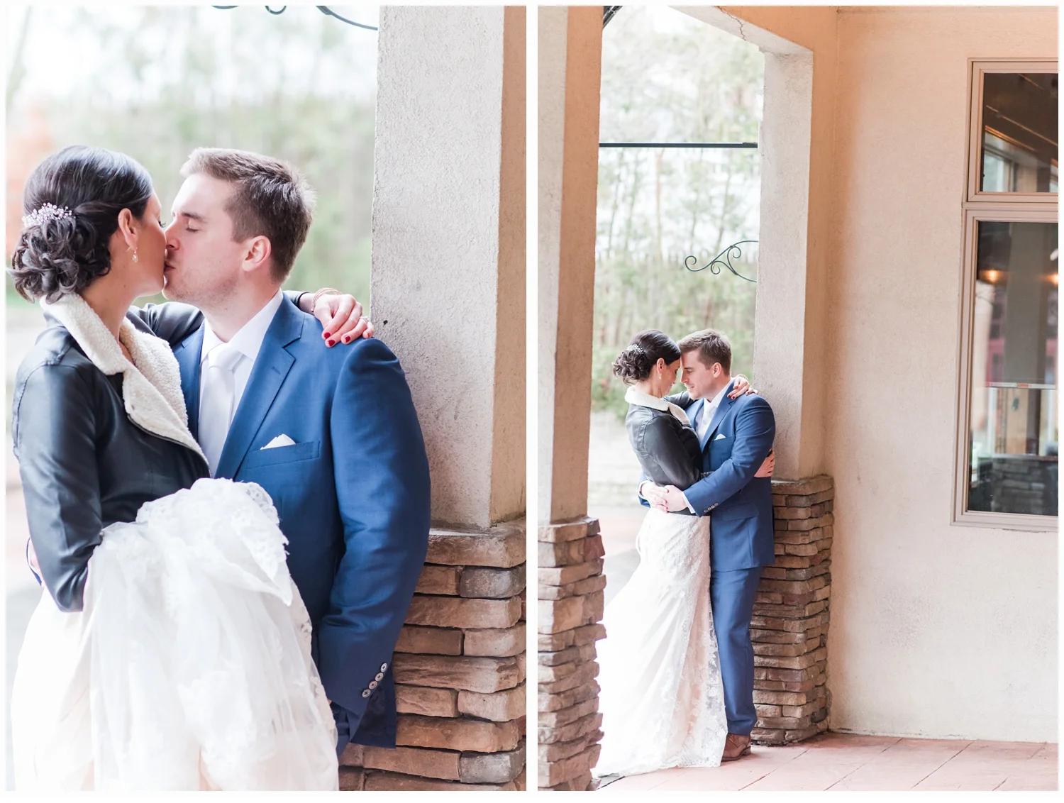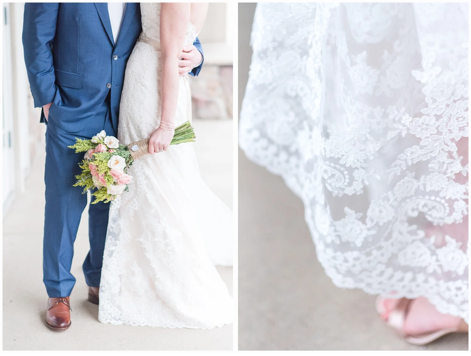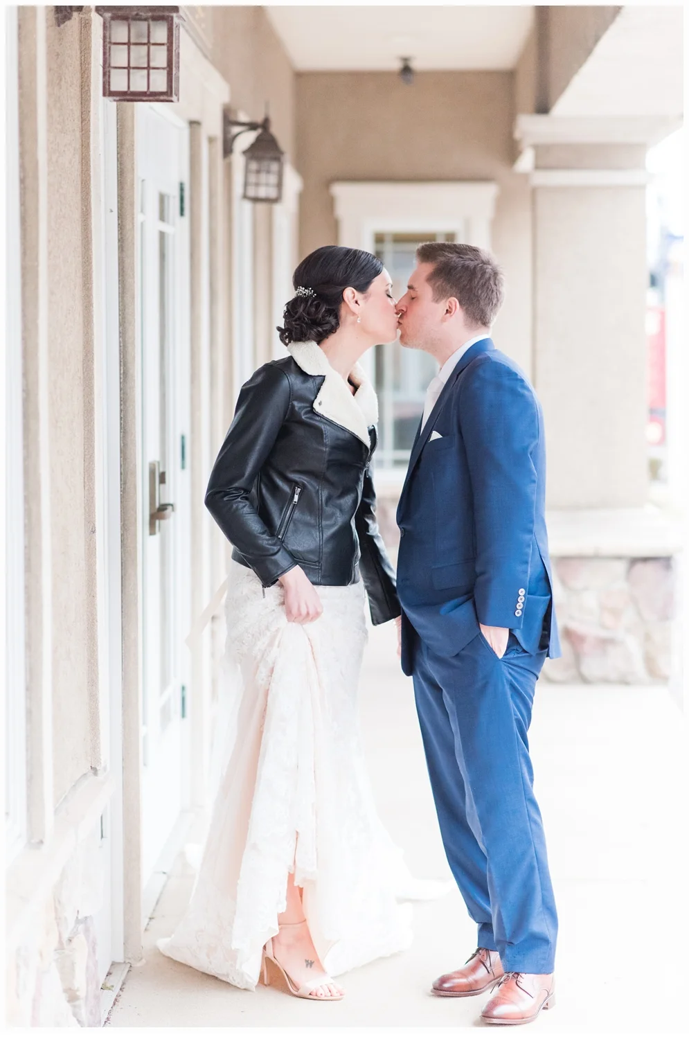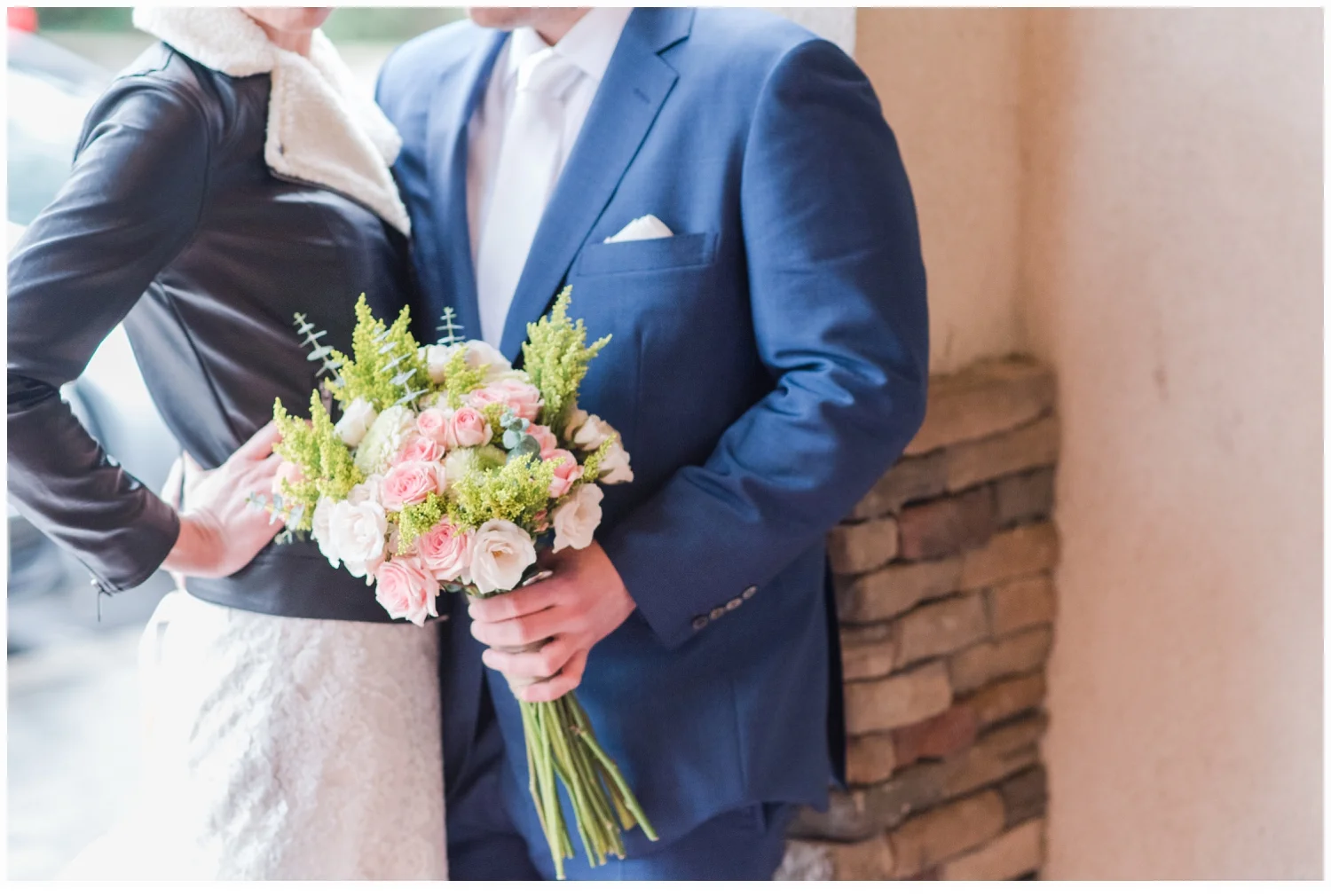 Lynn works for Anthropologie and well, that always means to me beautiful style and beautiful details!!! She could not have picked more beautiful details! Be still my heart, I could not get enough! Her gorgeous wedding dress was the Leigh Gown, an exclusive BHLDN wedding gown. In case you didn’t know, BHLDN is the wedding store of Anthropologie. Oh my goodness, the lace was exquisite. Her beautiful shoes were gold and had pretty little bows on the back complimented by a few dainty pearls! They were made by Kelly & Kate. I loved that Lynn incorporated a beautiful fur lined black leather jacket with her dress! It was such a unique look for sure! Every detail was perfectly planned for her special wedding day!