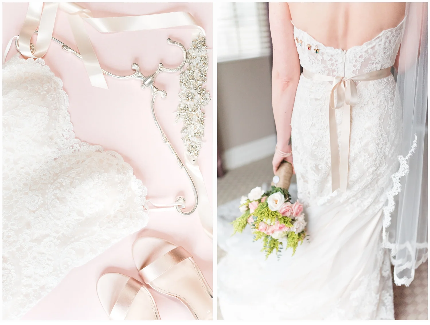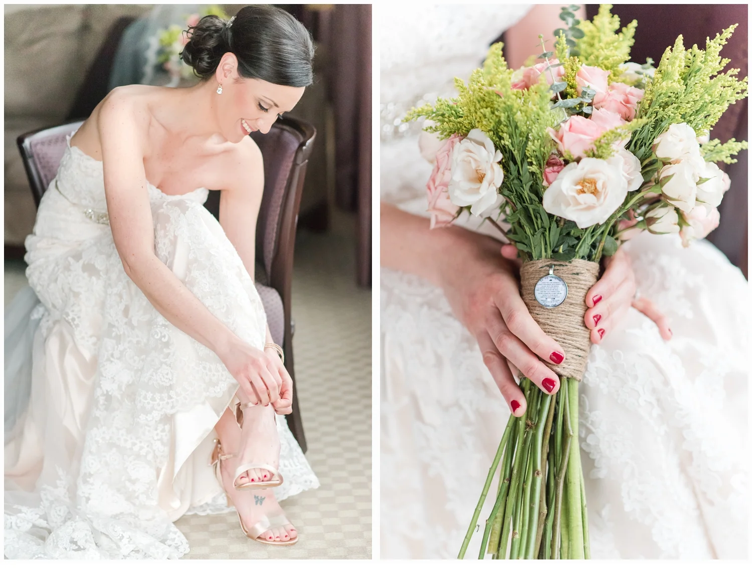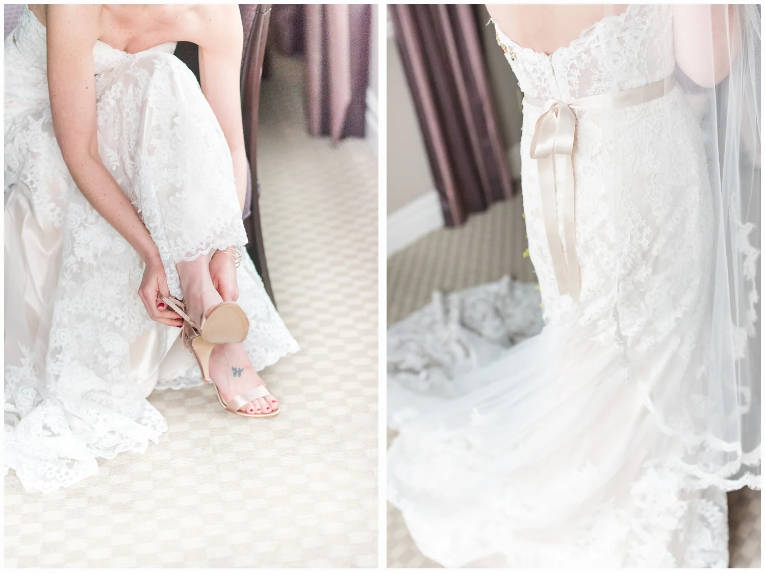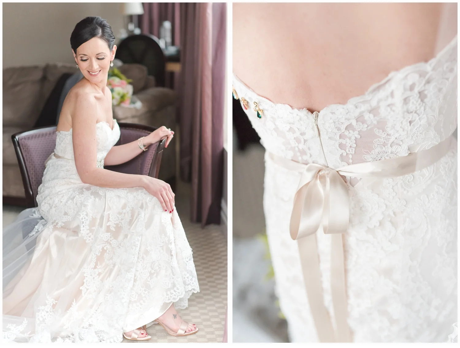 Lynn works for Anthropologie and well, that always means to me beautiful style and beautiful details!!! She could not have picked more beautiful details! Be still my heart, I could not get enough! Her gorgeous wedding dress was the Leigh Gown, an exclusive BHLDN wedding gown. In case you didn’t know, BHLDN is the wedding store of Anthropologie. Oh my goodness, the lace was exquisite. Her beautiful shoes were gold and had pretty little bows on the back complimented by a few dainty pearls! They were made by Kelly & Kate. I loved that Lynn incorporated a beautiful fur lined black leather jacket with her dress! It was such a unique look for sure! Every detail was perfectly planned for her special wedding day!