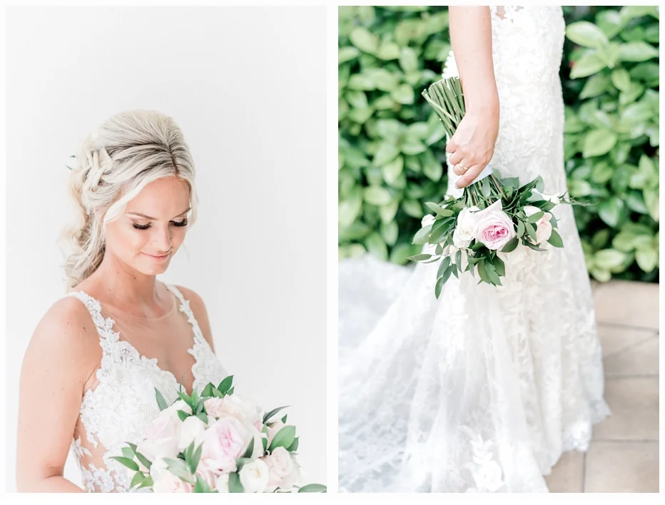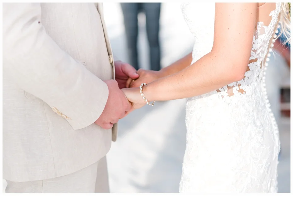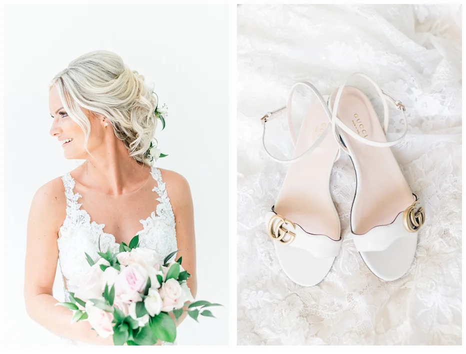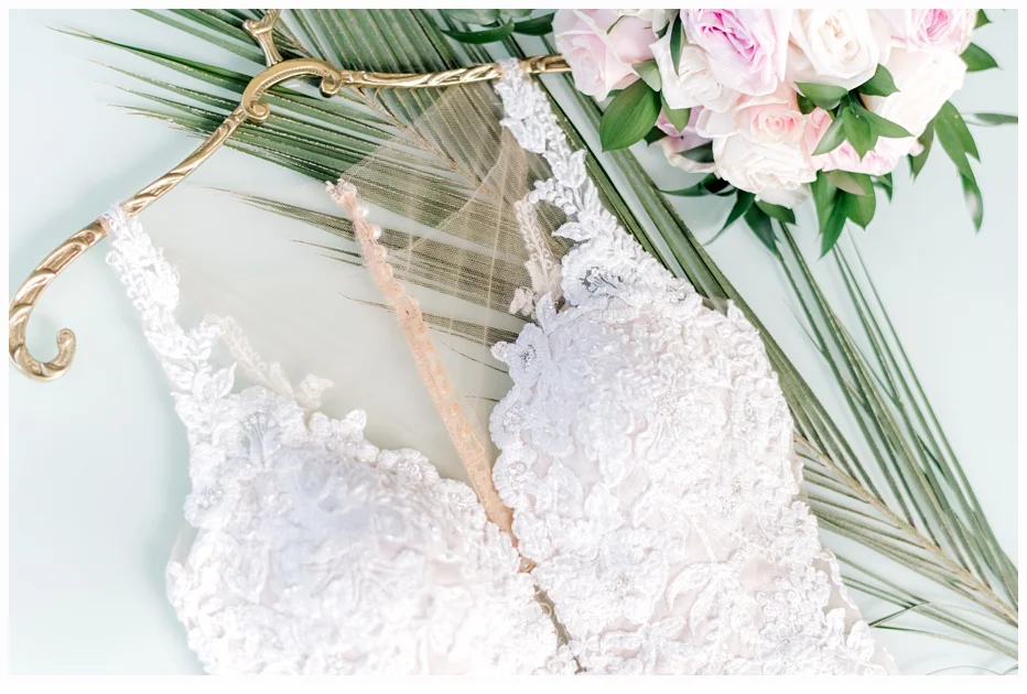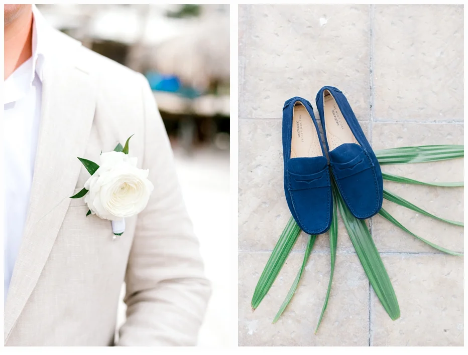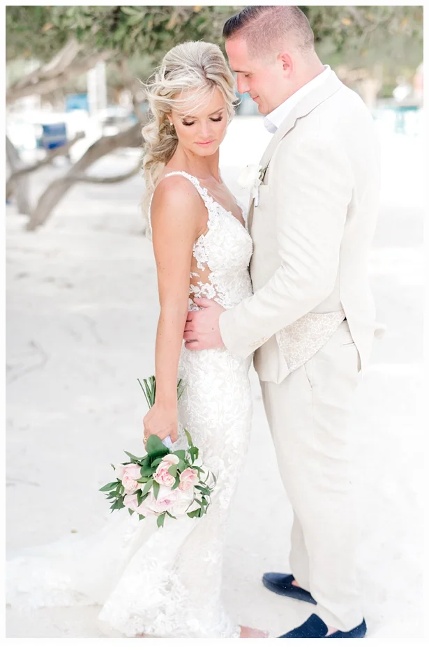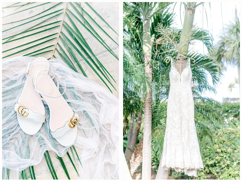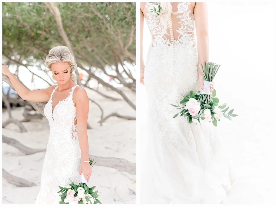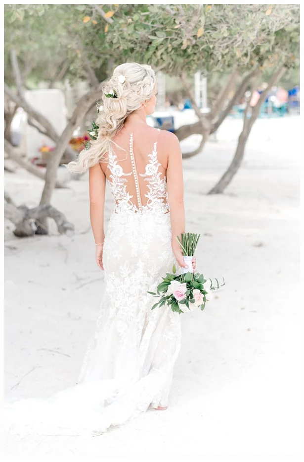 Her wedding gown was a Martina Liana gown which was made of antique lace and beautiful netting to frame her neckline. She wore some pretty little Gucci flats to compliment her dress and also to provide comfort seeing she would be getting married on the beach!