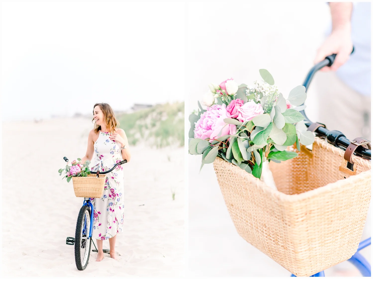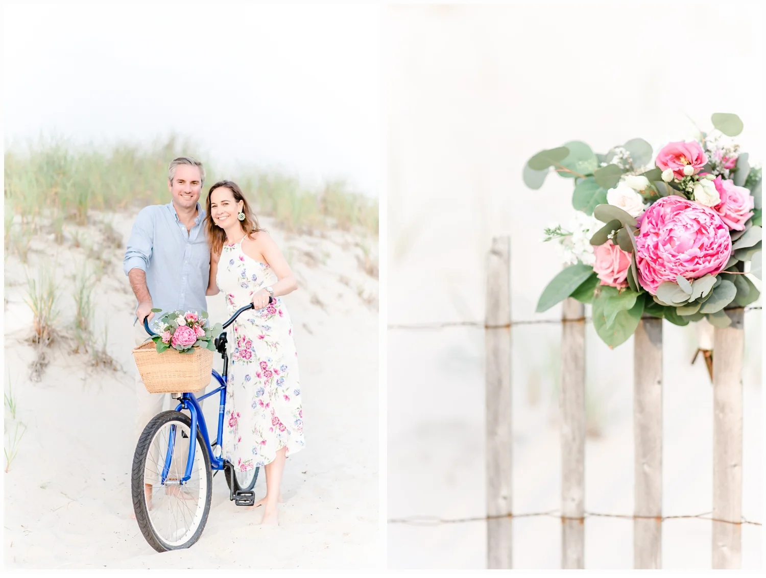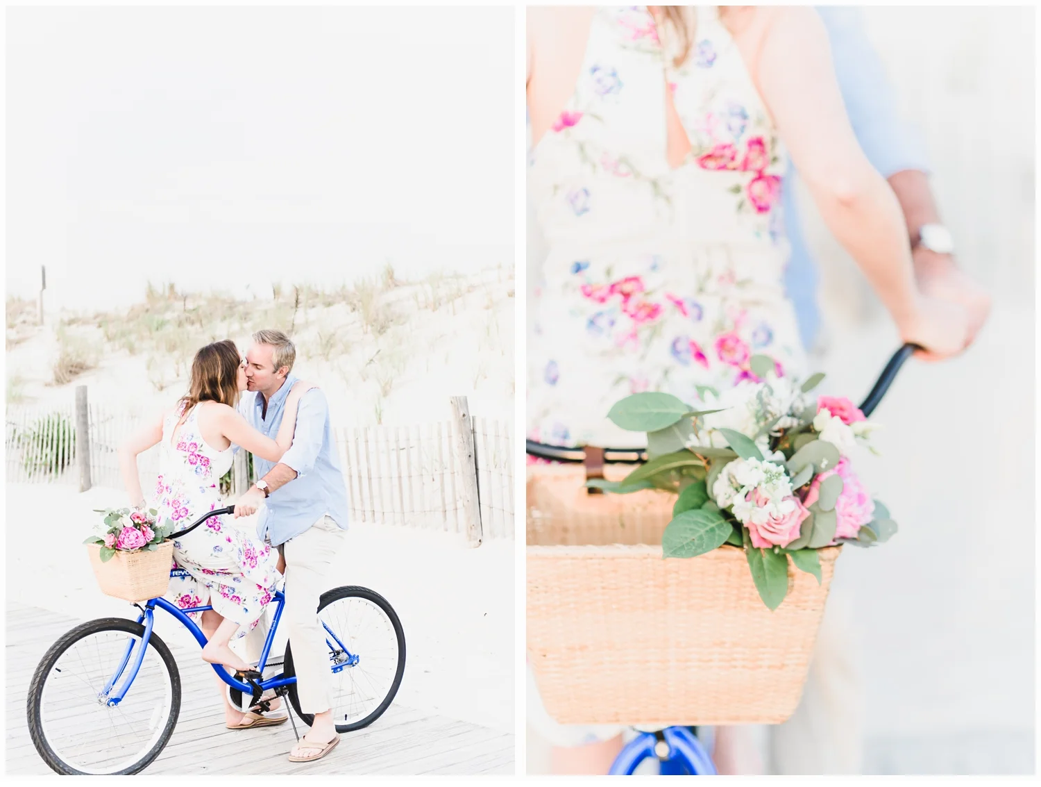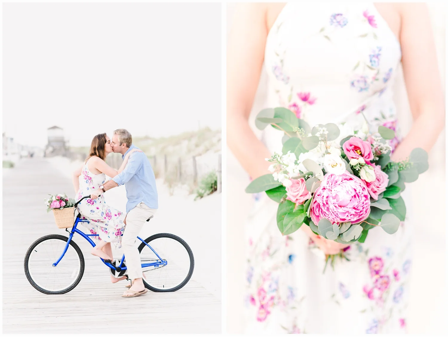 Jeanine’s family has an adorable beach house in Lavallette, New Jersey so the wheels started spinning in my head as I started planning and thinking about their perfect session. With a beautiful beach cruiser and gorgeous flowers, pretty pretty outfits, and a beautiful couple, my vision for their session came to life. Jeanine and John have impeccable taste to say the least and they totally rocked it! She chose a beautiful floral dress designed by “Privacy Please” and John’s attire was by J. Crew. The beautiful floral bouquet was designed by Flowers by Melinda and it was perfect!