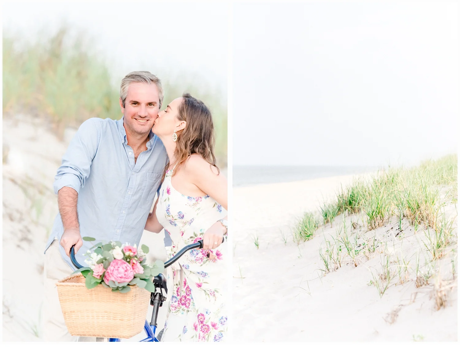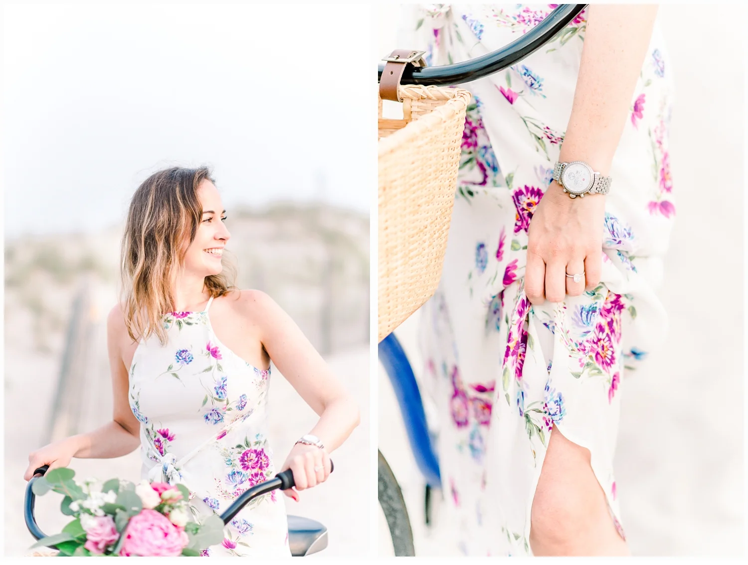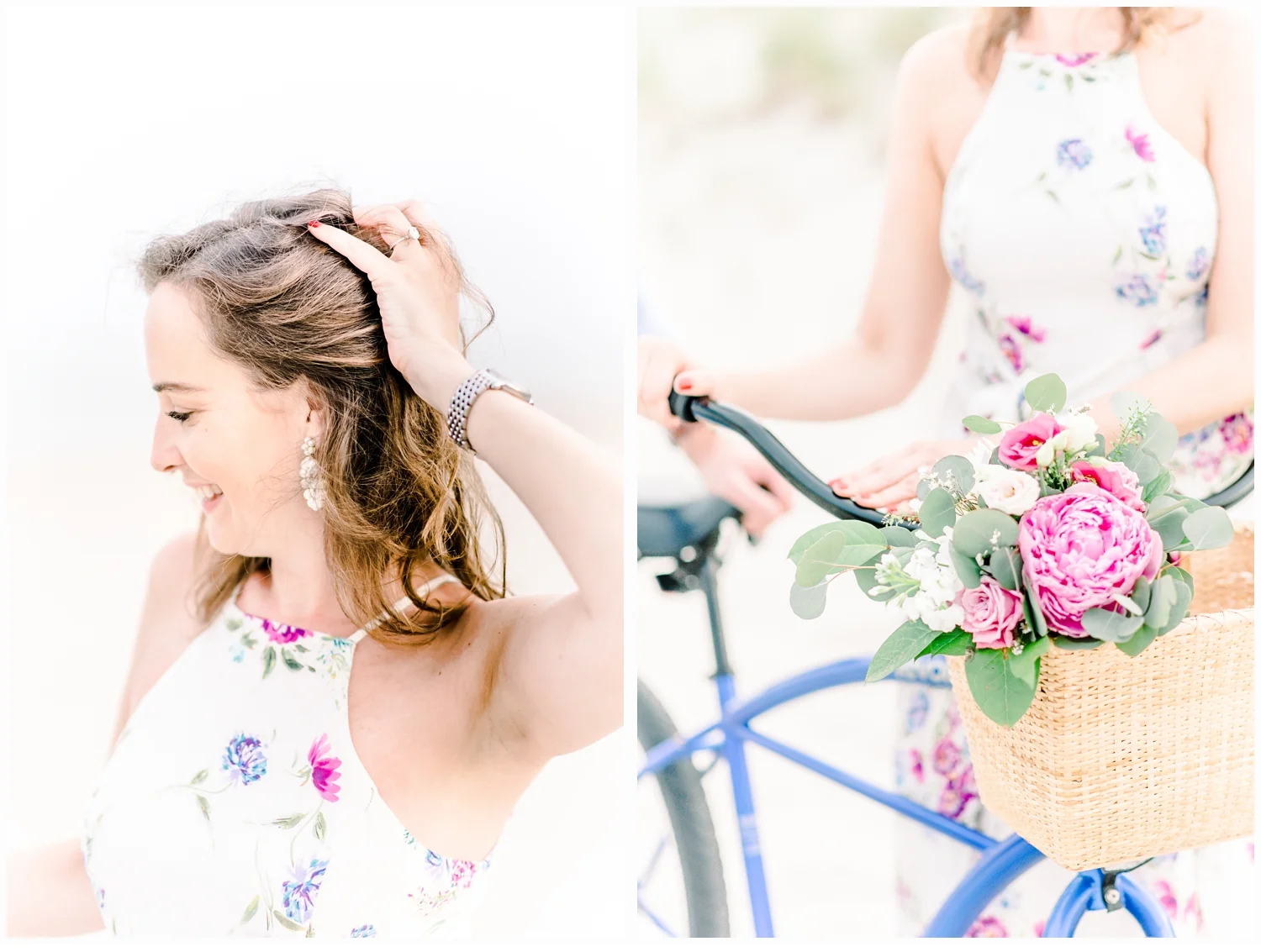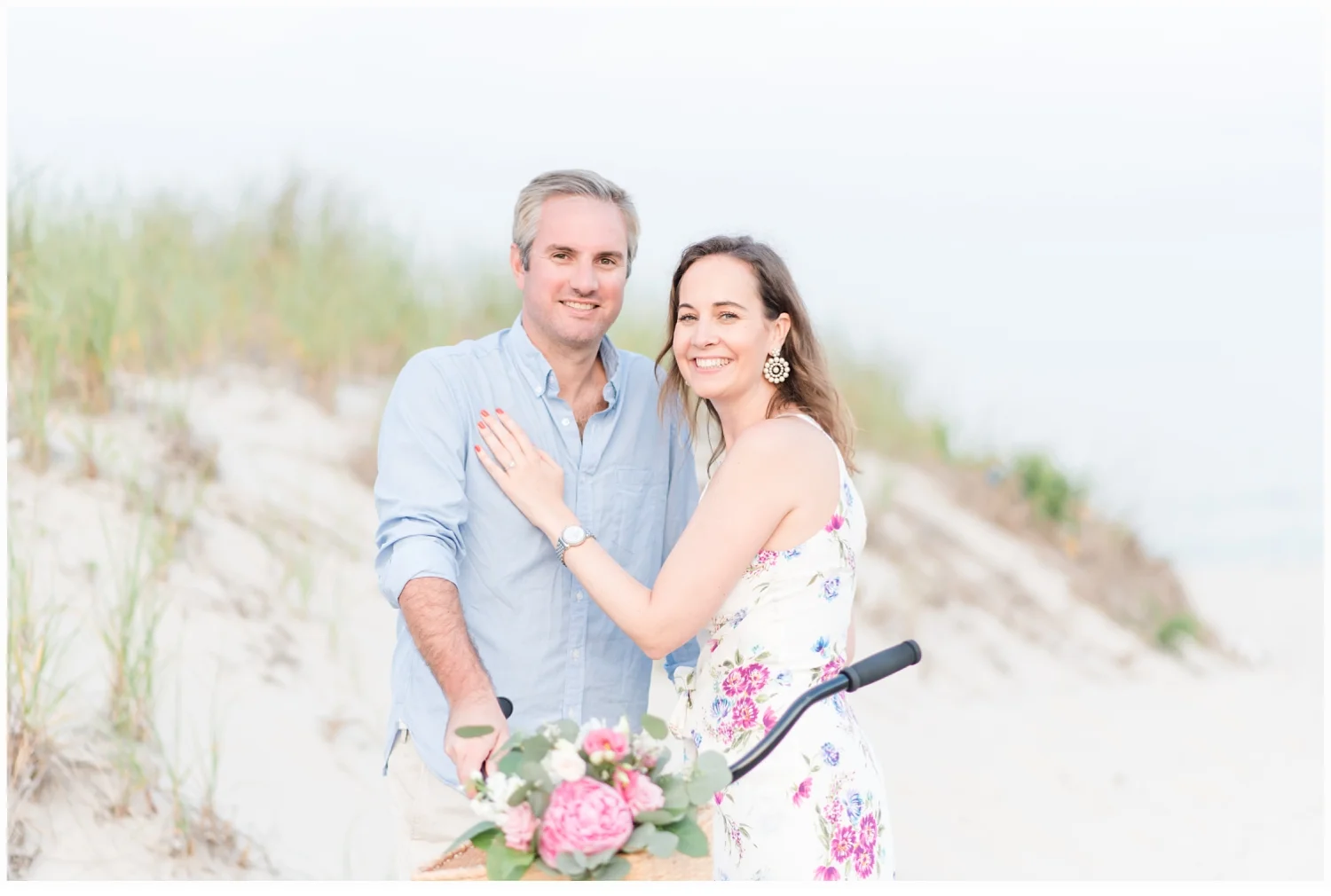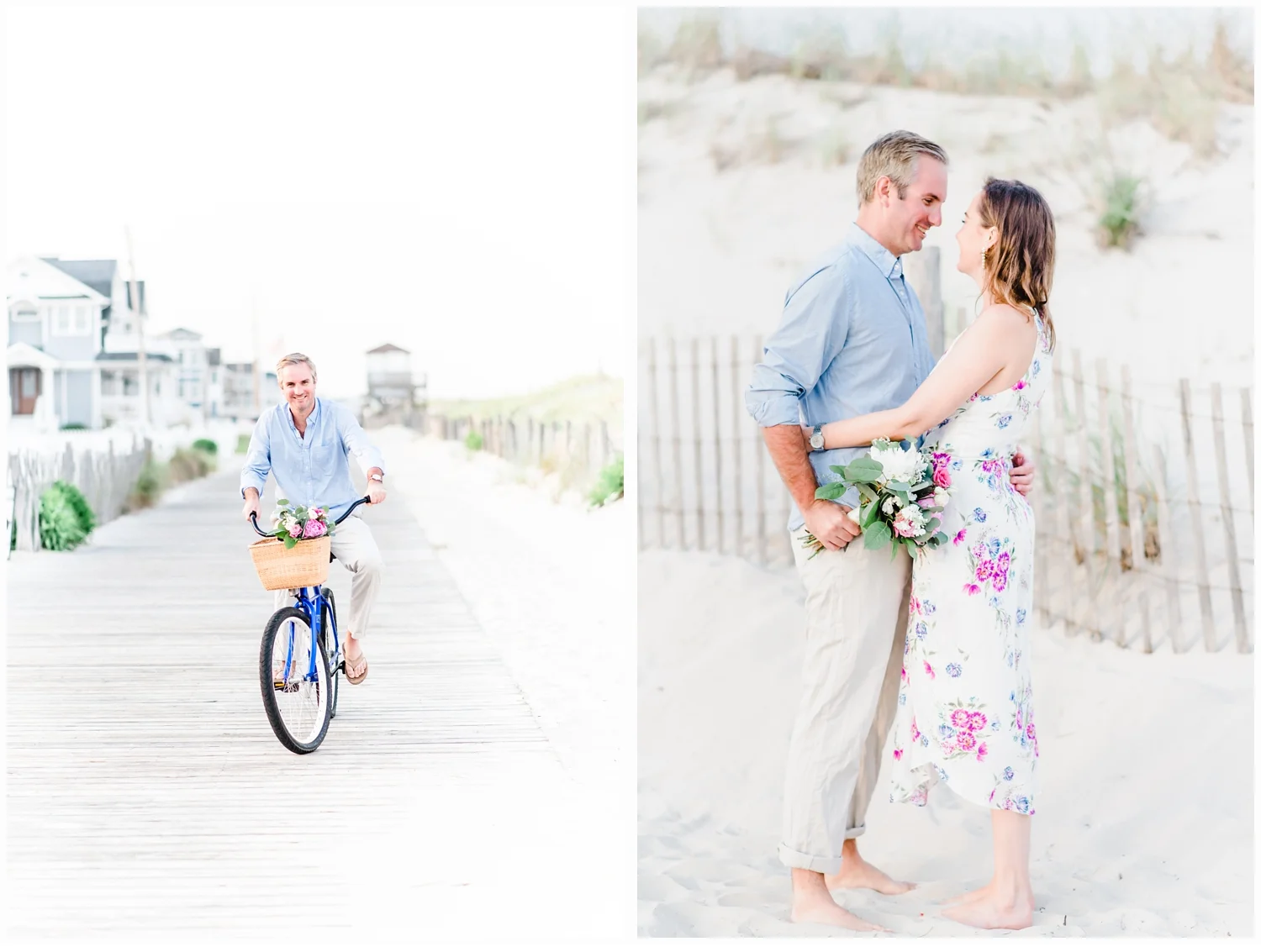 Jeanine’s family has an adorable beach house in Lavallette, New Jersey so the wheels started spinning in my head as I started planning and thinking about their perfect session. With a beautiful beach cruiser and gorgeous flowers, pretty pretty outfits, and a beautiful couple, my vision for their session came to life. Jeanine and John have impeccable taste to say the least and they totally rocked it! She chose a beautiful floral dress designed by “Privacy Please” and John’s attire was by J. Crew. The beautiful floral bouquet was designed by Flowers by Melinda and it was perfect!