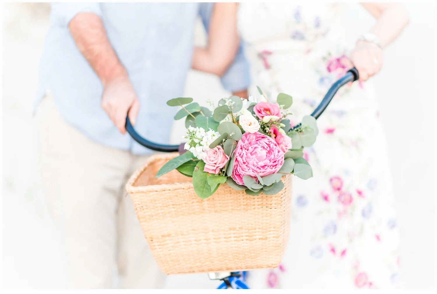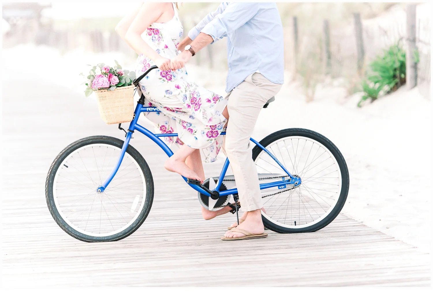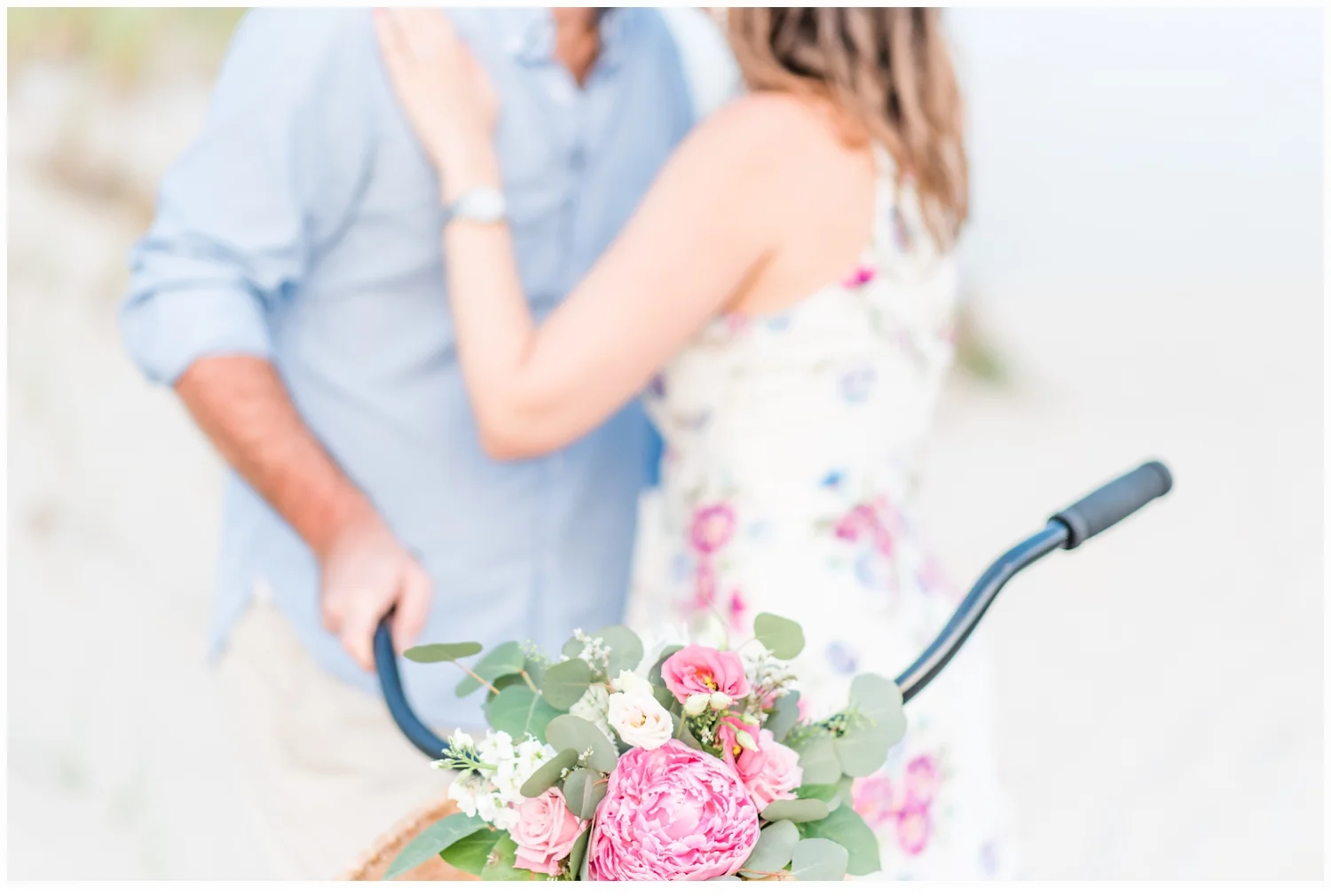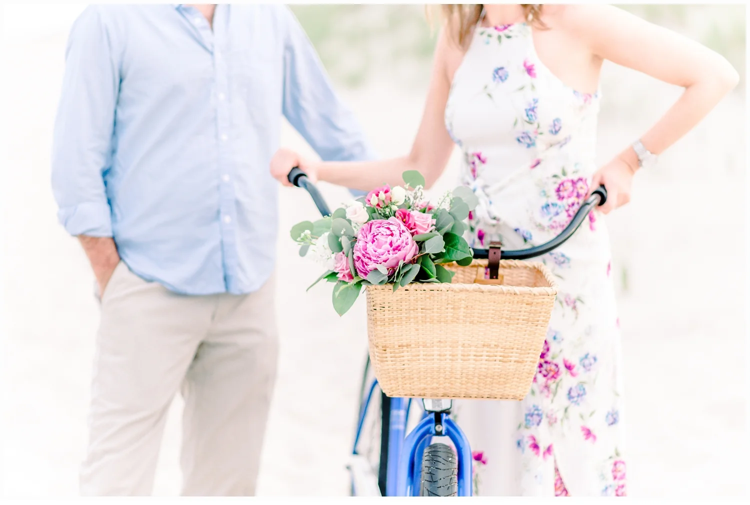 Jeanine’s family has an adorable beach house in Lavallette, New Jersey so the wheels started spinning in my head as I started planning and thinking about their perfect session. With a beautiful beach cruiser and gorgeous flowers, pretty pretty outfits, and a beautiful couple, my vision for their session came to life. Jeanine and John have impeccable taste to say the least and they totally rocked it! She chose a beautiful floral dress designed by “Privacy Please” and John’s attire was by J. Crew. The beautiful floral bouquet was designed by Flowers by Melinda and it was perfect!
