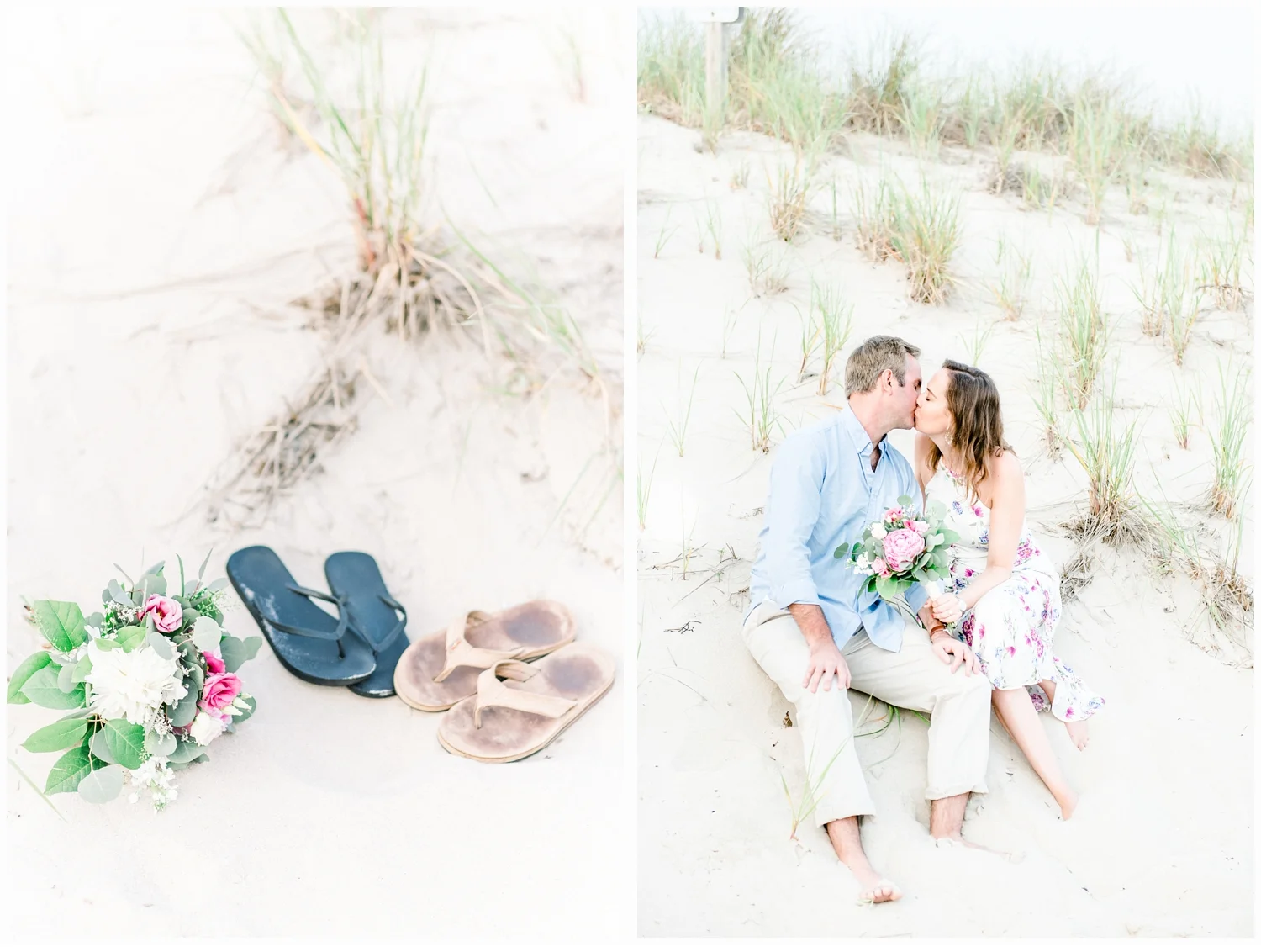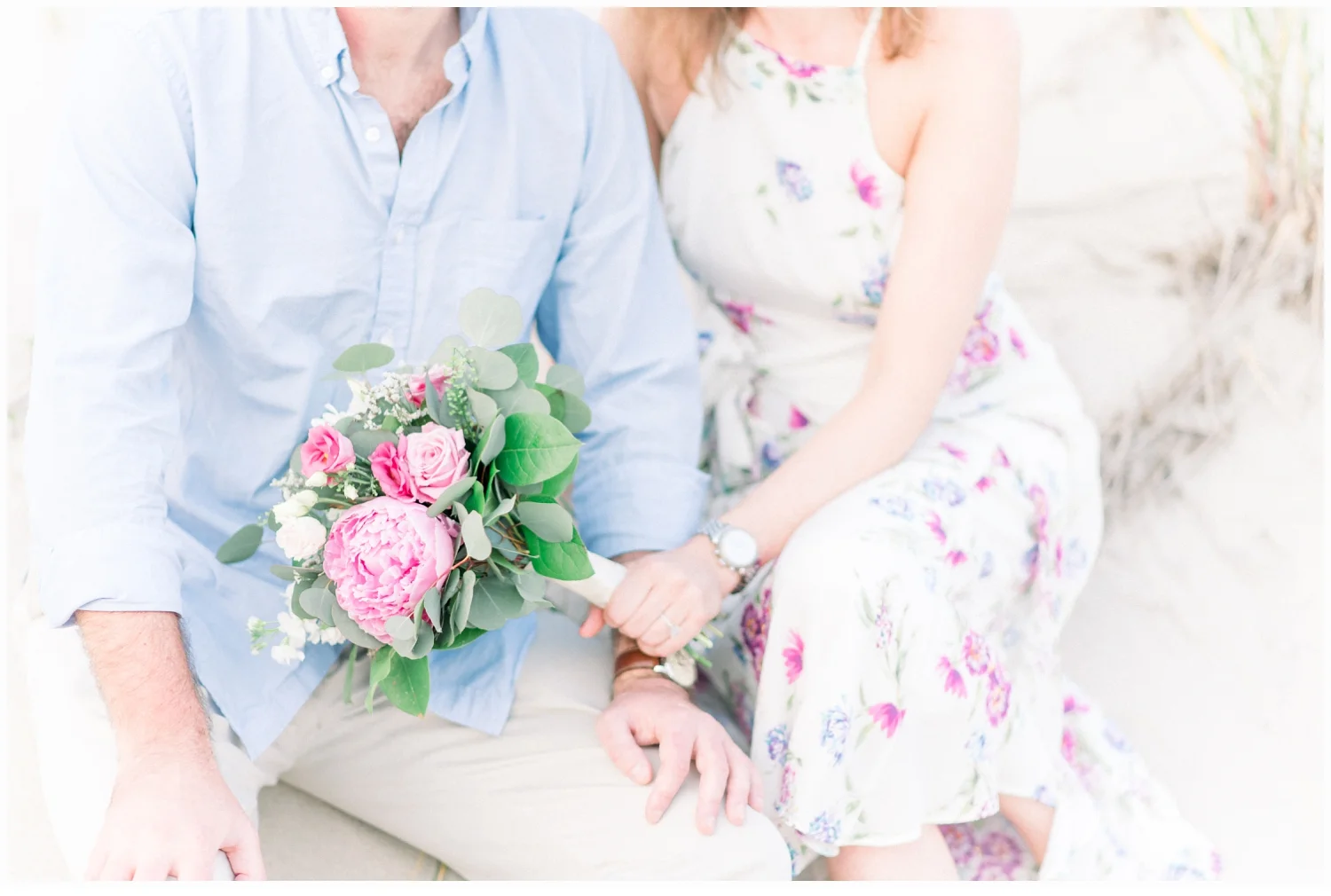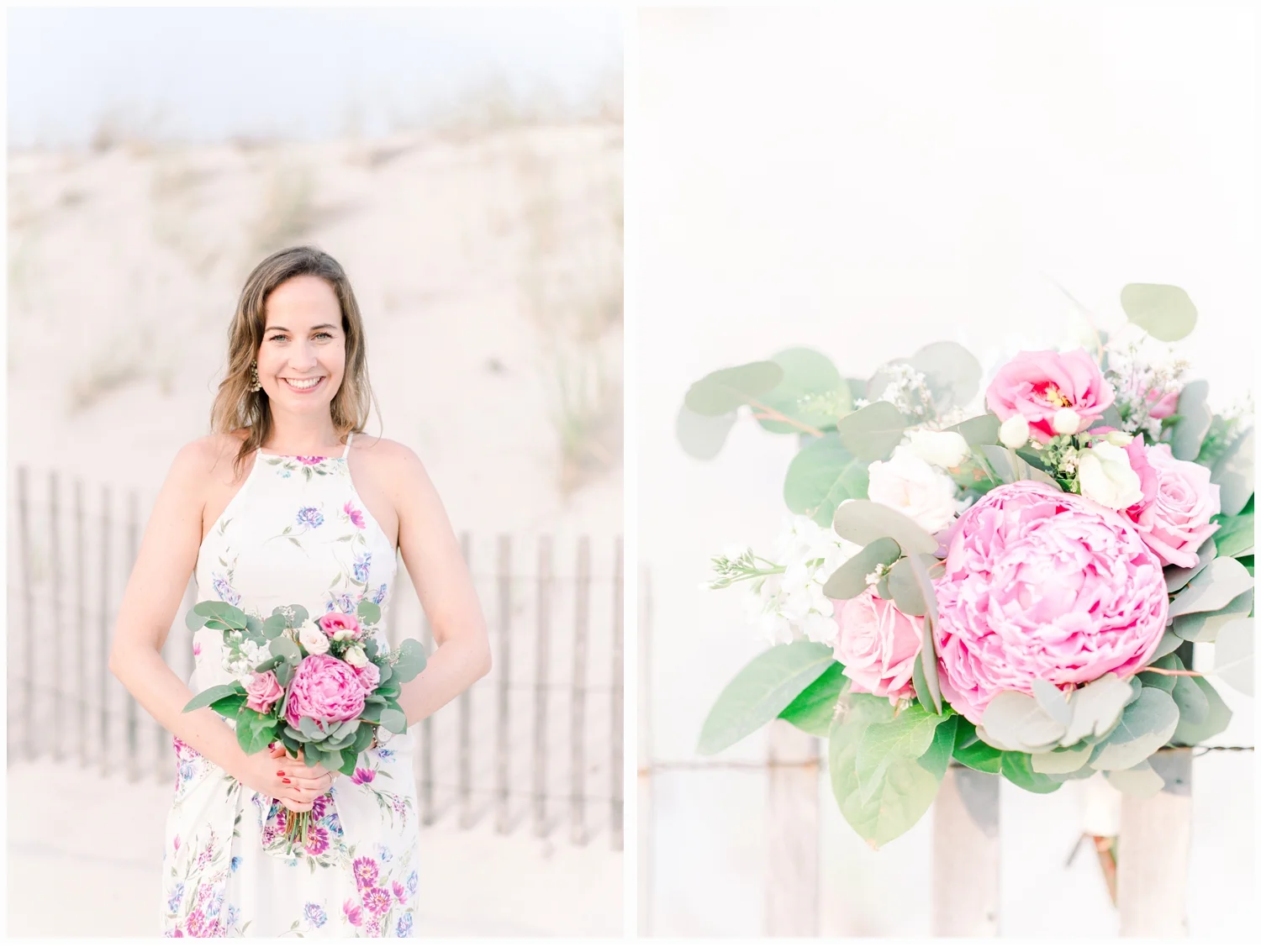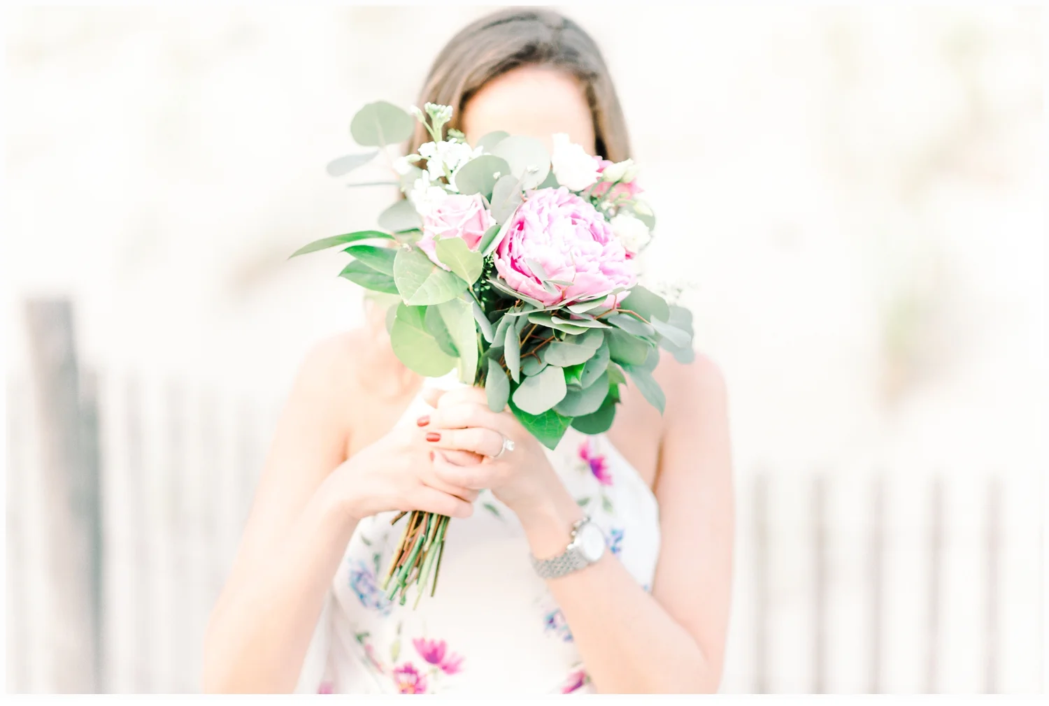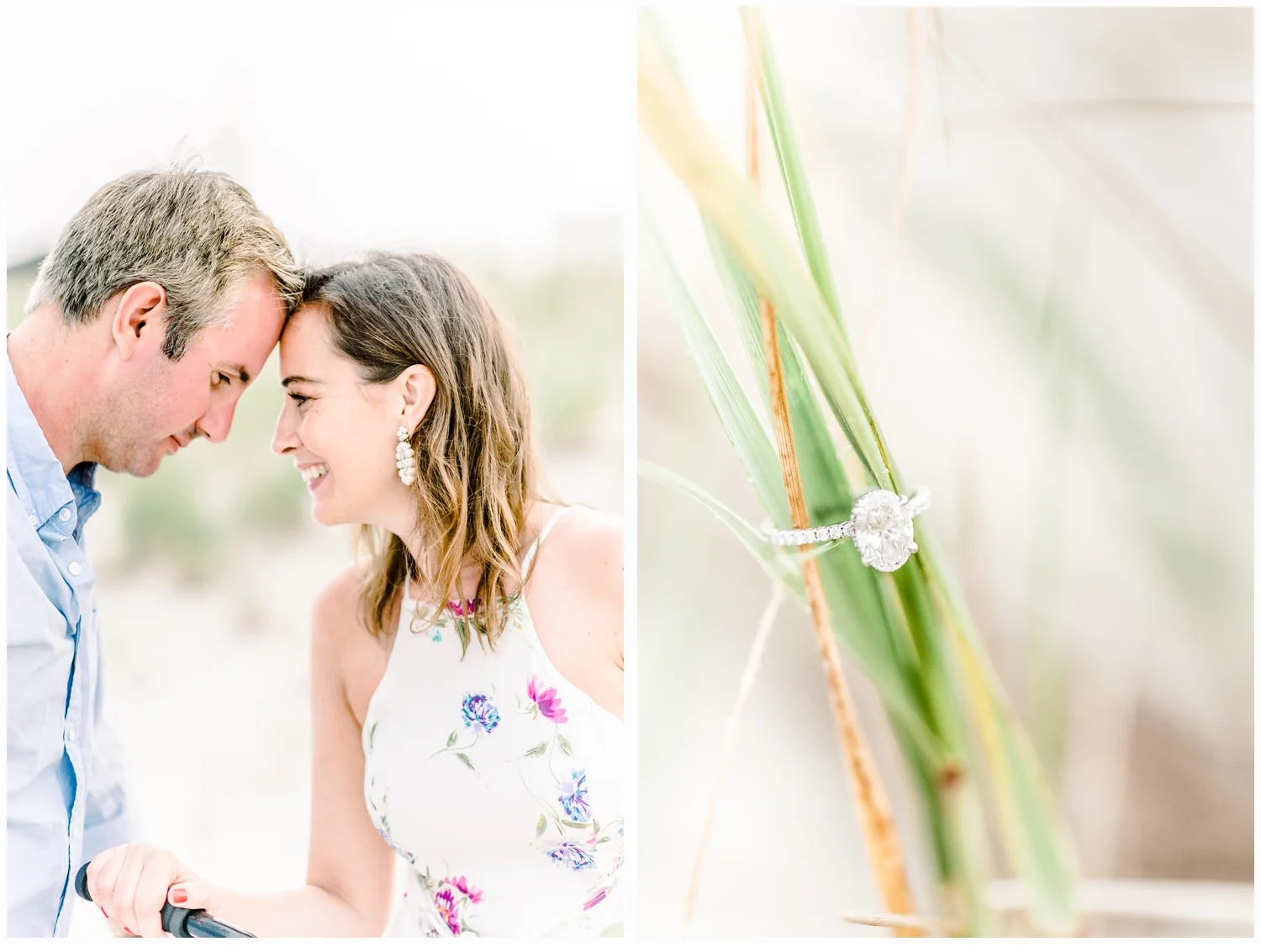 Jeanine’s family has an adorable beach house in Lavallette, New Jersey so the wheels started spinning in my head as I started planning and thinking about their perfect session. With a beautiful beach cruiser and gorgeous flowers, pretty pretty outfits, and a beautiful couple, my vision for their session came to life. Jeanine and John have impeccable taste to say the least and they totally rocked it! She chose a beautiful floral dress designed by “Privacy Please” and John’s attire was by J. Crew. The beautiful floral bouquet was designed by Flowers by Melinda and it was perfect!