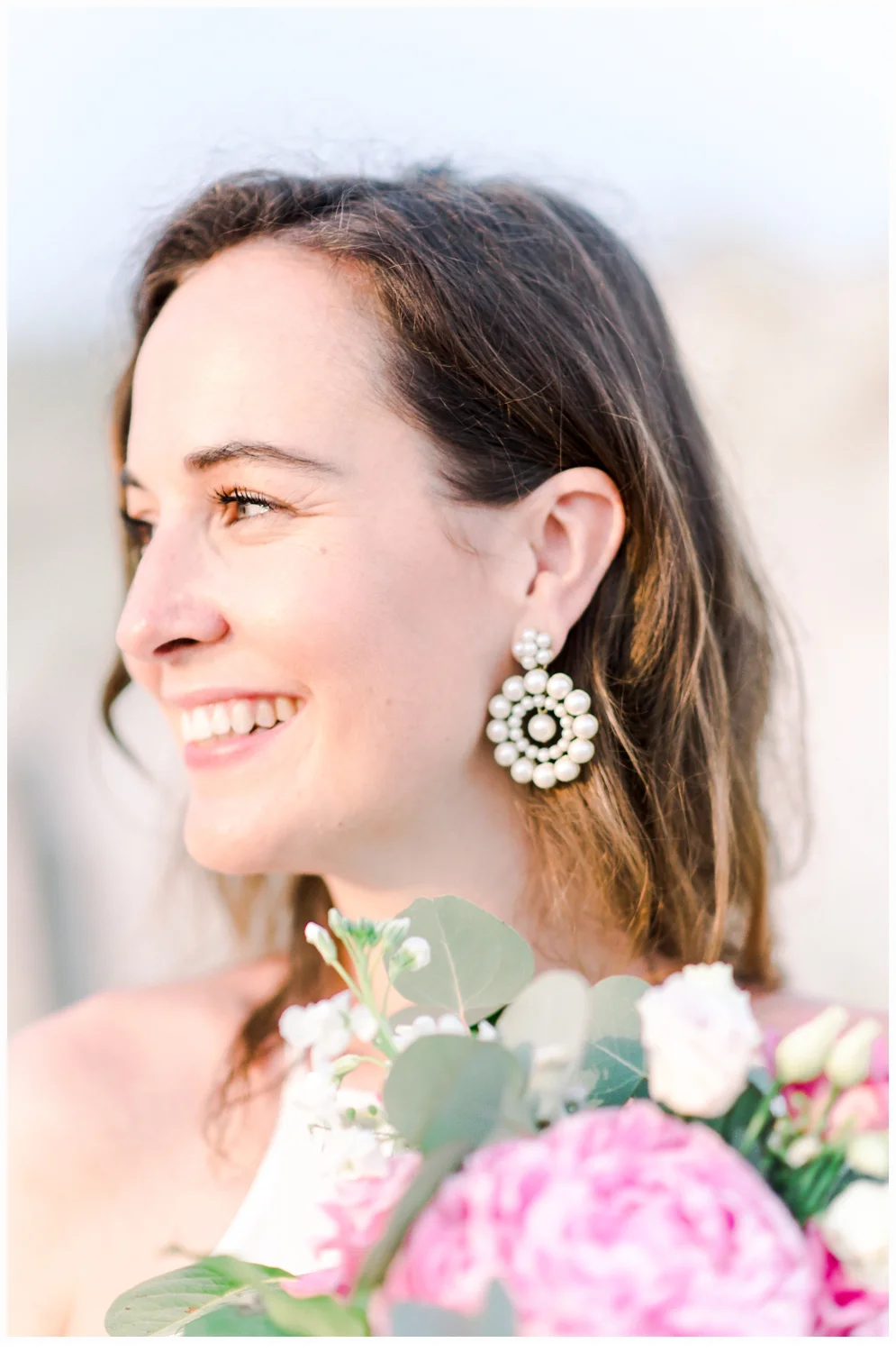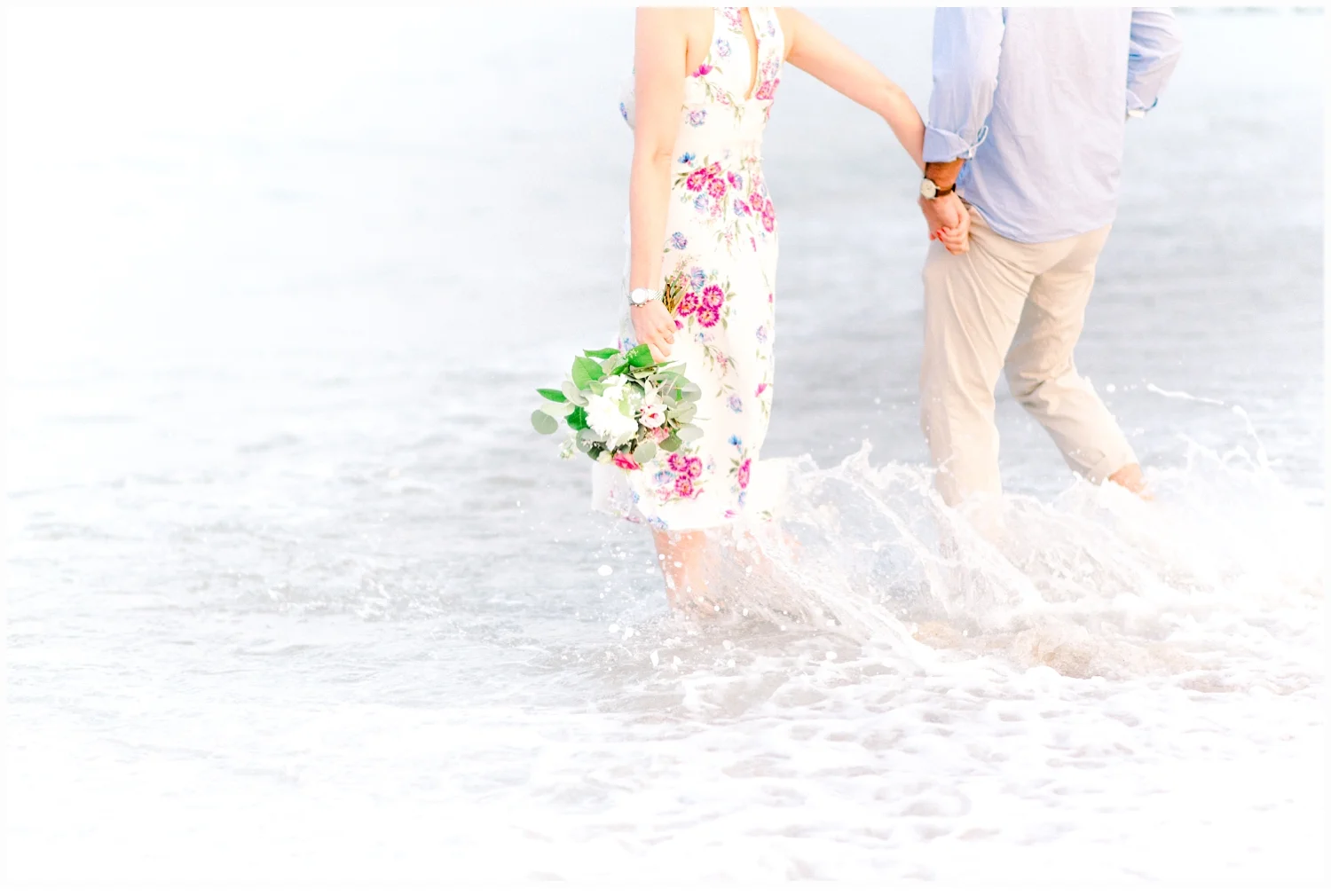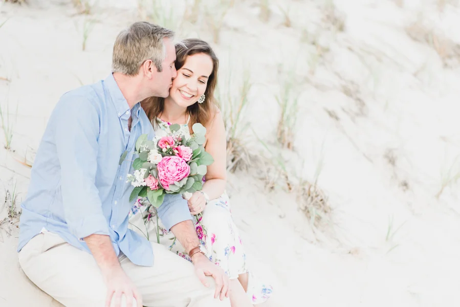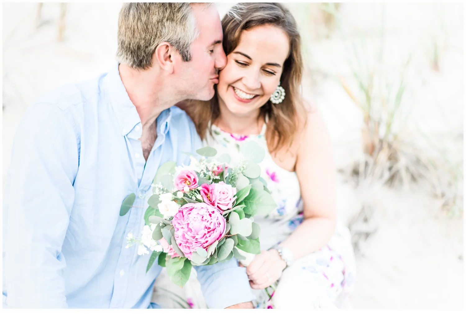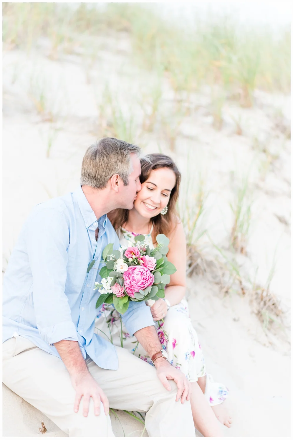 Jeanine’s family has an adorable beach house in Lavallette, New Jersey so the wheels started spinning in my head as I started planning and thinking about their perfect session. With a beautiful beach cruiser and gorgeous flowers, pretty pretty outfits, and a beautiful couple, my vision for their session came to life. Jeanine and John have impeccable taste to say the least and they totally rocked it! She chose a beautiful floral dress designed by “Privacy Please” and John’s attire was by J. Crew. The beautiful floral bouquet was designed by Flowers by Melinda and it was perfect!