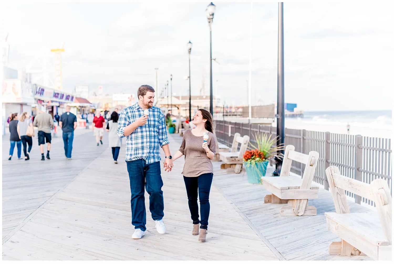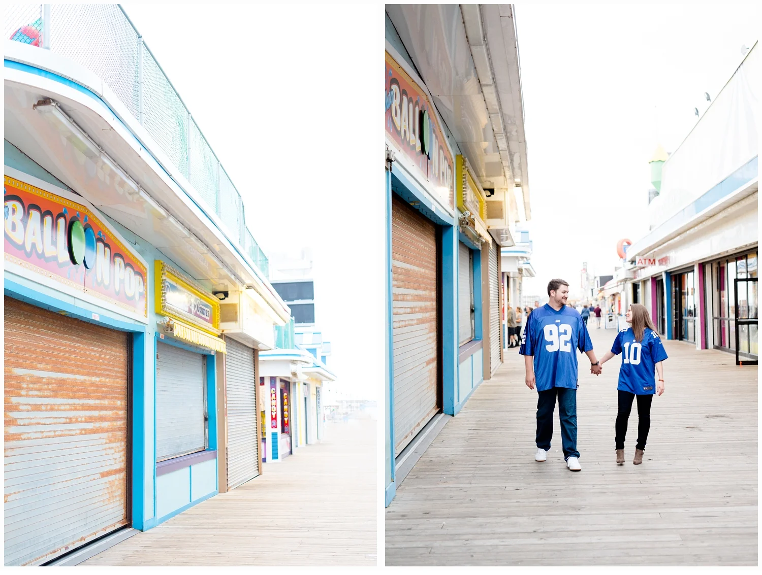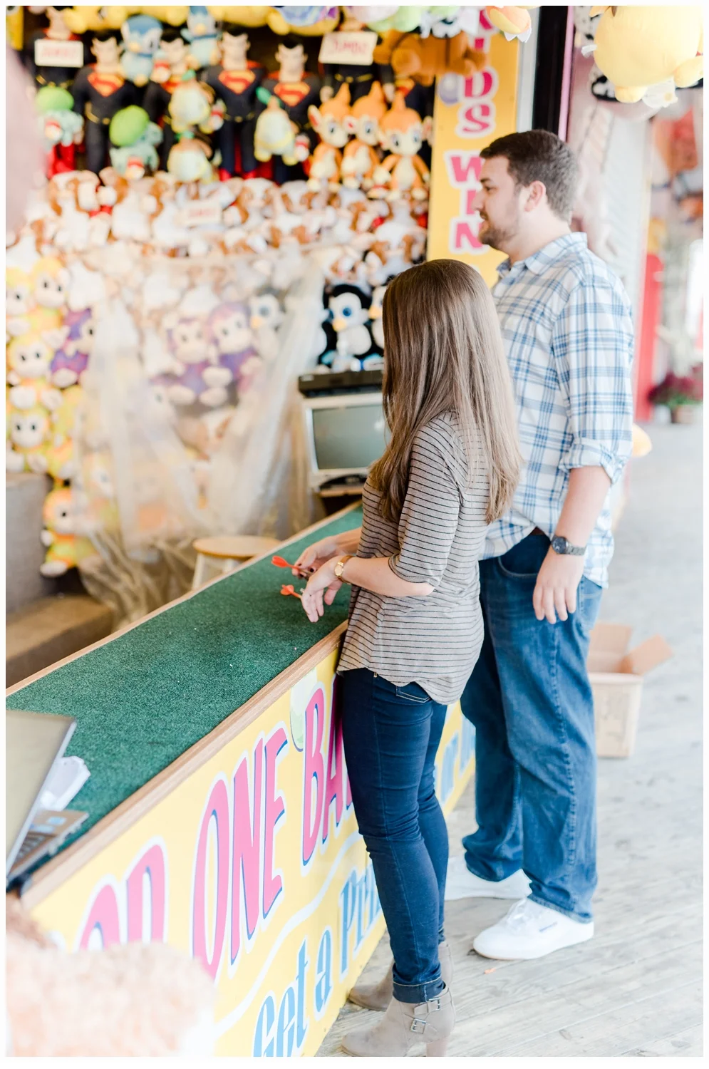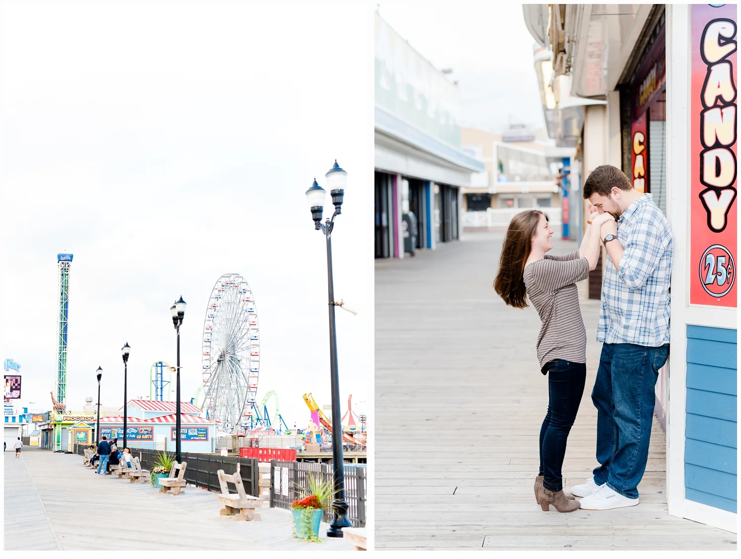 We planned their session for October, so we were not sure about the weather, but to our delight, it was about 80 degrees and perfect.! They were so cute together and spontaneous, that I could not get enough of their love!!! After we had finished on the beach, they did a quick change of clothes and we all headed out to Seaside Boardwalk, which is such a fun backdrop with all of the pretty colors and rides for the remainder of our session! Alyssa had spent many years enjoying all of the amusements and now Jeff and Alyssa can enjoy them together!