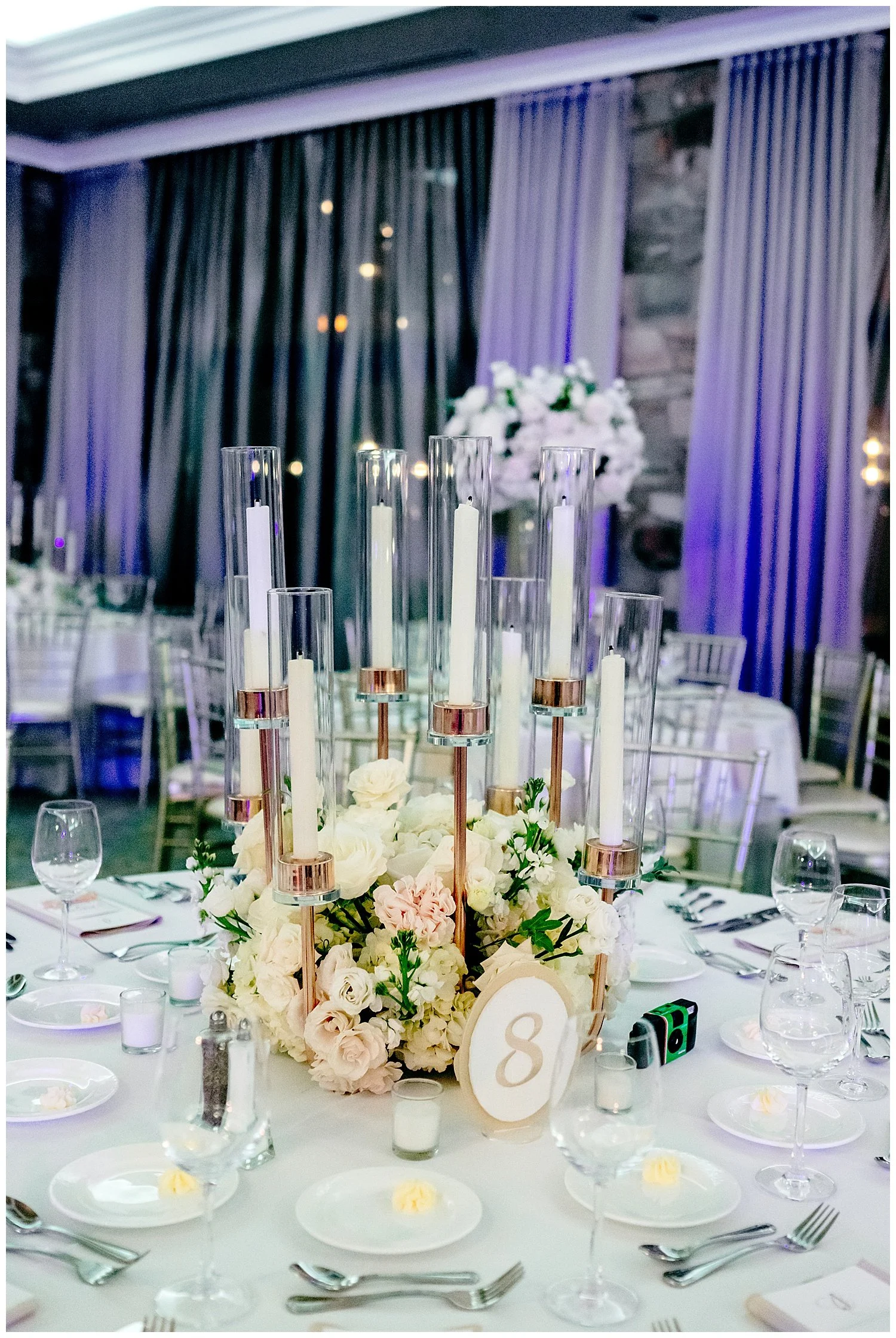 Claudia and Jack’s black-tie wedding embraced timeless elegance. Claudia looked stunning in her Justin Alexander wedding gown, complemented perfectly by the navy blue and light blue color palette throughout the wedding décor.