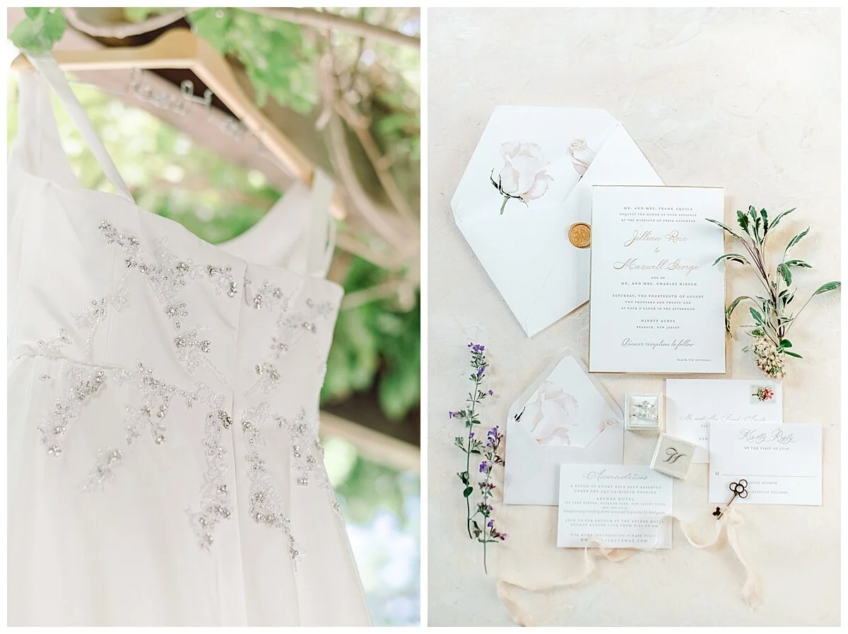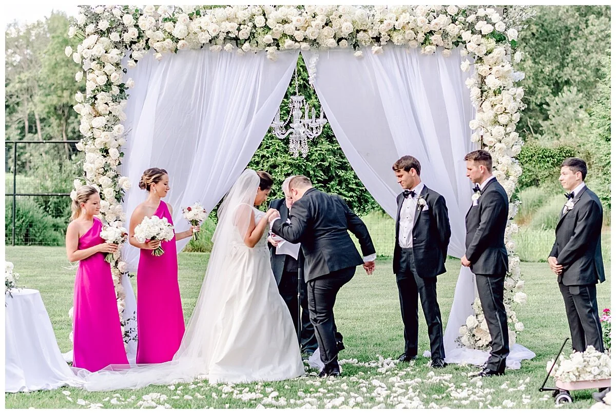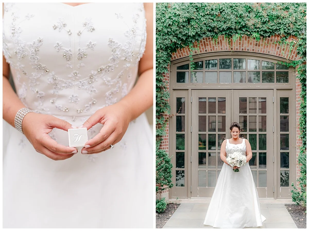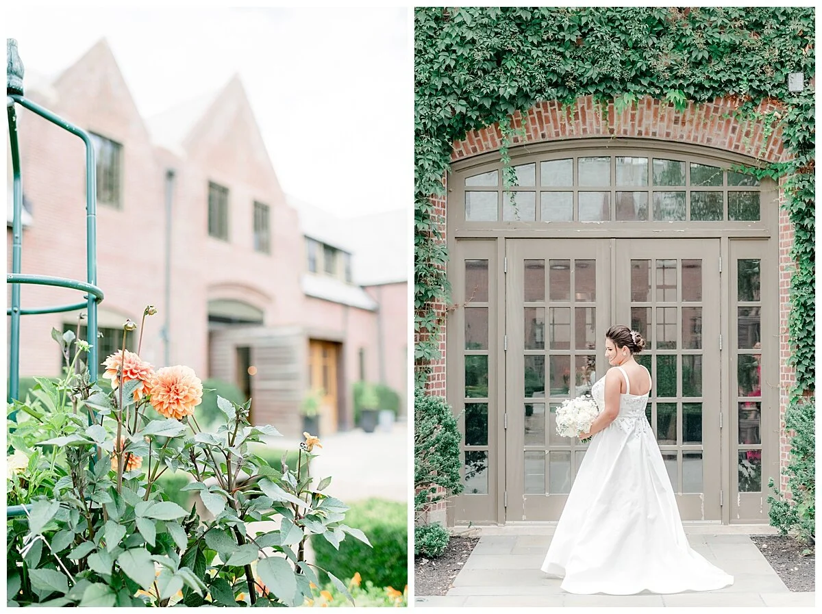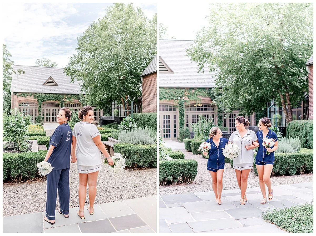 The first moments captured were of the bridal party’s hair and makeup preparations. The bridal party got ready while wearing picture perfect pajamas that were too cute to pass up for portraits! The bride and her party were taken outside to the beautifully landscaped gardens for photos. When everyone was dressed, we took more photos within the walls of the majestic Ninety Acres property. There is the most beautiful little archway in the gardens where we captured some beautiful portraits and family photos.