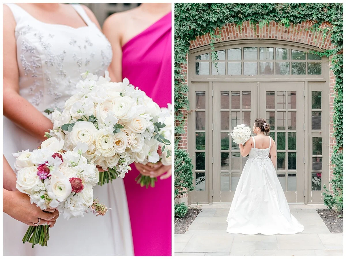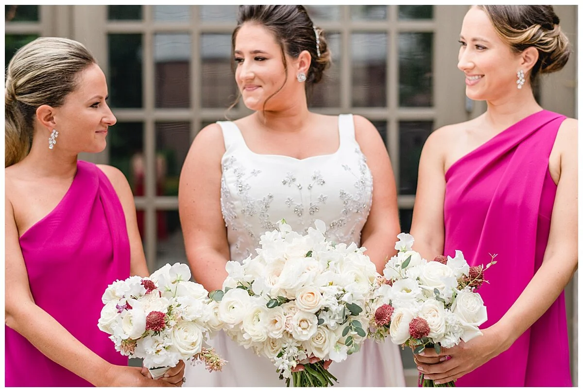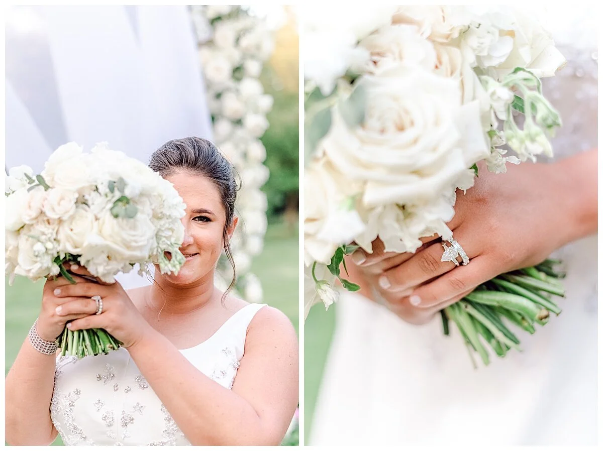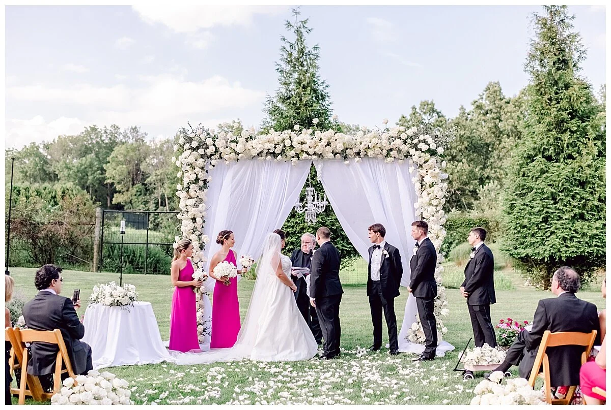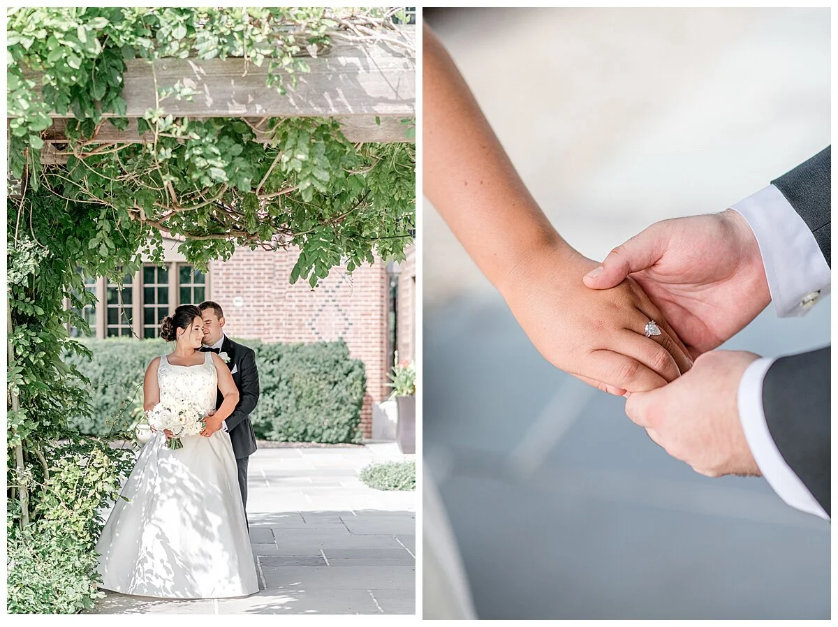 The first moments captured were of the bridal party’s hair and makeup preparations. The bridal party got ready while wearing picture perfect pajamas that were too cute to pass up for portraits! The bride and her party were taken outside to the beautifully landscaped gardens for photos. When everyone was dressed, we took more photos within the walls of the majestic Ninety Acres property. There is the most beautiful little archway in the gardens where we captured some beautiful portraits and family photos.