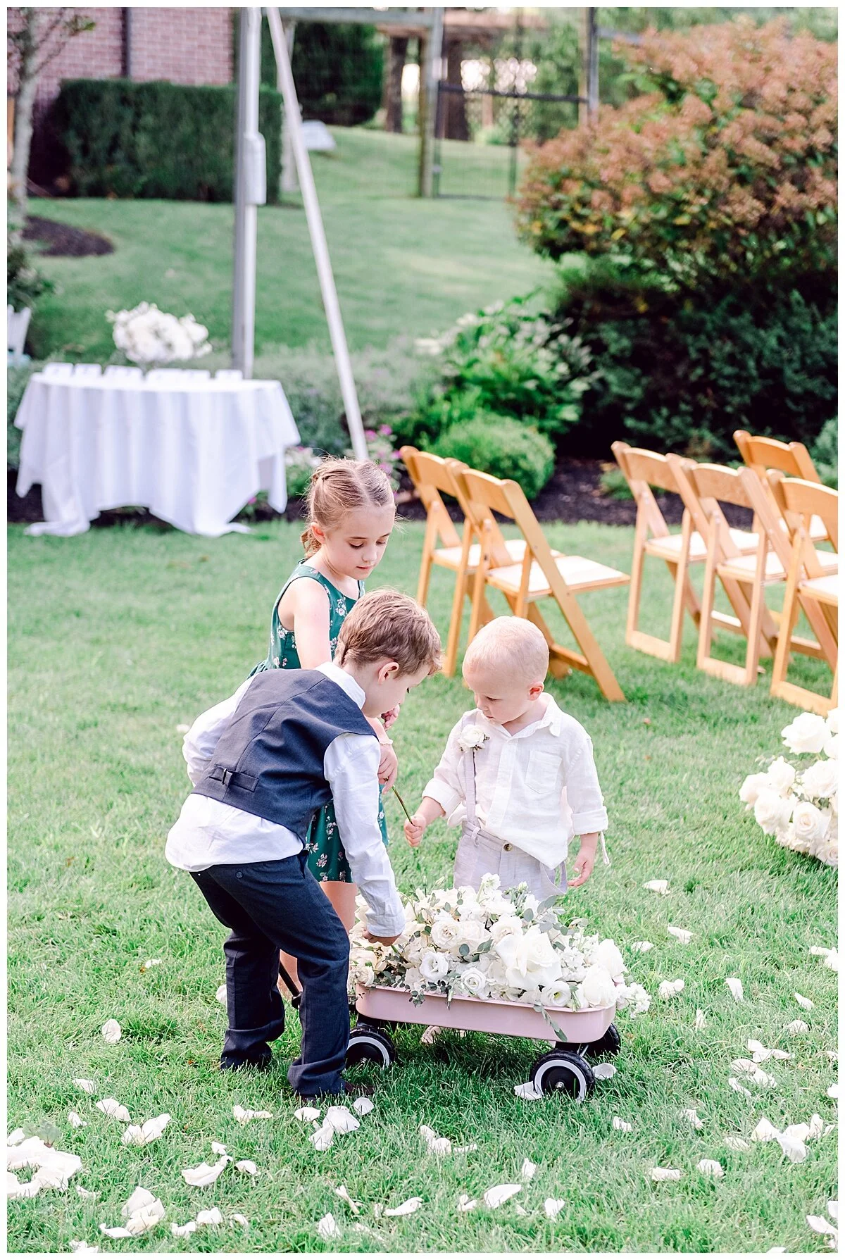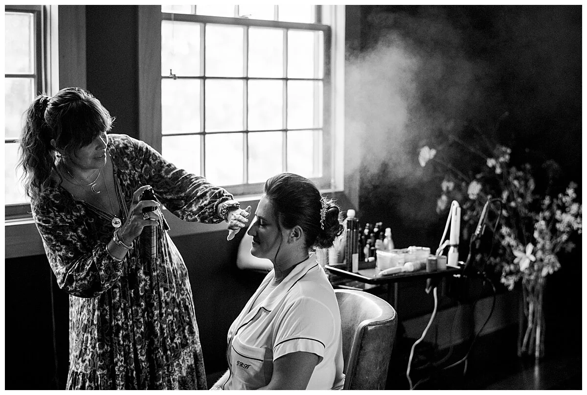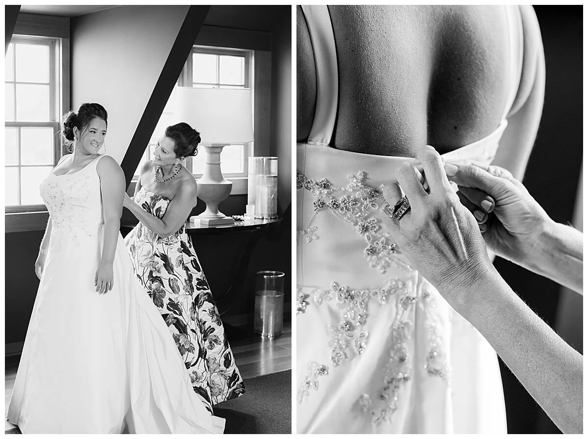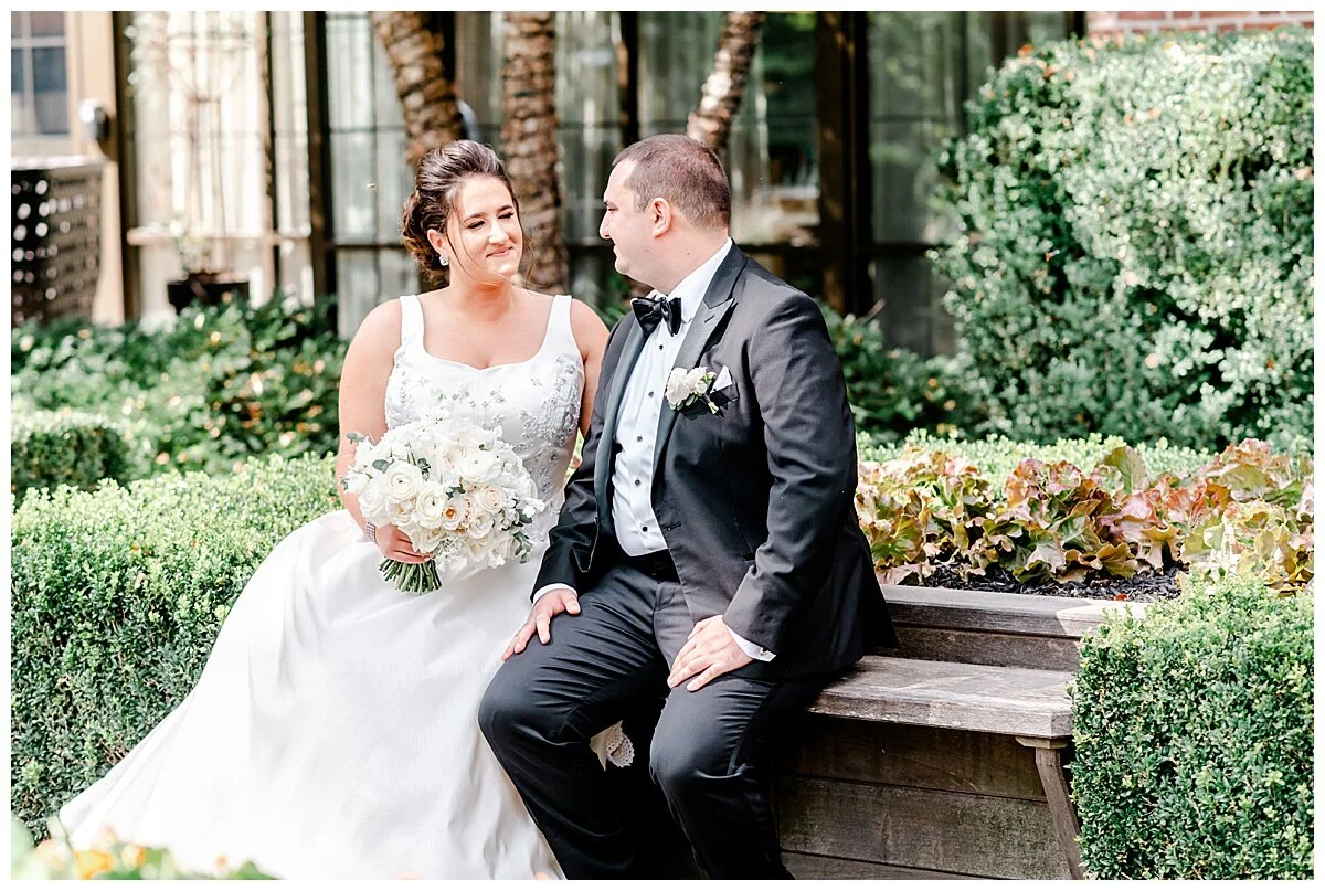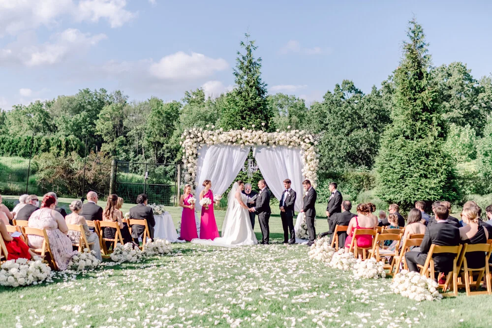The first moments captured were of the bridal party’s hair and makeup preparations. The bridal party got ready while wearing picture perfect pajamas that were too cute to pass up for portraits! The bride and her party were taken outside to the beautifully landscaped gardens for photos. When everyone was dressed, we took more photos within the walls of the majestic Ninety Acres property. There is the most beautiful little archway in the gardens where we captured some beautiful portraits and family photos.