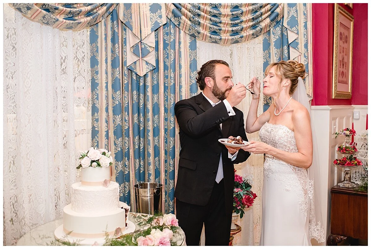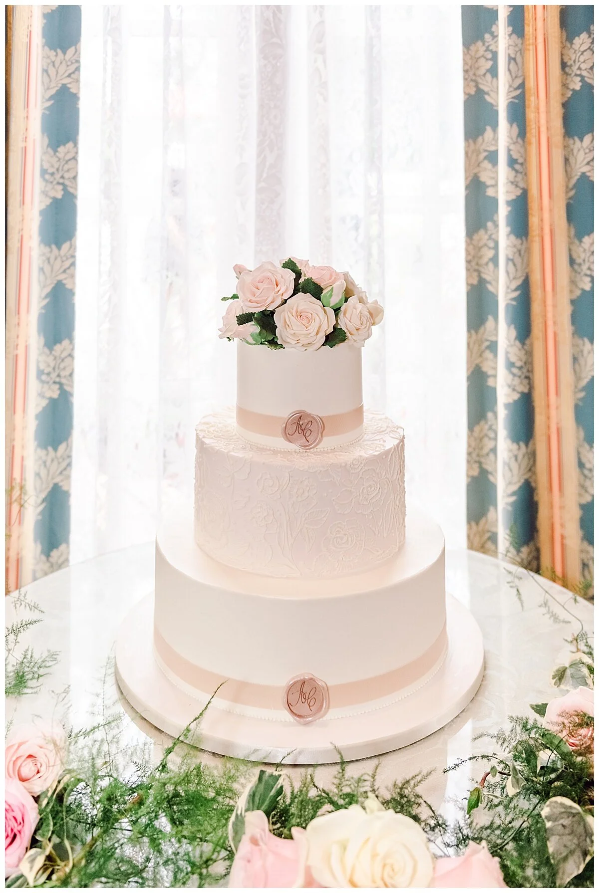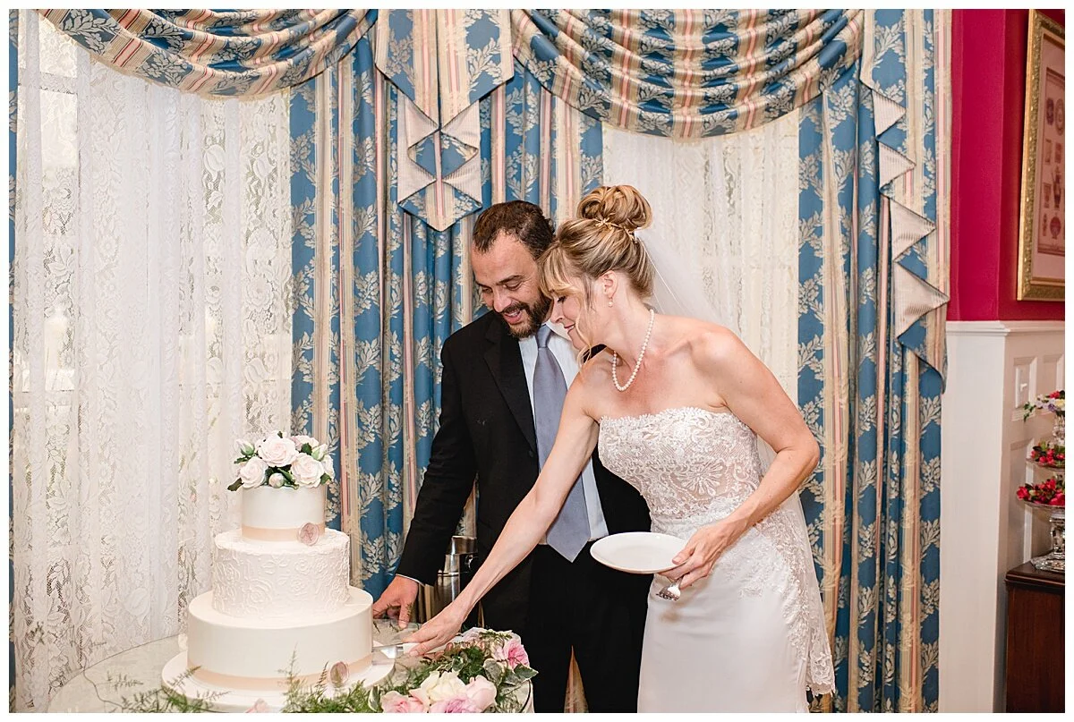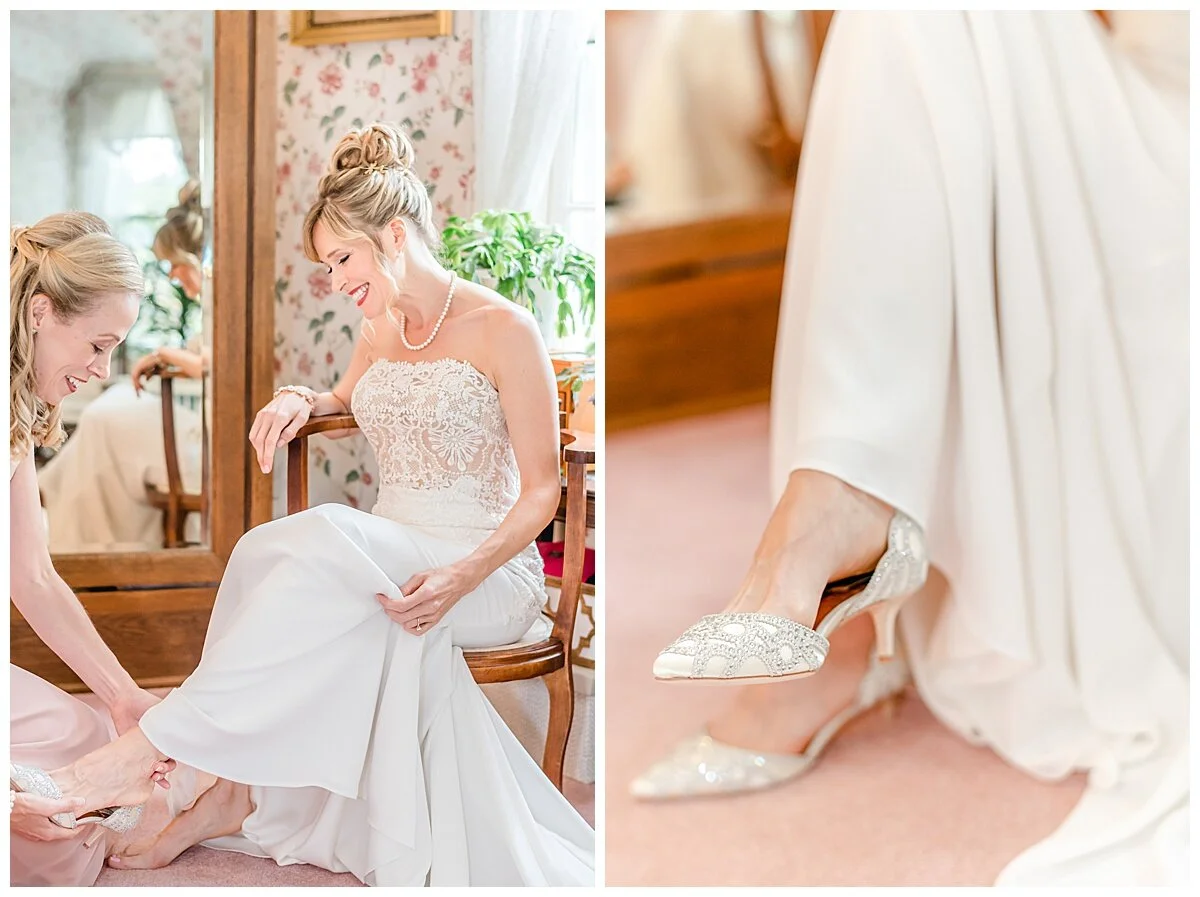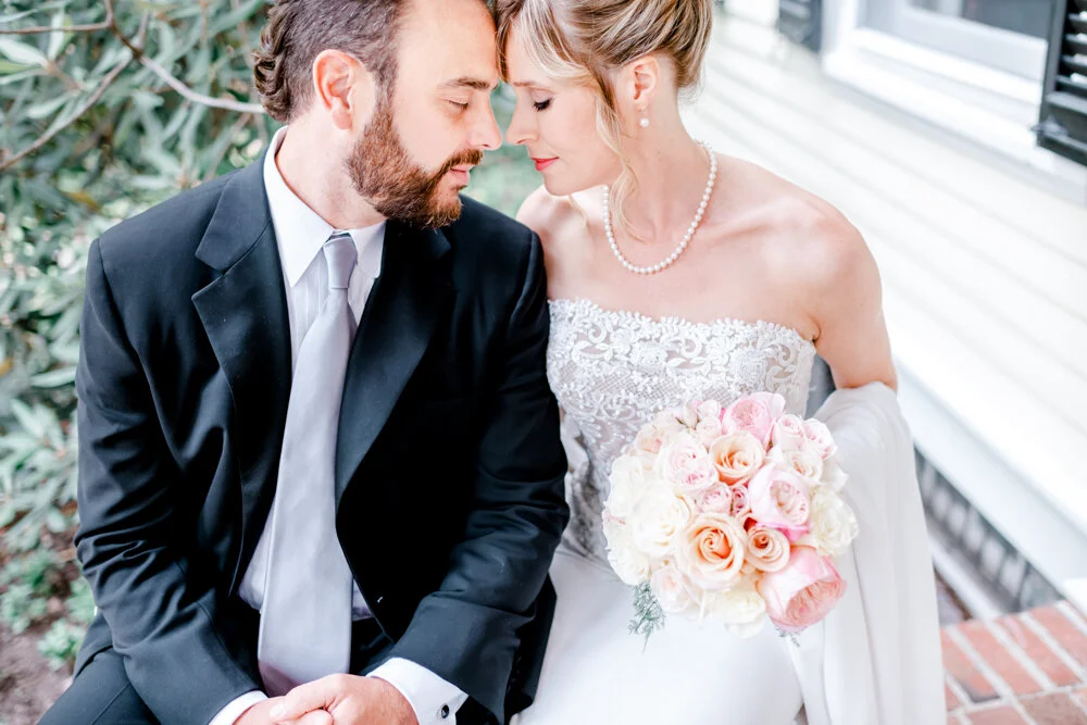 Photographer: deborahannphotography. Venue: Home. Bridal Hair: SY Bridal Styles. Florals: Back to Nature Shoes: Badgley Mischka. Tux: Brooks Brothers. Cake Baker: Sweet Sisters Invitations: Little Black Dress Paperie Bridal Gown: Pronovias