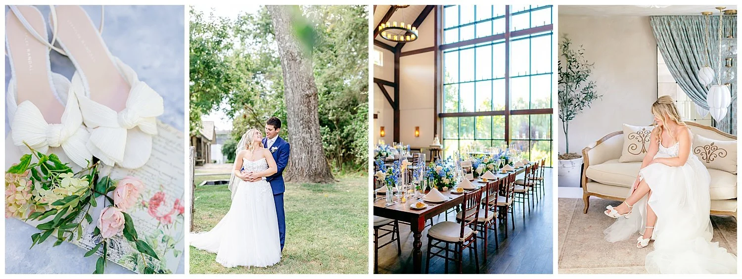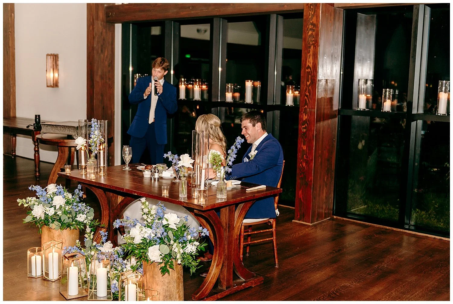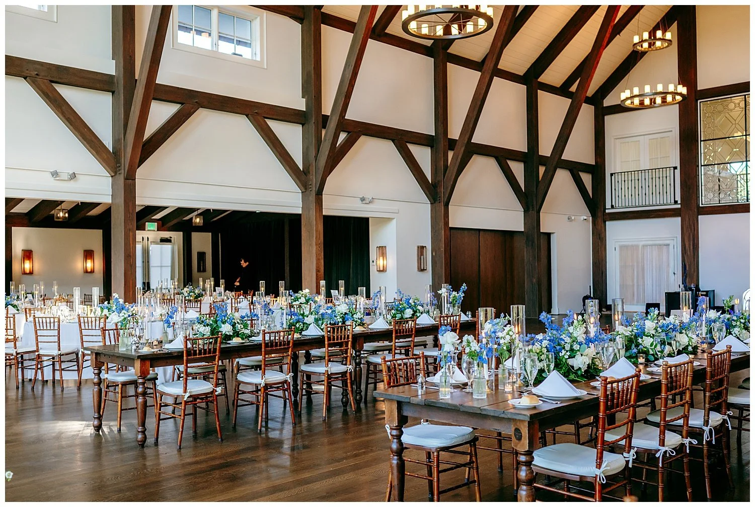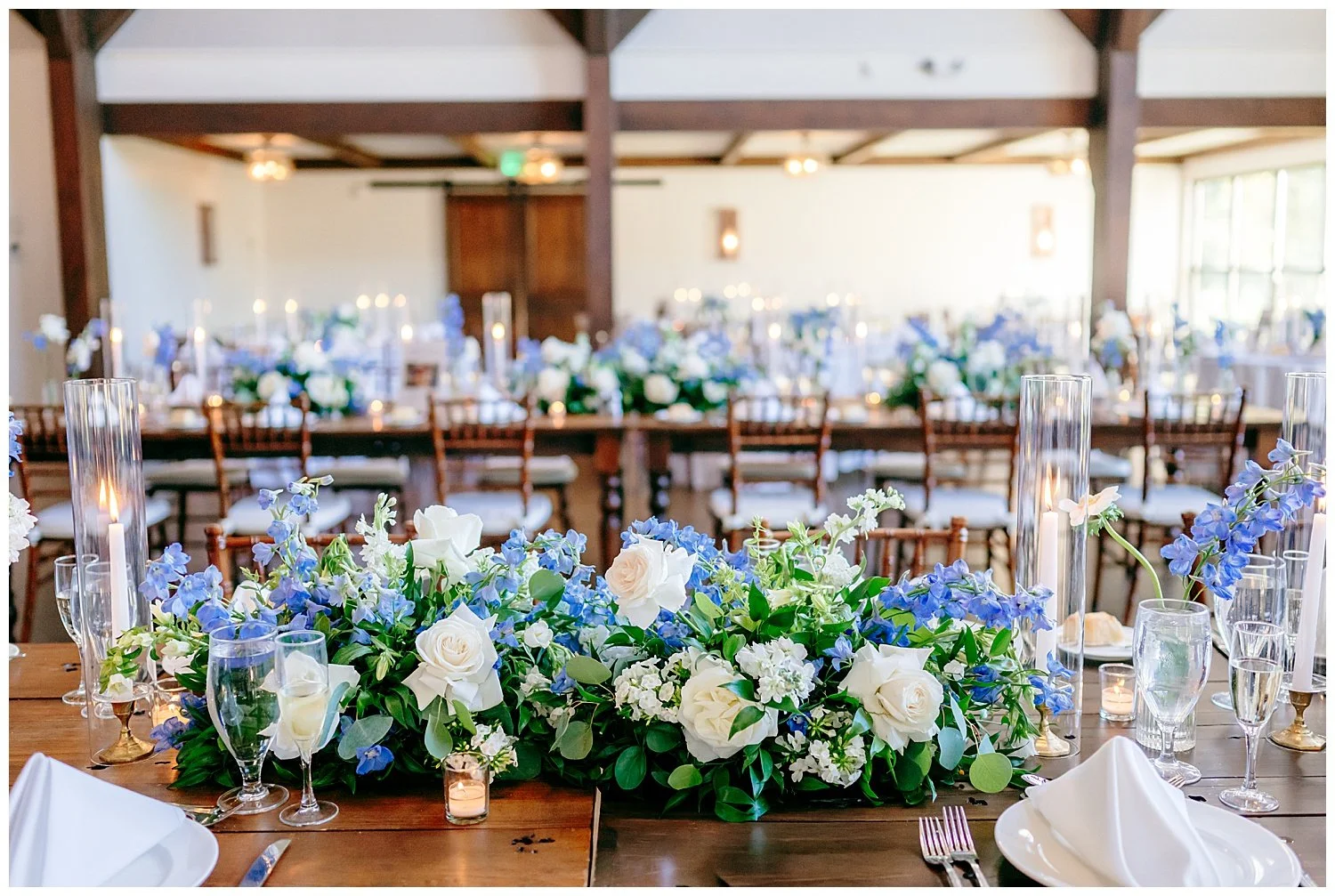 At the reception, guests enjoyed a warm and inviting atmosphere as they gathered around farm tables decorated with blue and white florals and greenery. Toasts were filled with laughter, the dance floor came alive, and the joy of the day carried late into the night.