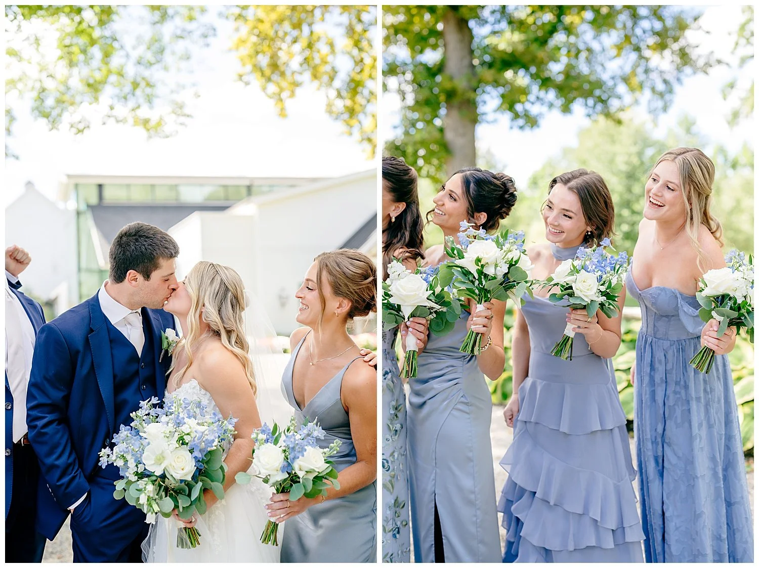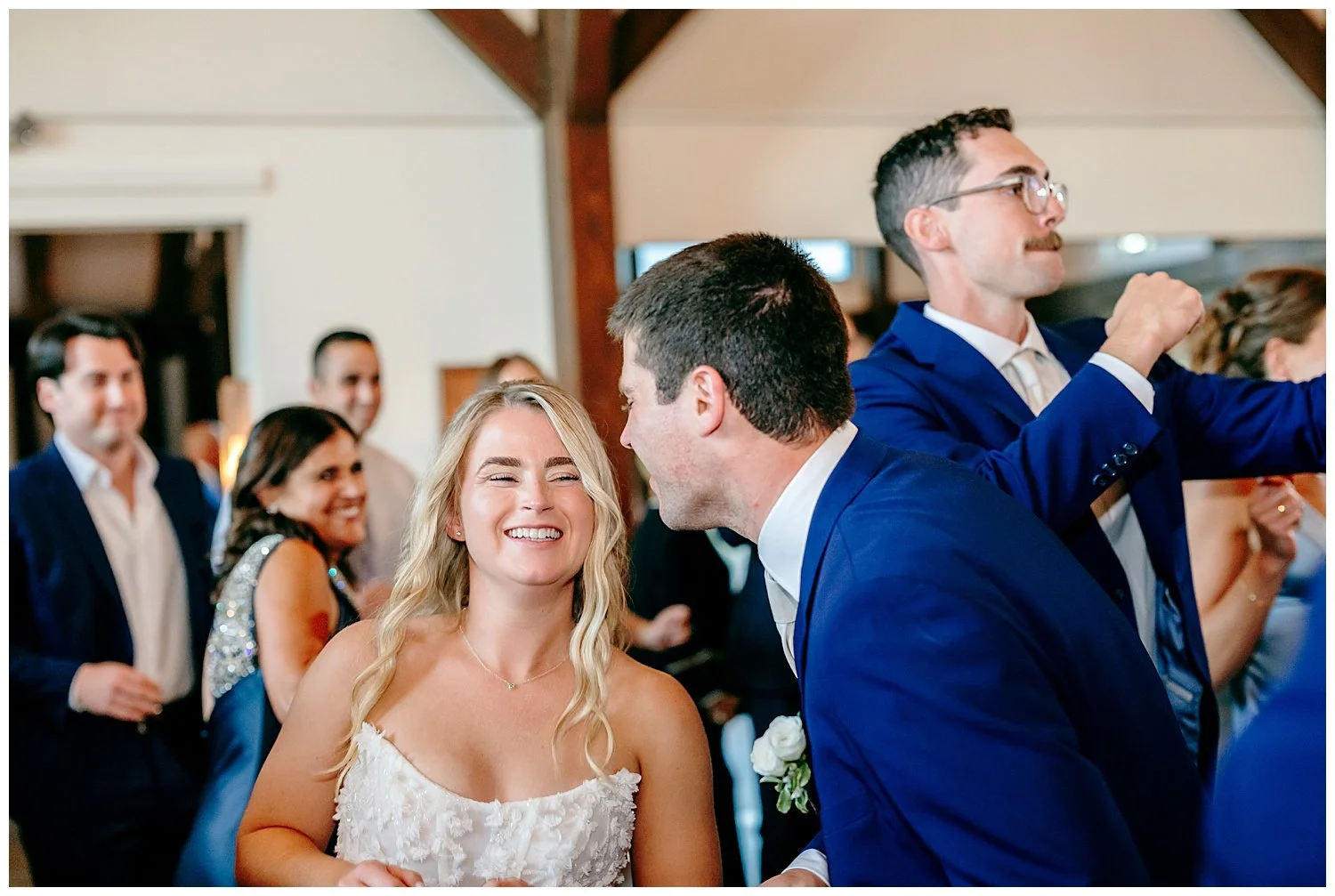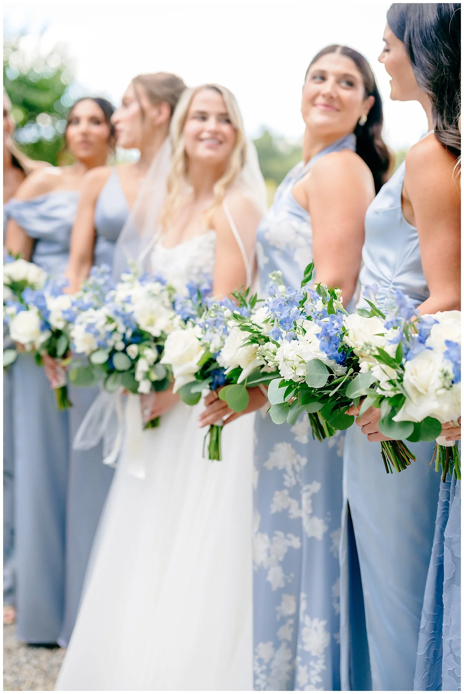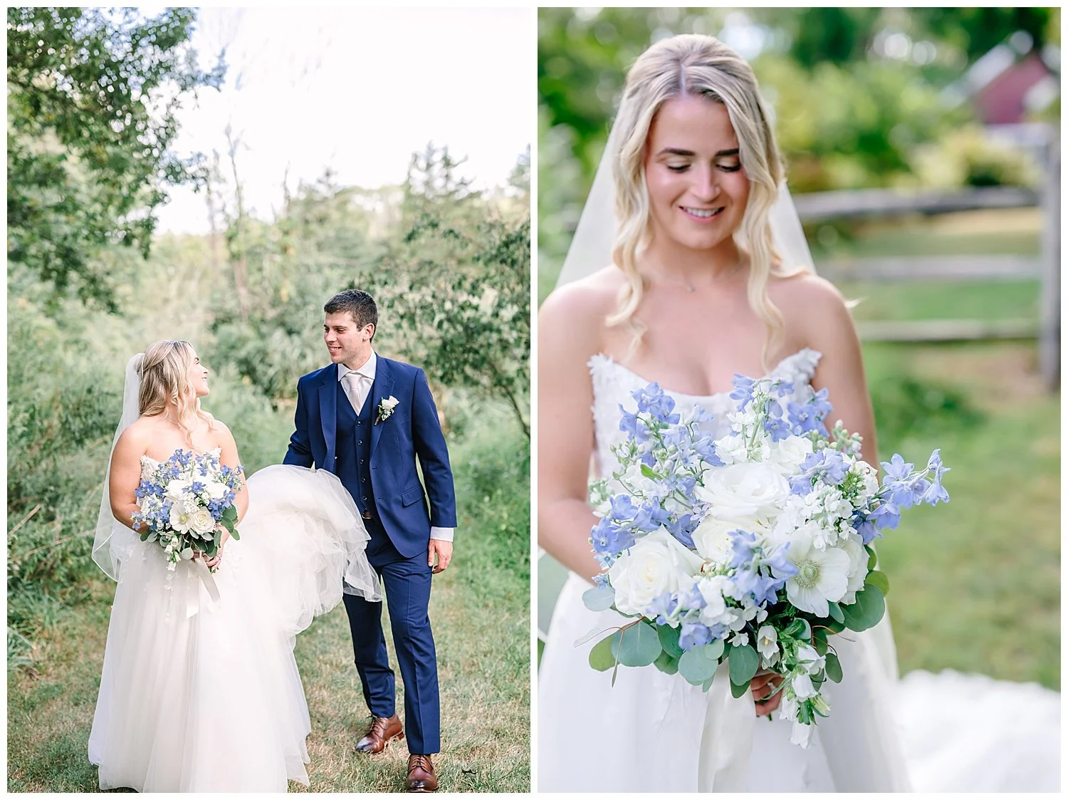 At the reception, guests enjoyed a warm and inviting atmosphere as they gathered around farm tables decorated with blue and white florals and greenery. Toasts were filled with laughter, the dance floor came alive, and the joy of the day carried late into the night.