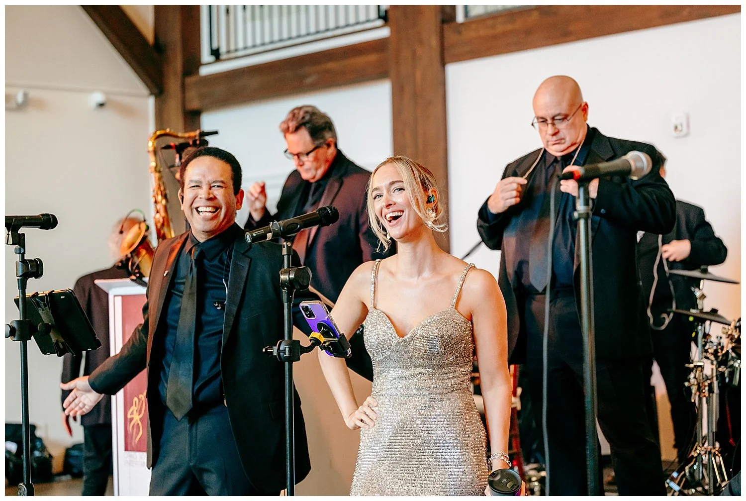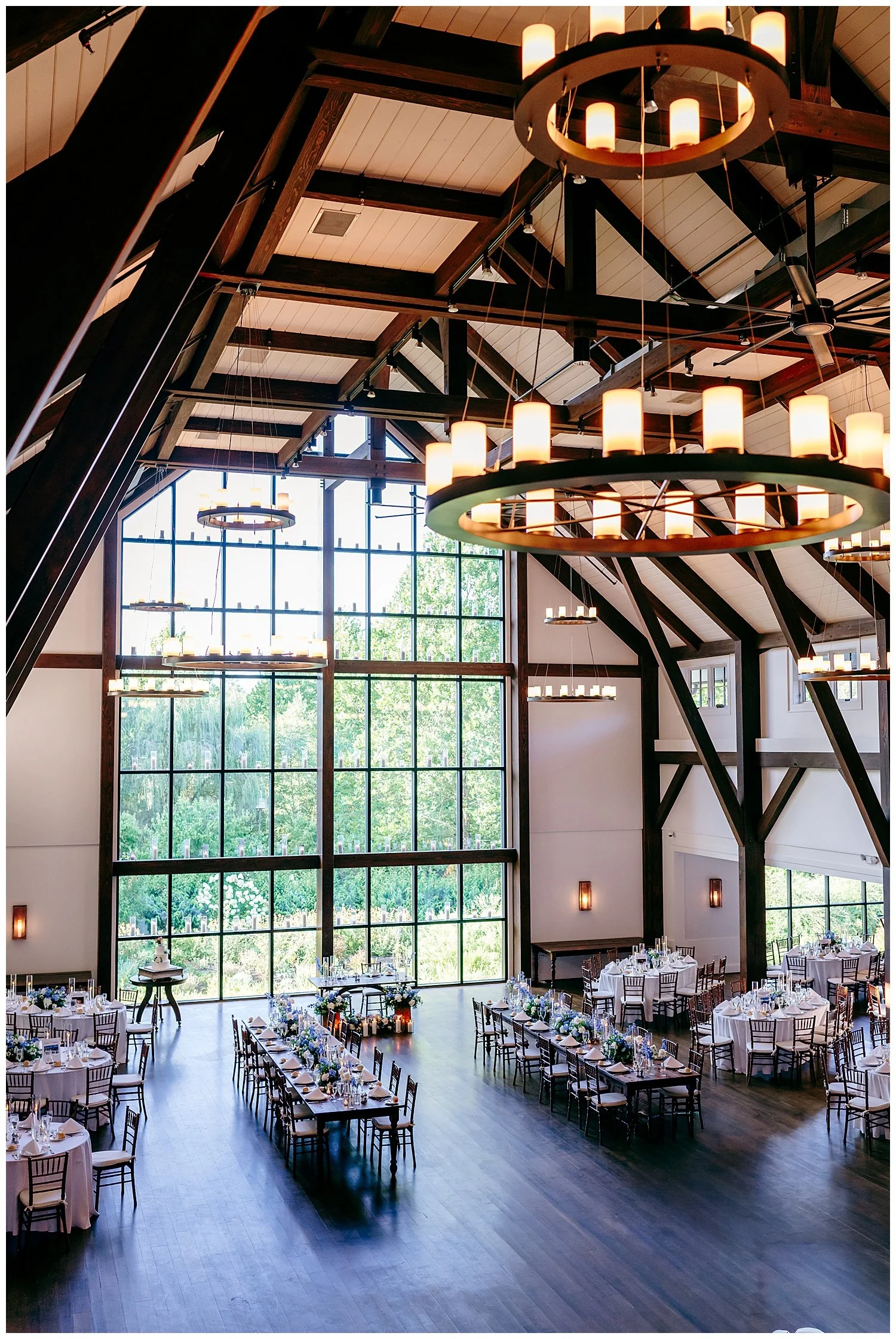 The reception space features farm tables, exposed beams, and soaring ceilings, giving couples a backdrop that feels both grand and cozy.