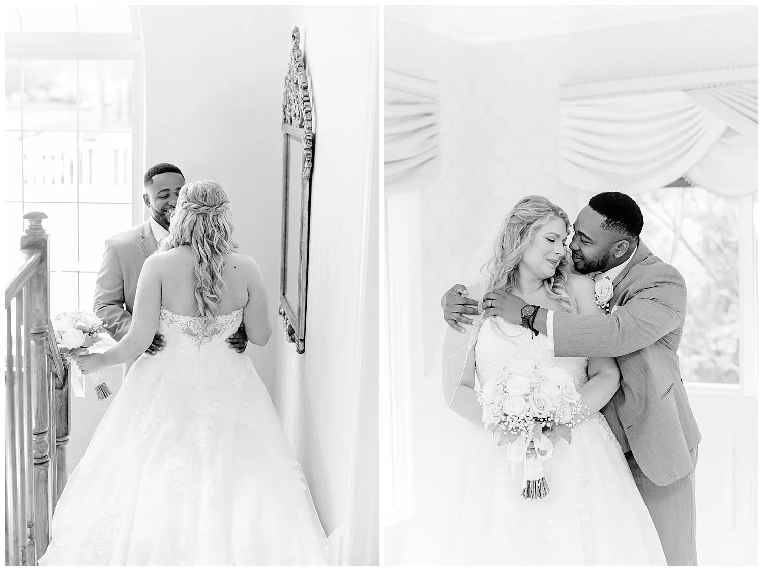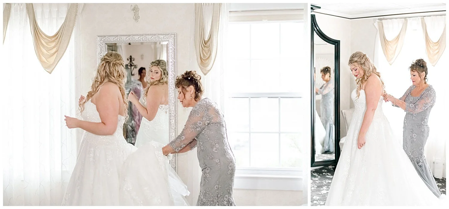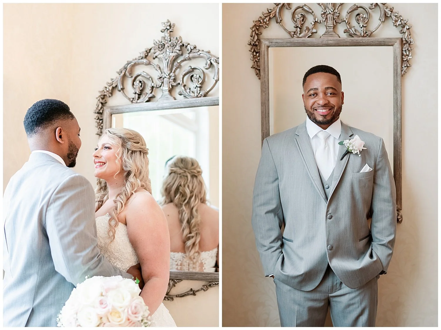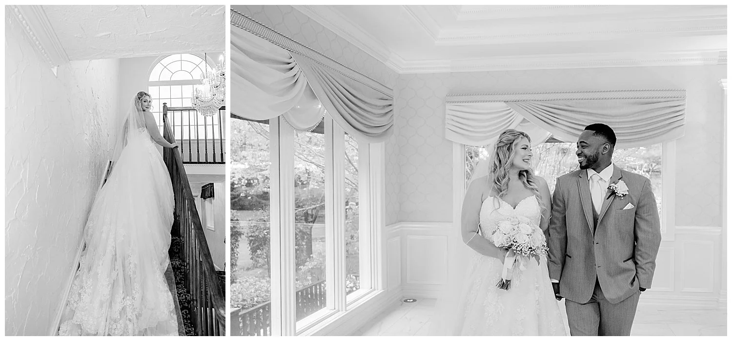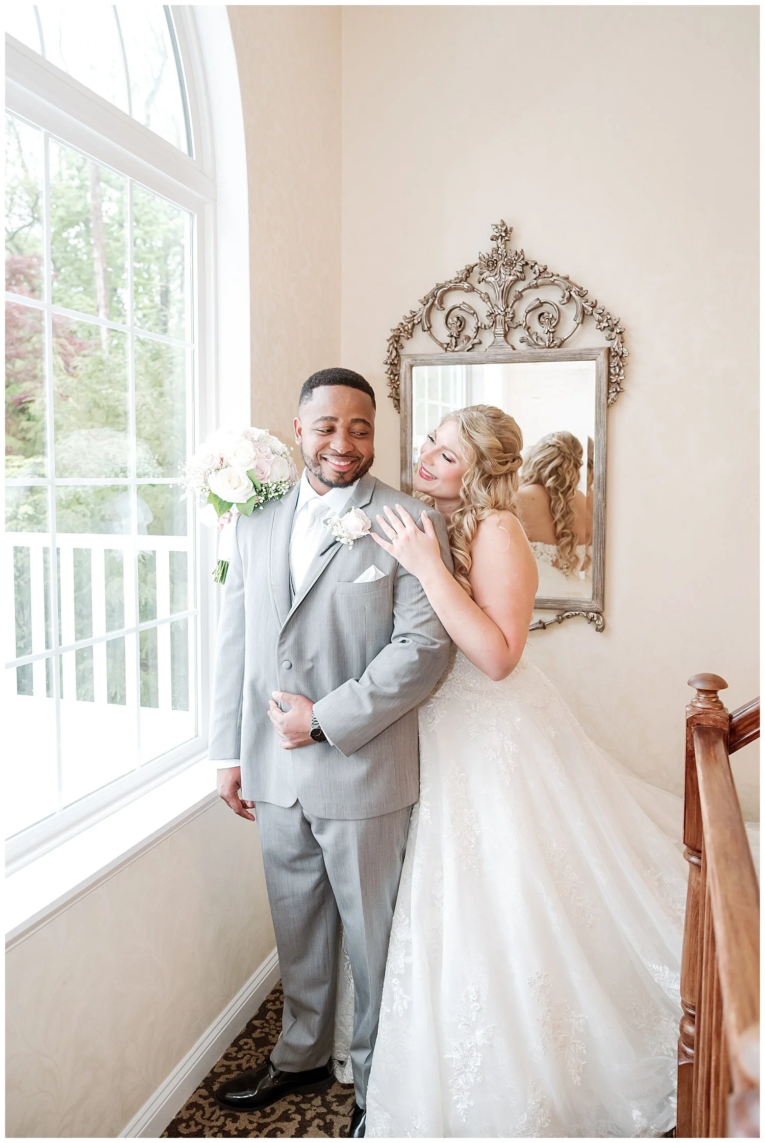 When you are stuck inside on a wedding day, I knew that I had to really come up with some unique and special portraits. Thankfully, the English Manor had a little landing with a full wall window and tucked into the corner a beautiful gold mirror. I knew that place would be my favorite. We found so many little places to create their perfect portraits.
