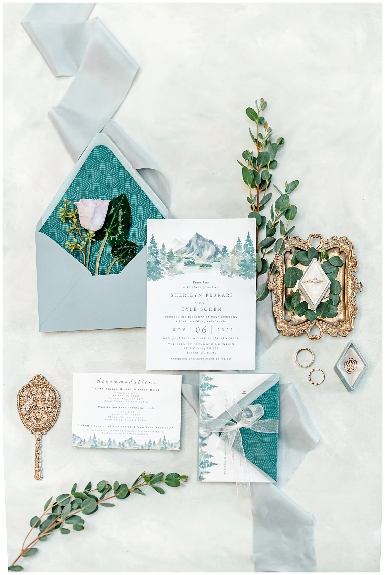 Sheri and Kyle love to hike the mountains! So when they showed me their gorgeous wedding invitation suite, I was just thrilled to create a beautiful flat lay to really bring out the pretty colors!