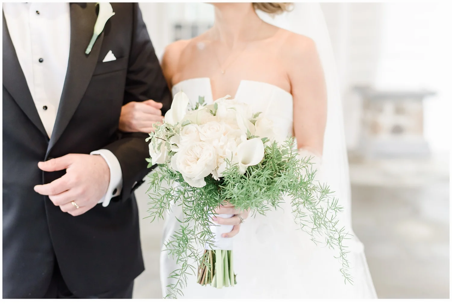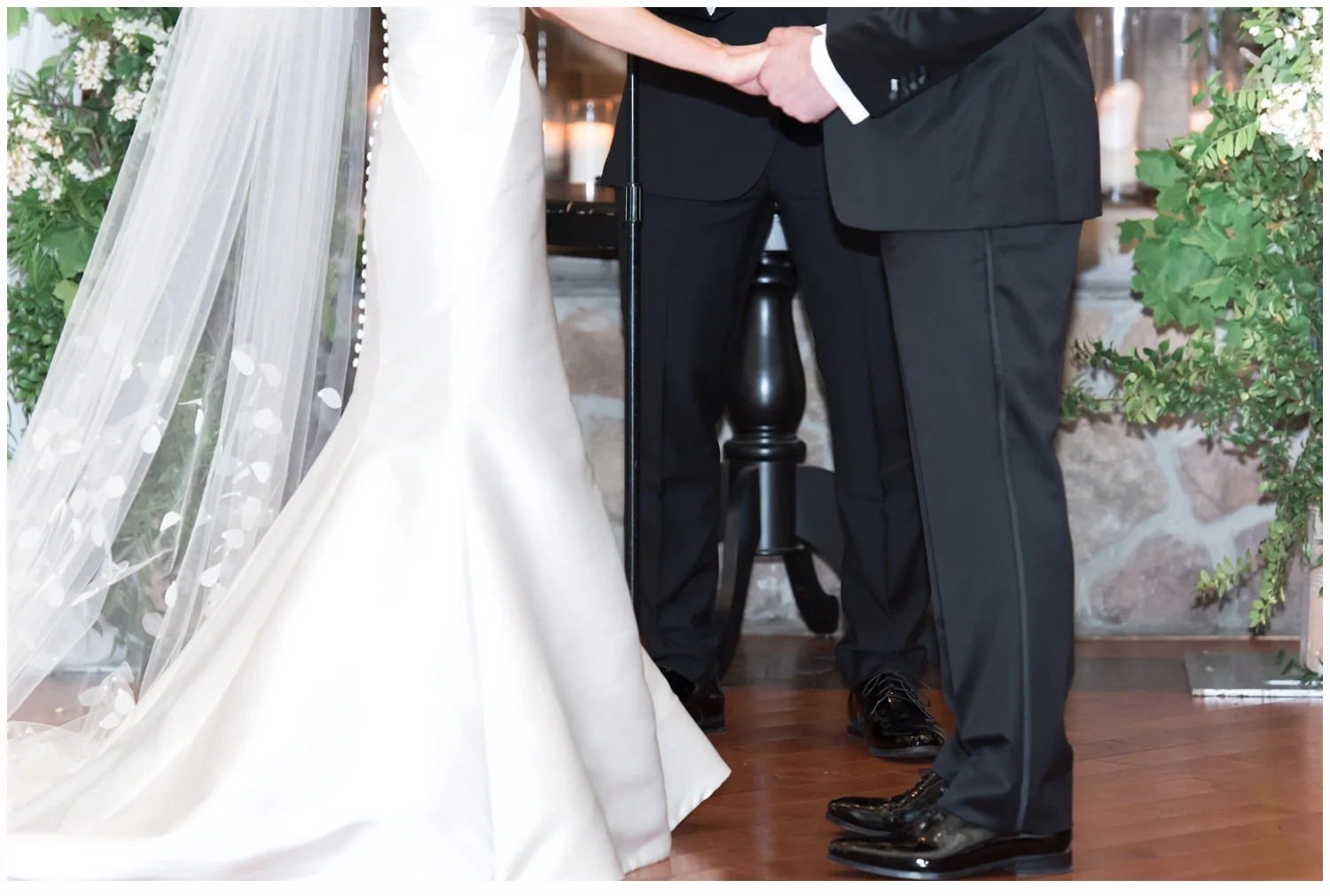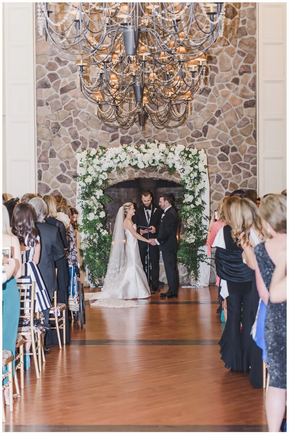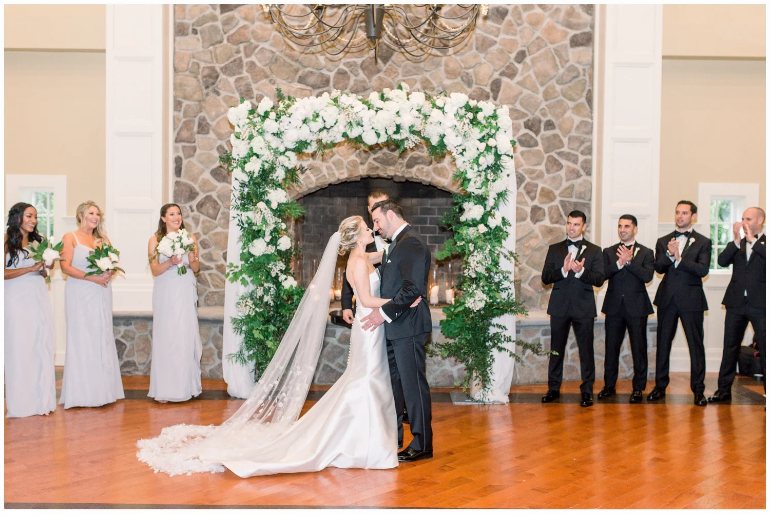 The plan was to have the ceremony in the outside courtyard at the Ryland Inn, but due to rain, they had to move it inside. It was lovely as they stood under a gorgeous arbor filled with pretty white flowers and became man and wife.