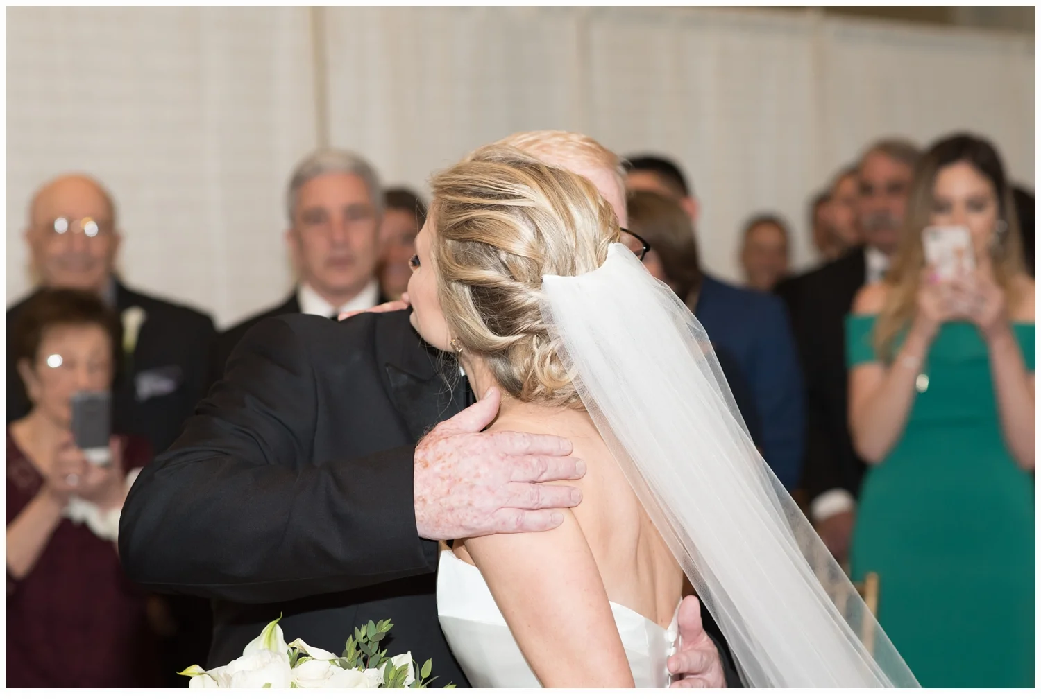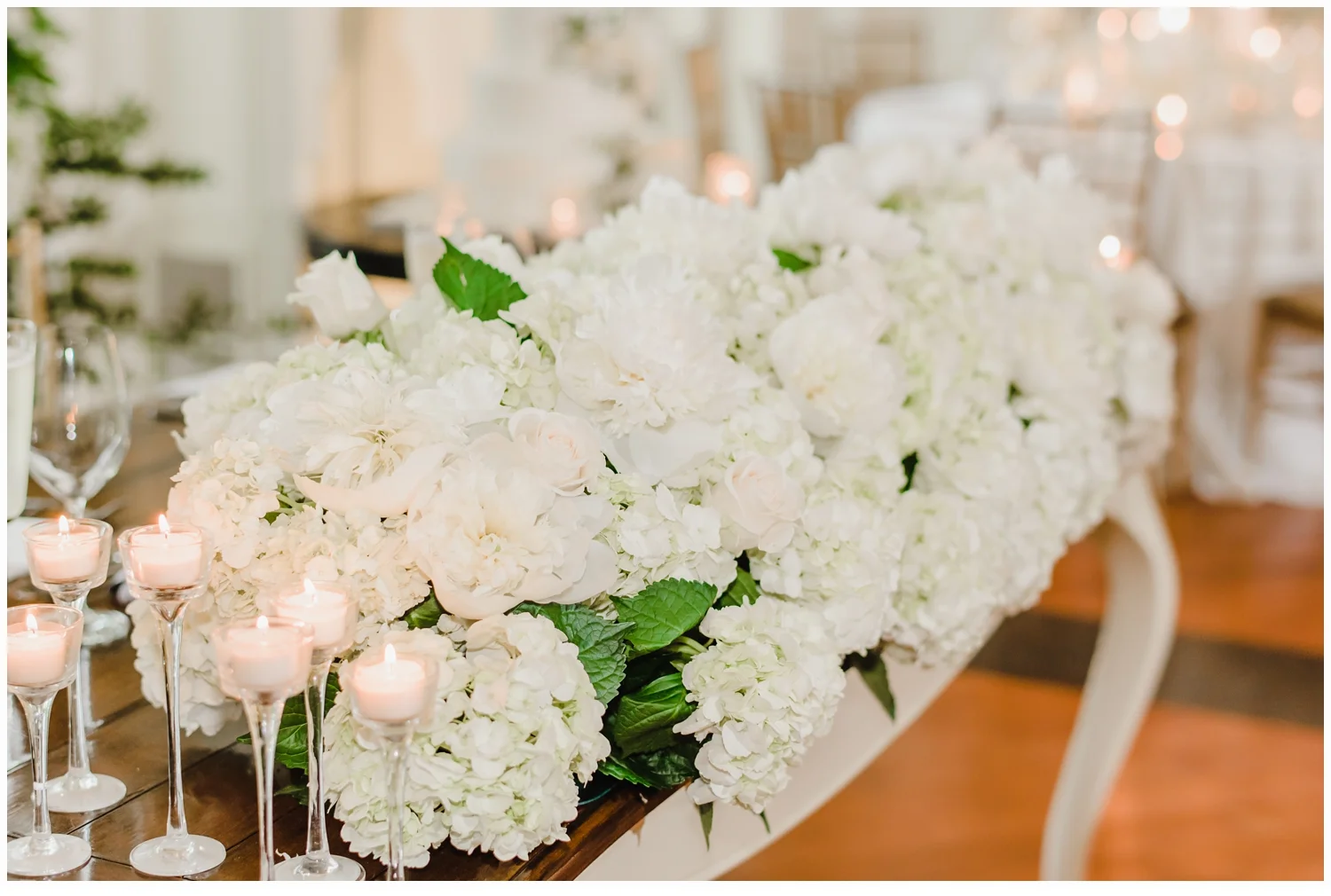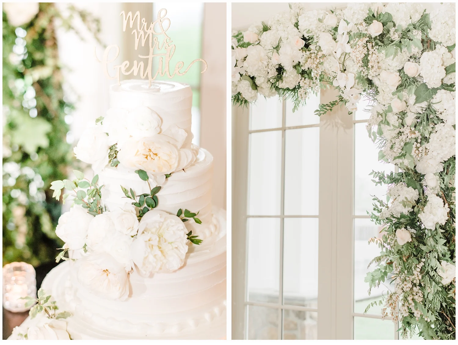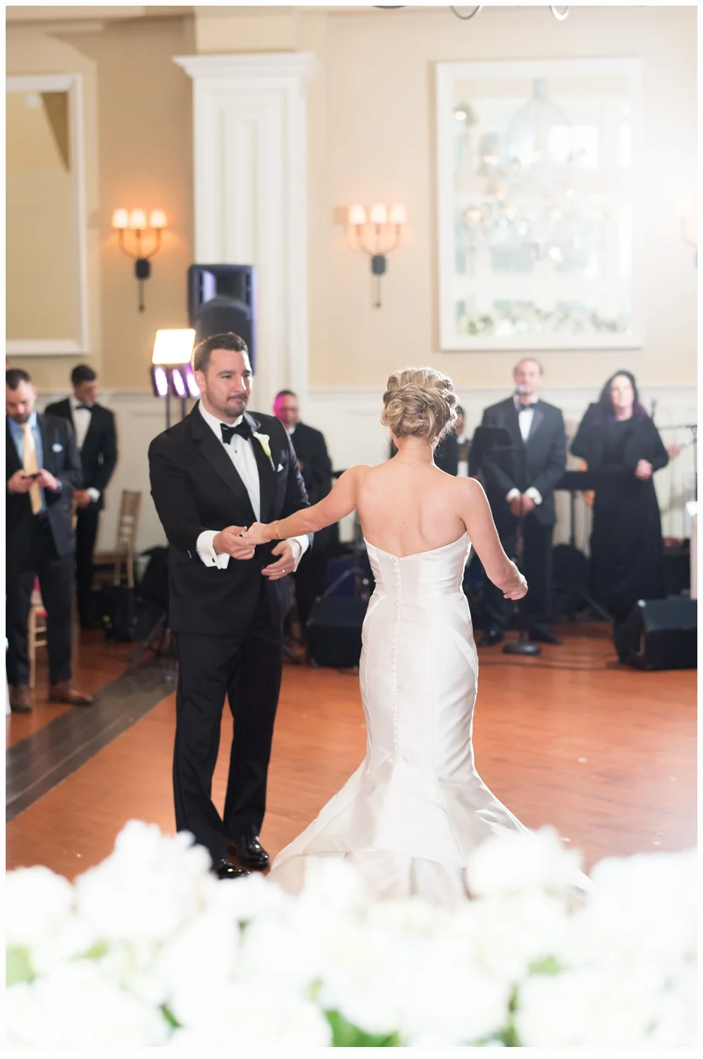 The plan was to have the ceremony in the outside courtyard at the Ryland Inn, but due to rain, they had to move it inside. It was lovely as they stood under a gorgeous arbor filled with pretty white flowers and became man and wife.